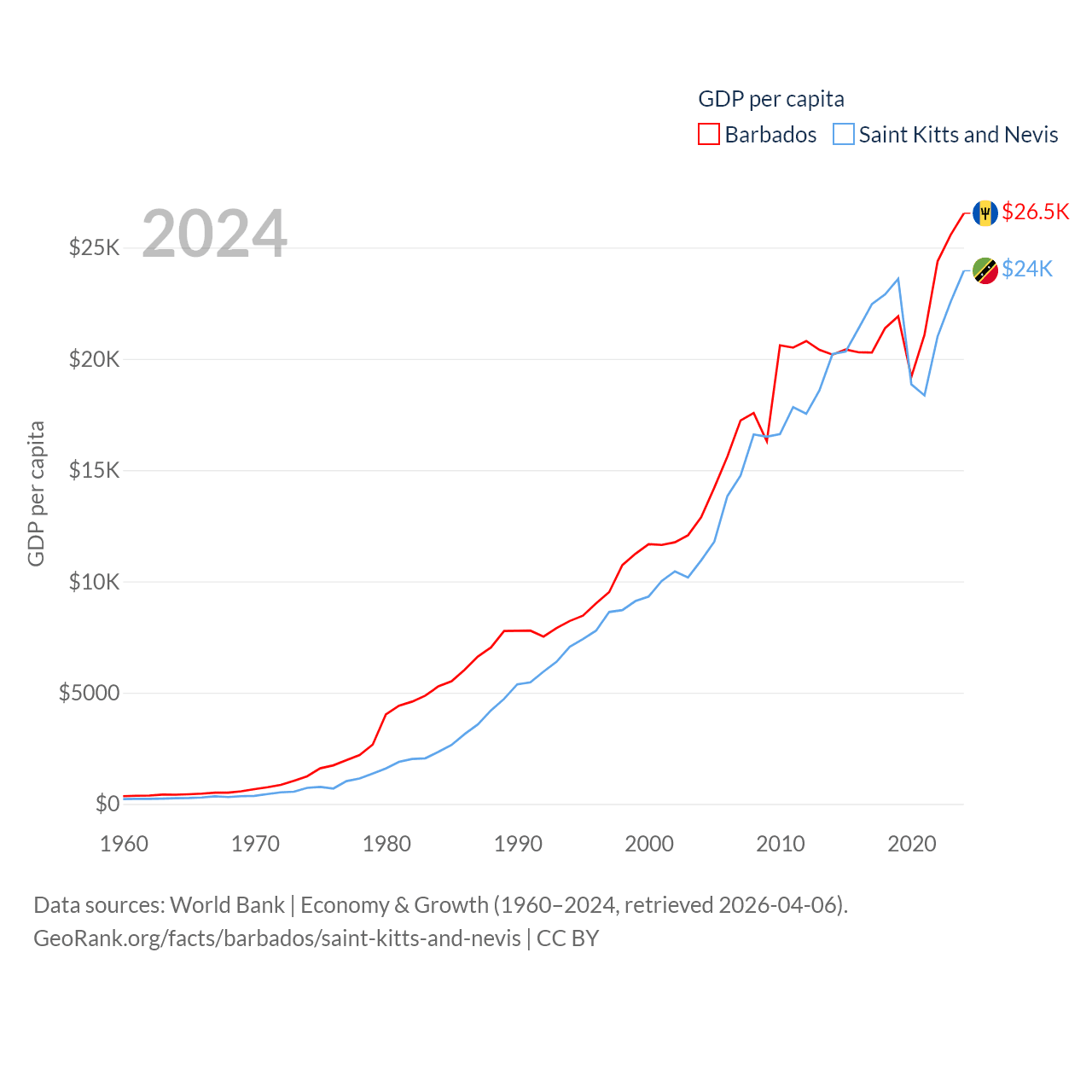 By GDP, Barbados ranks 157/197 ($7.5B) and Saint Kitts and Nevis ranks 187/197 ($1.12B). By GDP per capita, Barbados ranks 46/197 ($26,545), while Saint Kitts and Nevis ranks 51/197 ($23,961).