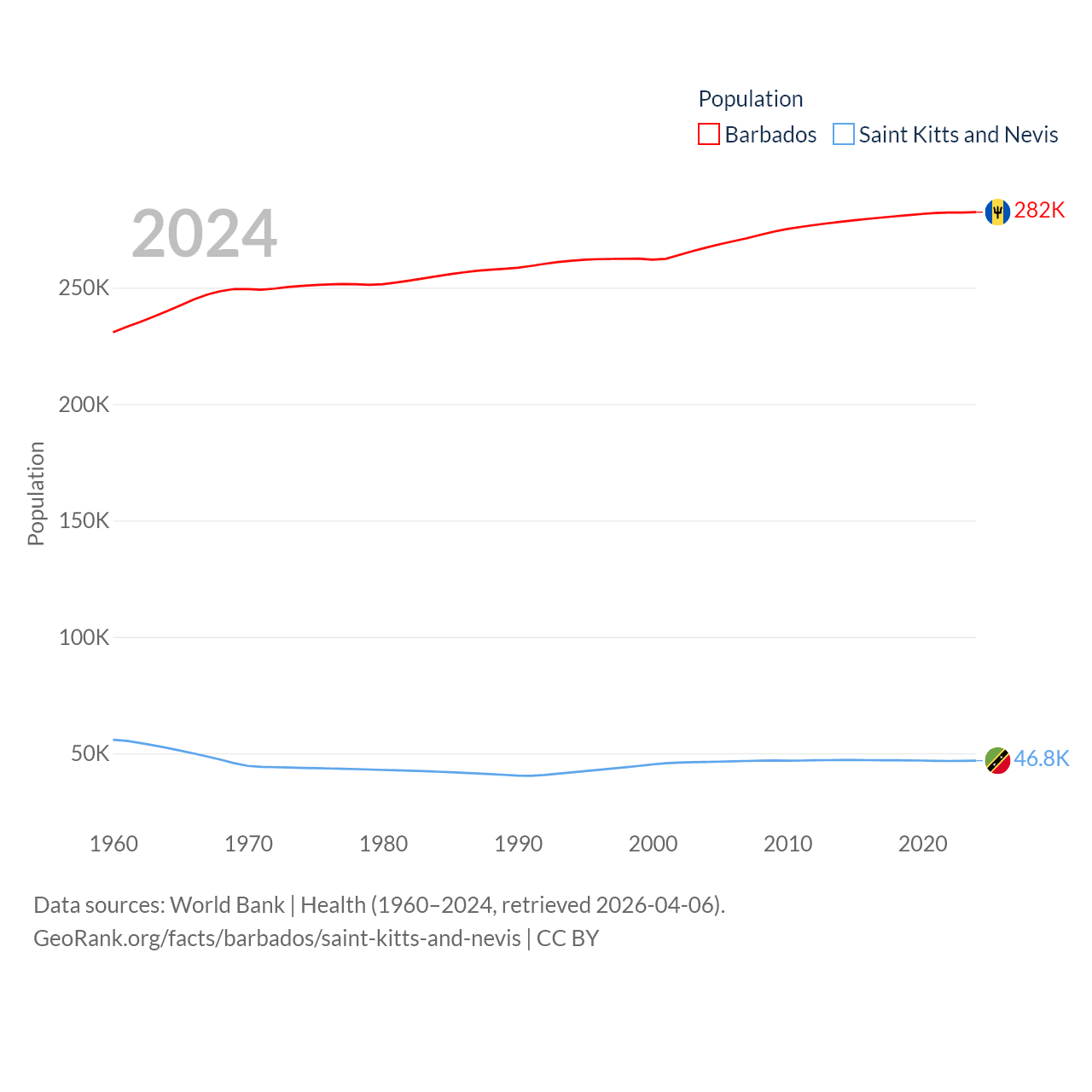Barbados has a population of 282K (ranked 175/197), compared with 46.8K in Saint Kitts and Nevis (ranked 189/197). Barbados' land area is 166 sq mi versus 100.4 sq mi for Saint Kitts and Nevis (ranked 184th vs. 189th).