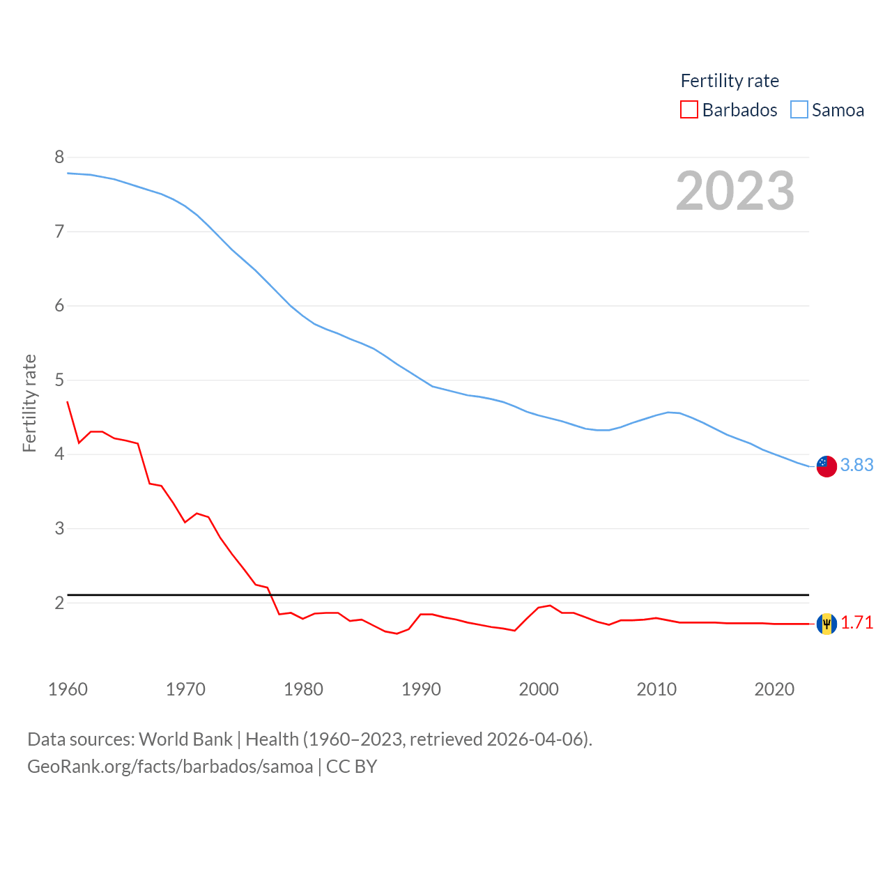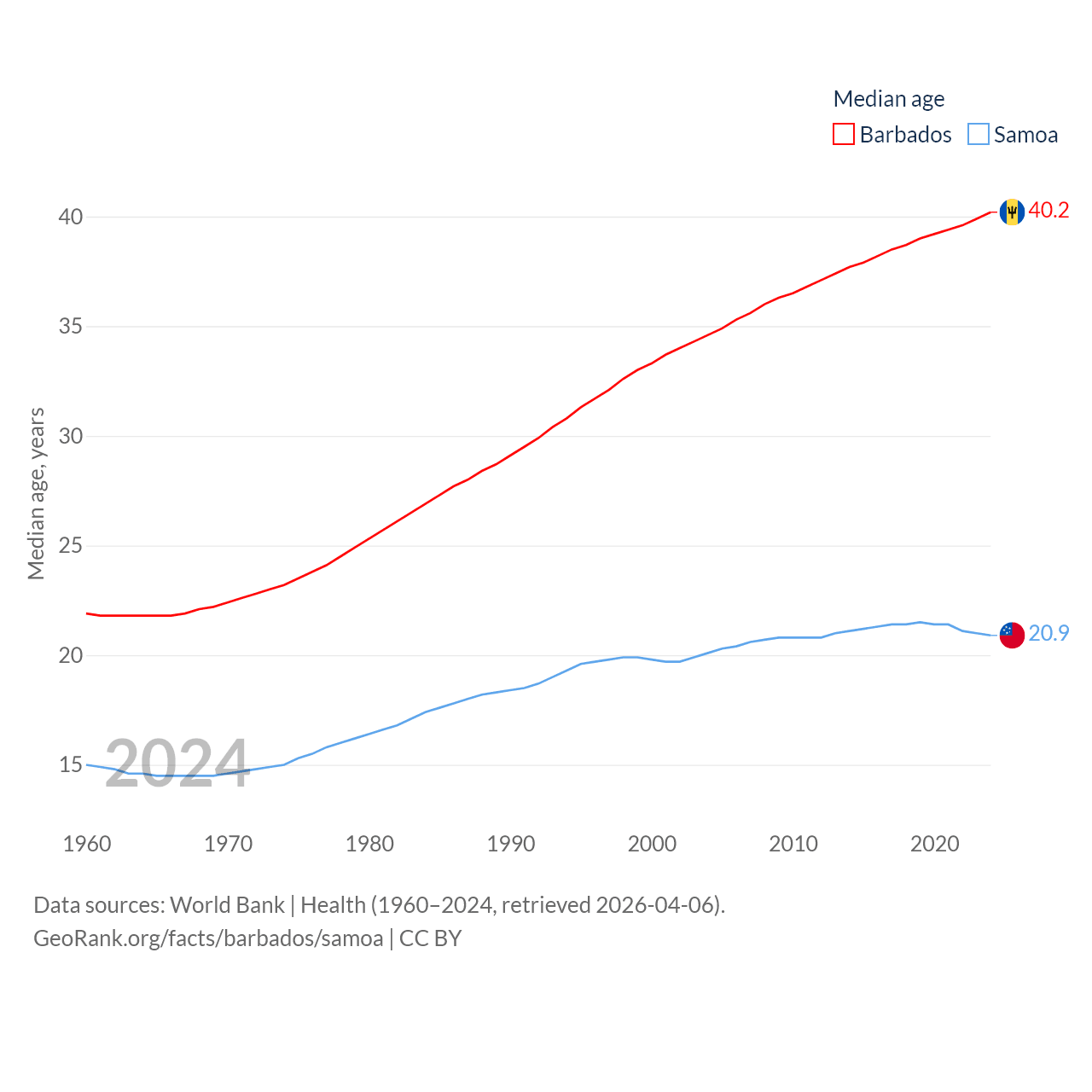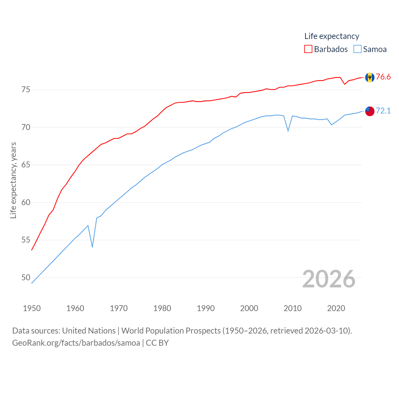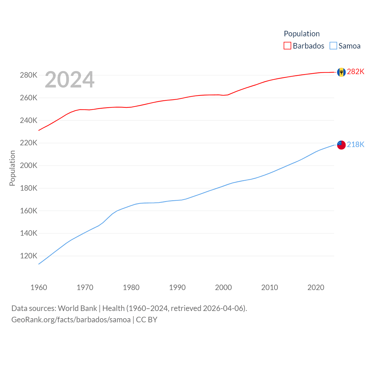 Barbados has a population of 282K (ranked 175/197), compared with 218K in Samoa (ranked 177/197). Barbados' land area is 166 sq mi versus 1,073 sq mi for Samoa (ranked 184th vs. 168th).