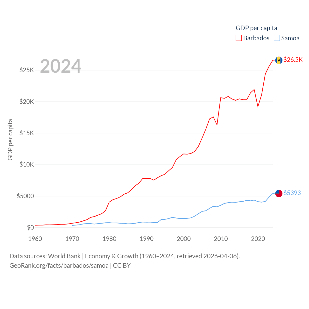By GDP, Barbados ranks 157/197 ($7.5B) and Samoa ranks 185/197 ($1.18B). By GDP per capita, Barbados ranks 46/197 ($26,545), while Samoa ranks 117/197 ($5,393).