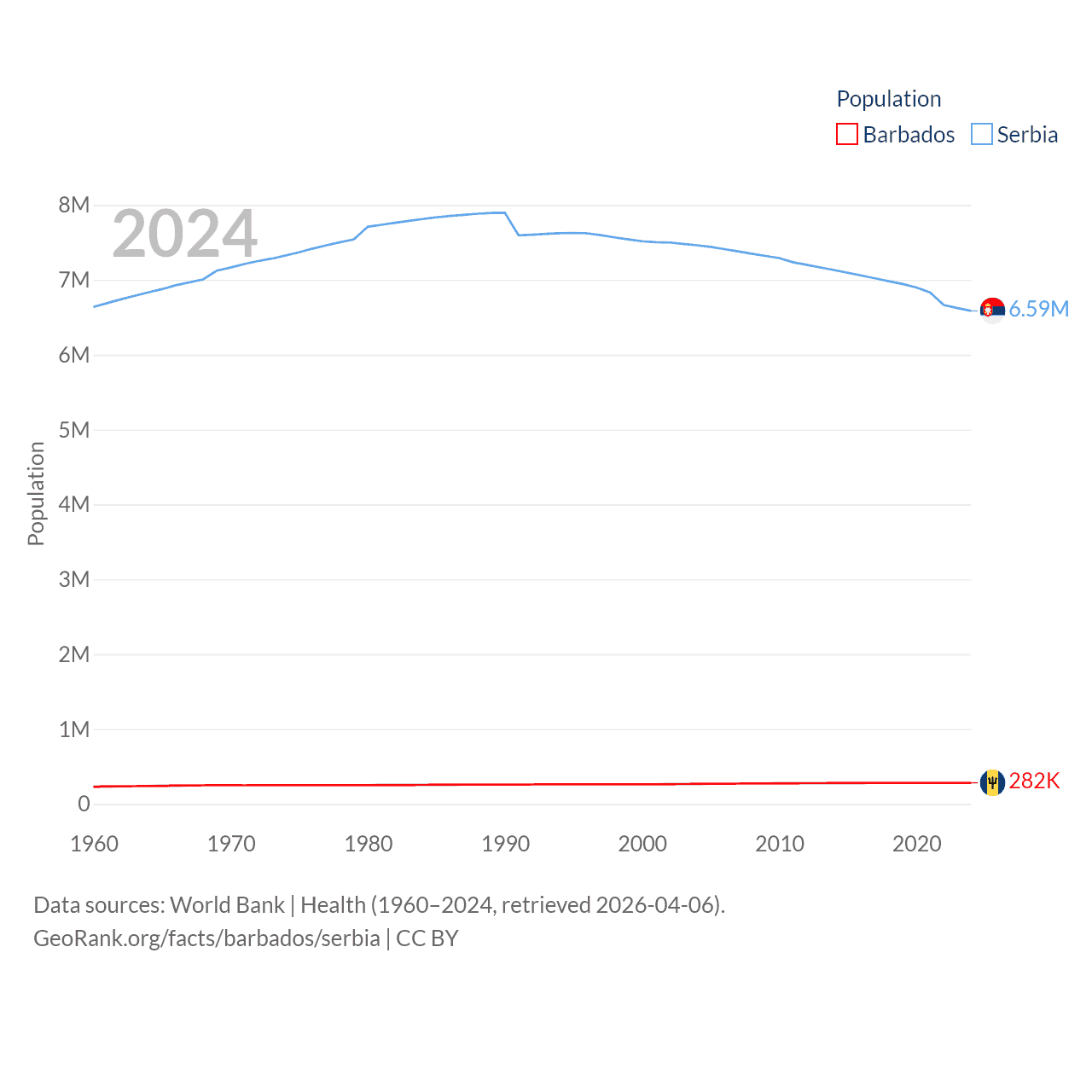 Barbados has a population of 282K (ranked 175/197), compared with 6.59M in Serbia (ranked 109/197). Barbados' land area is 166 sq mi versus 32,467 sq mi for Serbia (ranked 184th vs. 111th).