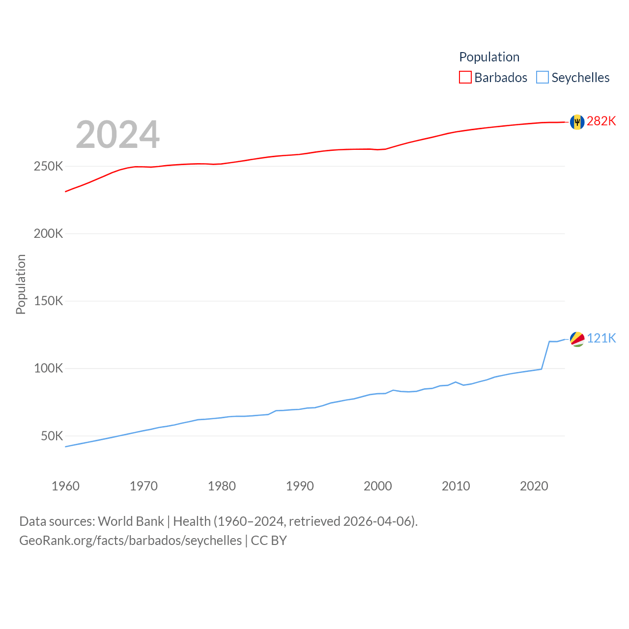 Barbados has a population of 282K (ranked 175/197), compared with 121K in The Seychelles (ranked 181/197). Barbados' land area is 166 sq mi versus 177.6 sq mi for The Seychelles (ranked 184th vs. 181st).
