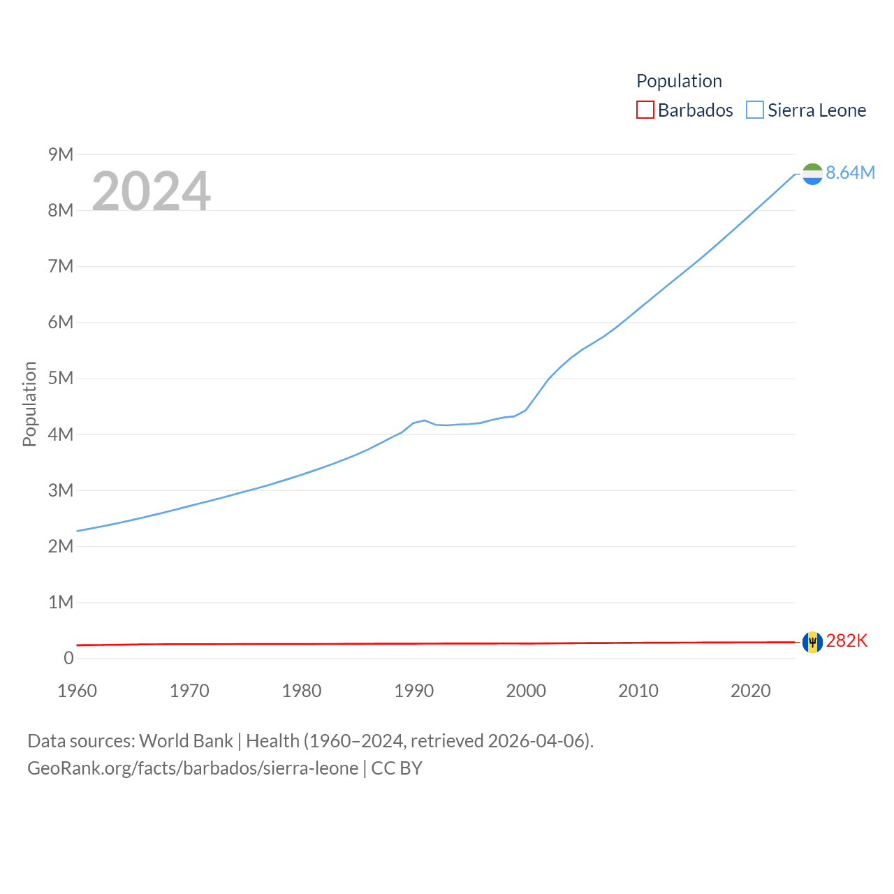 Barbados has a population of 282K (ranked 175/197), compared with 8.64M in Sierra Leone (ranked 102/197). Barbados' land area is 166 sq mi versus 27,869 sq mi for Sierra Leone (ranked 184th vs. 116th).