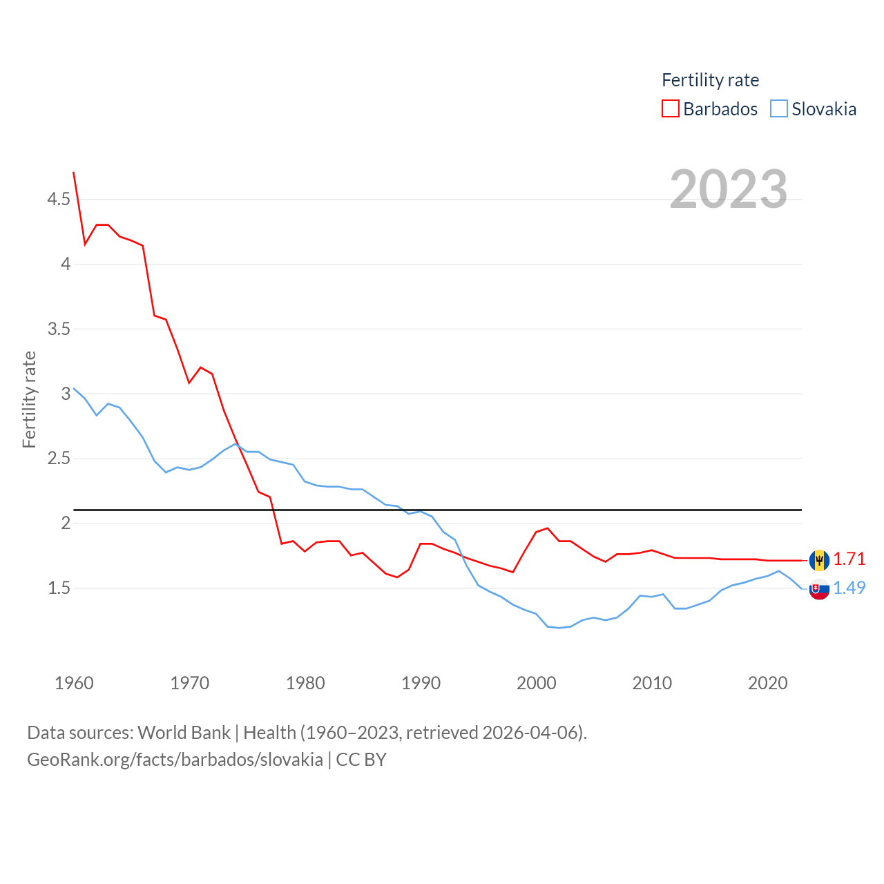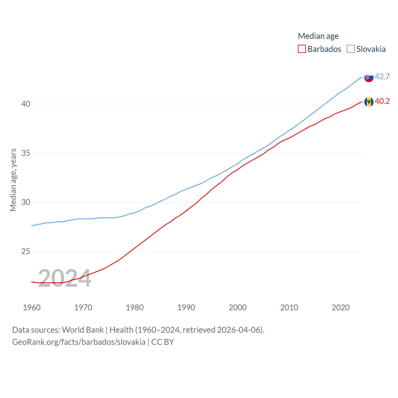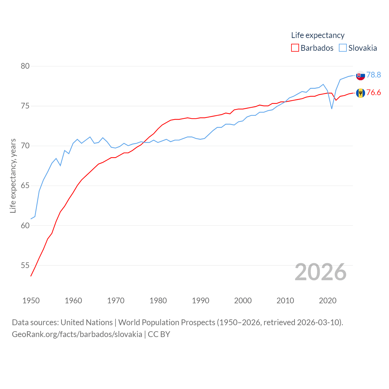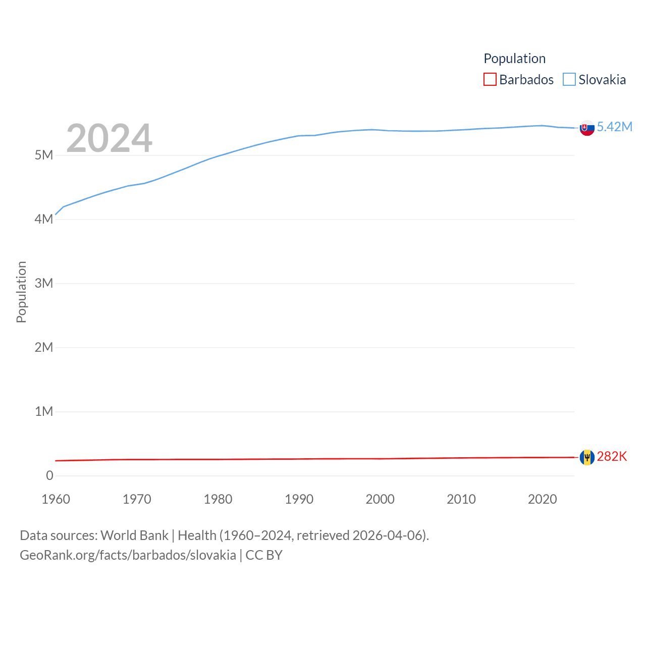 Barbados has a population of 282K (ranked 175/197), compared with 5.42M in Slovakia (ranked 119/197). Barbados' land area is 166 sq mi versus 18,564 sq mi for Slovakia (ranked 184th vs. 128th).