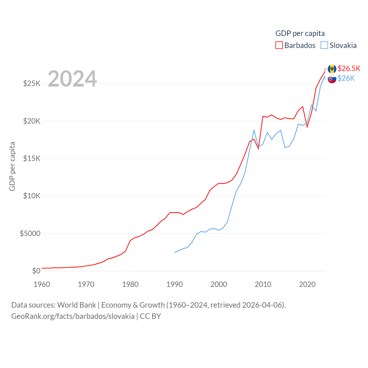 By GDP, Barbados ranks 157/197 ($7.5B) and Slovakia ranks 61/197 ($141B). By GDP per capita, Barbados ranks 46/197 ($26,545), while Slovakia ranks 47/197 ($25,993).
