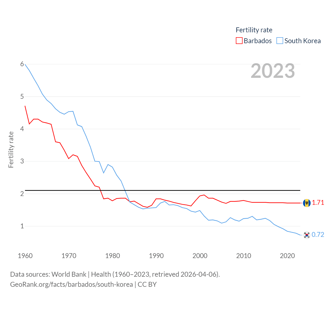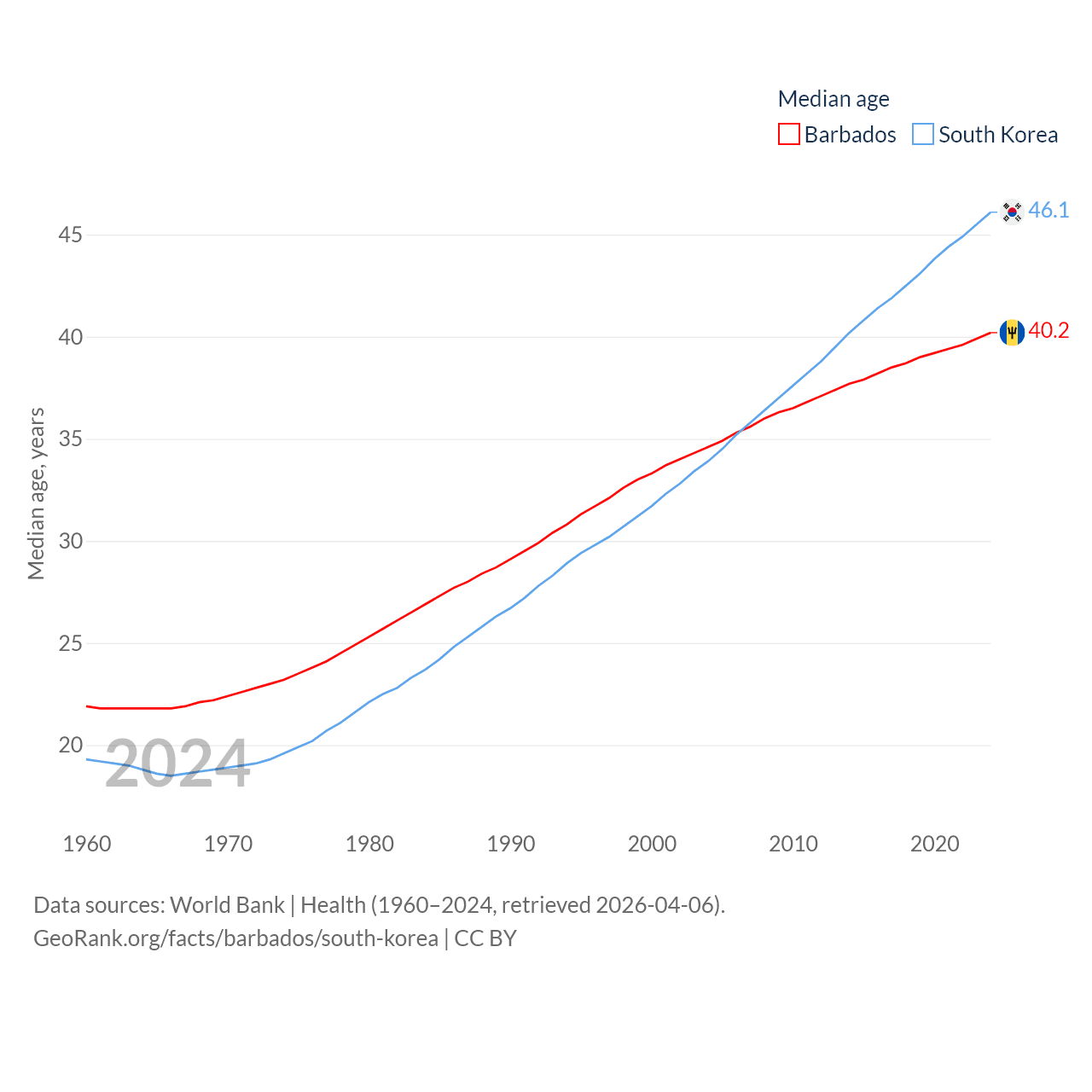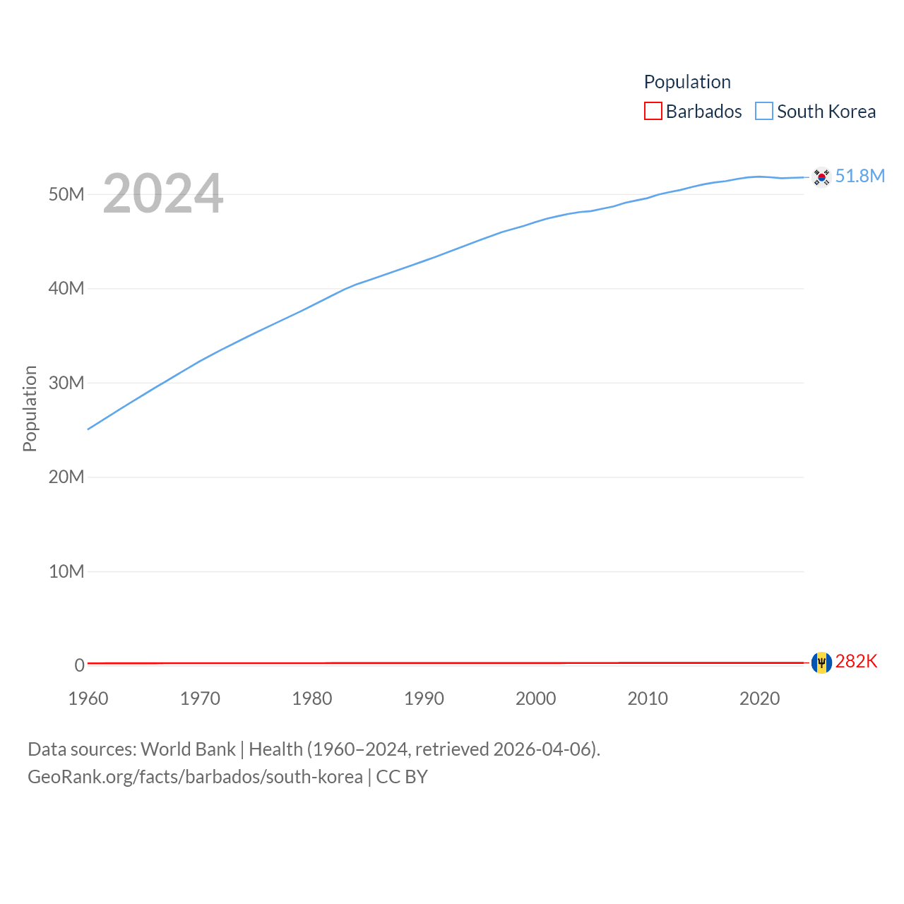 Barbados has a population of 282K (ranked 175/197), compared with 51.8M in South Korea (ranked 29/197). Barbados' land area is 166 sq mi versus 37,684 sq mi for South Korea (ranked 184th vs. 105th).