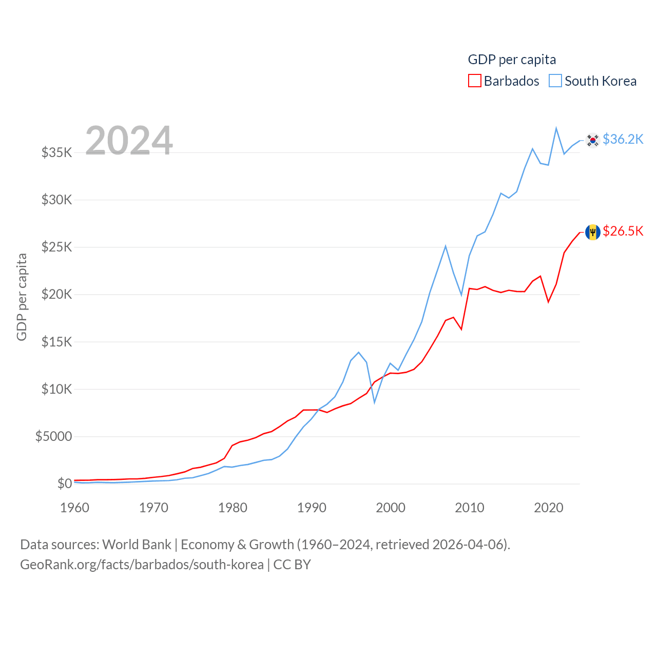 By GDP, Barbados ranks 157/197 ($7.5B) and South Korea ranks 12/197 ($1.88T). By GDP per capita, Barbados ranks 46/197 ($26,545), while South Korea ranks 31/197 ($36,239).