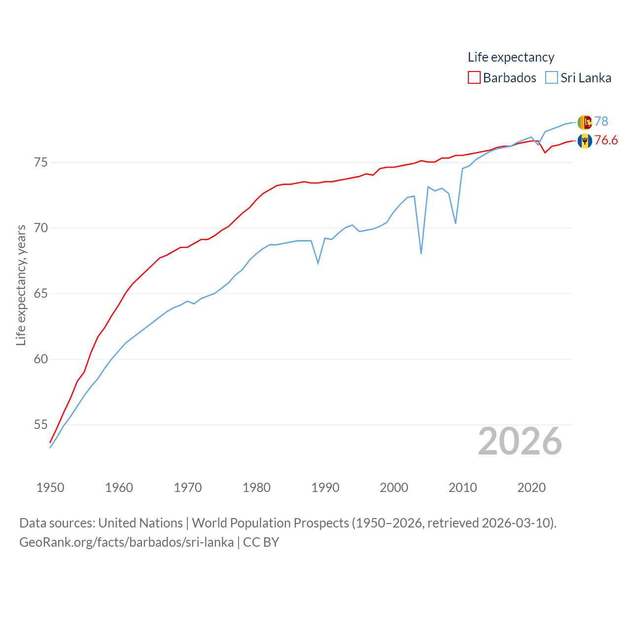 Barbados has a population of 282K (ranked 175/197), compared with 21.9M in Sri Lanka (ranked 61/197). Barbados' land area is 166 sq mi versus 23,884 sq mi for Sri Lanka (ranked 184th vs. 122nd).