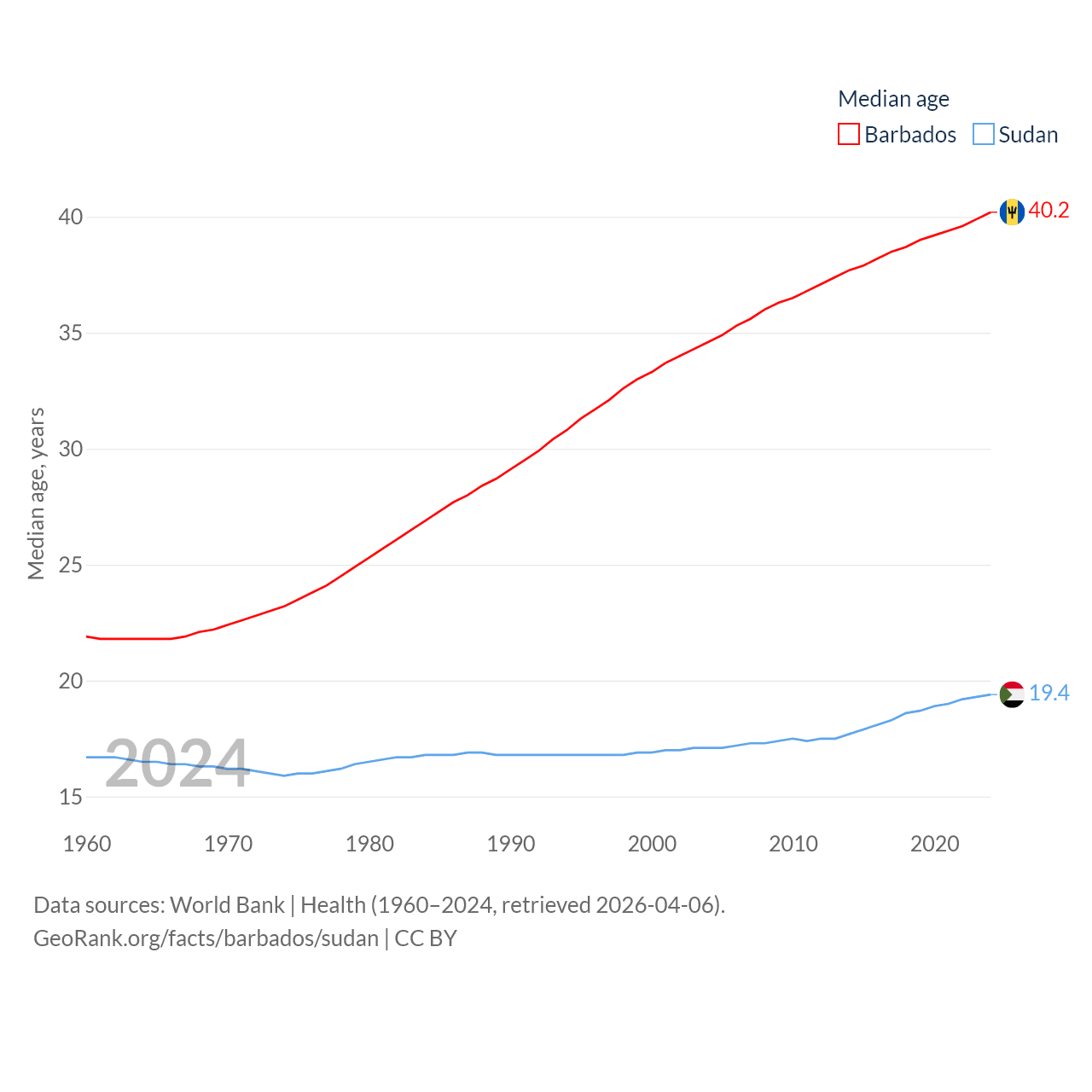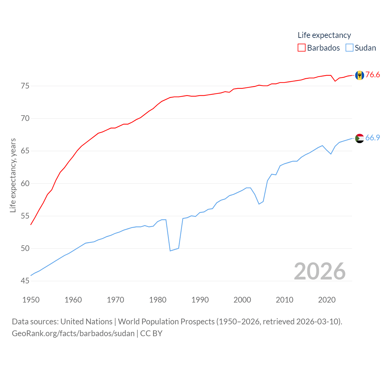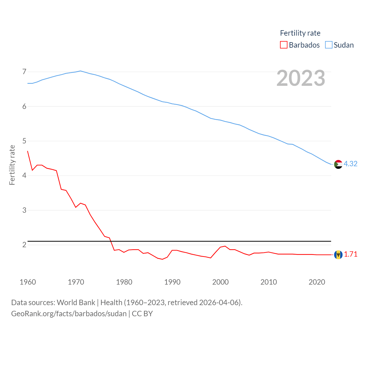 Barbados has a population of 282K (ranked 175/197), compared with 50.4M in Sudan (ranked 30/197). Barbados' land area is 166 sq mi versus 721,239 sq mi for Sudan (ranked 184th vs. 15th).