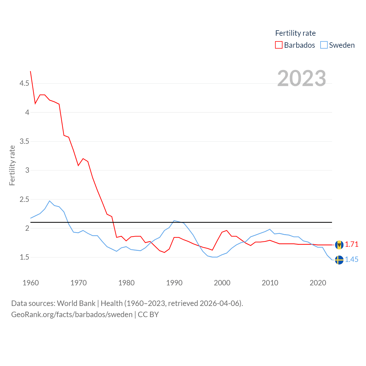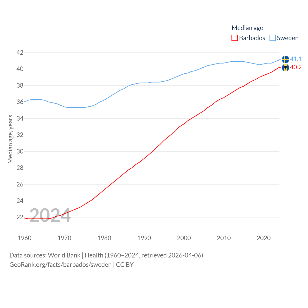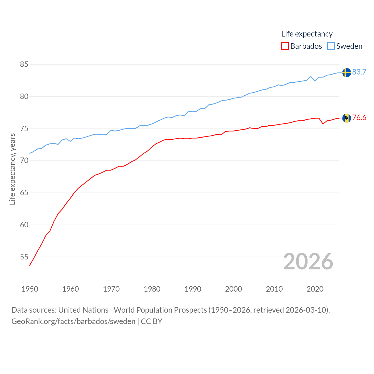 Barbados has a population of 282K (ranked 175/197), compared with 10.6M in Sweden (ranked 93/197). Barbados' land area is 166 sq mi versus 157,248 sq mi for Sweden (ranked 184th vs. 58th).