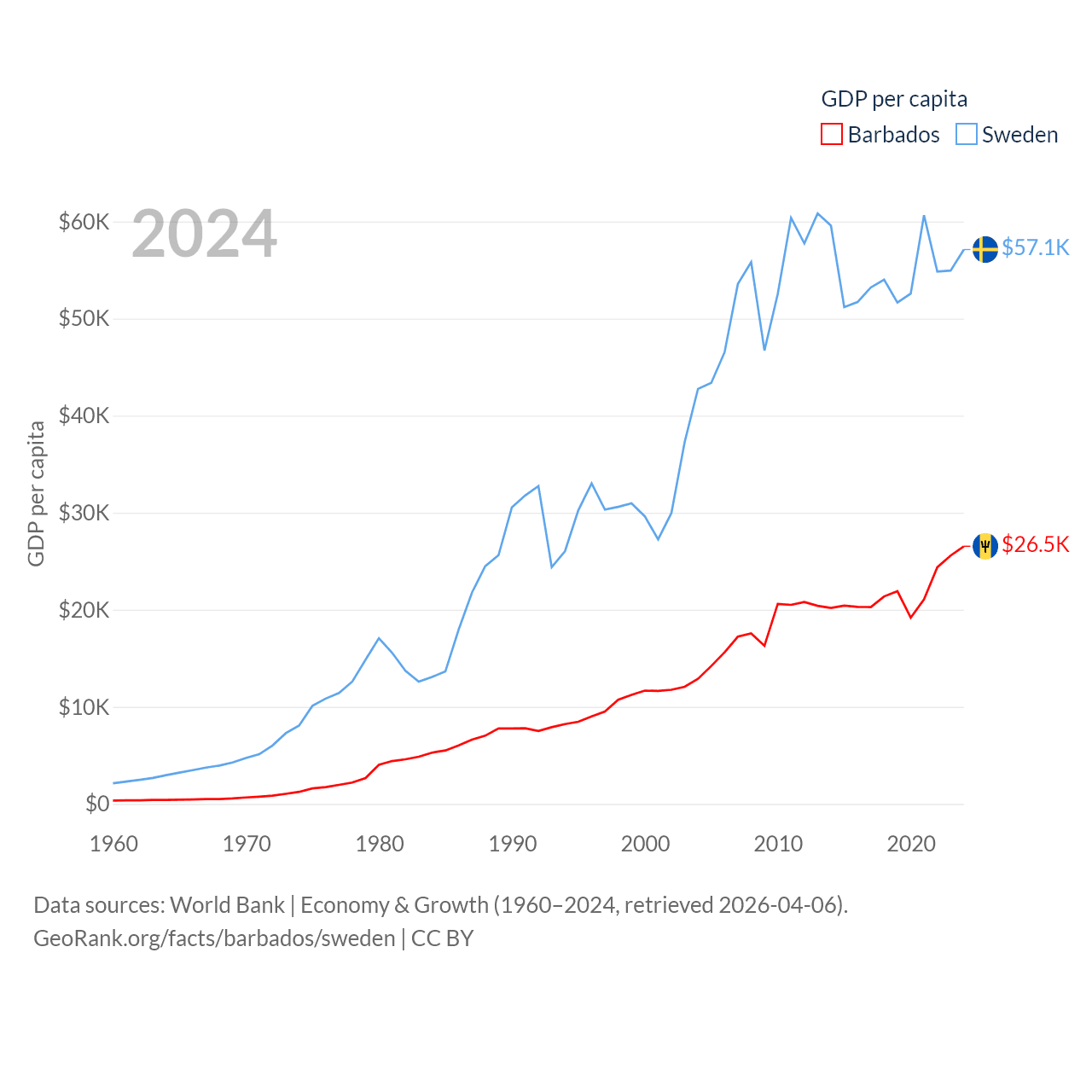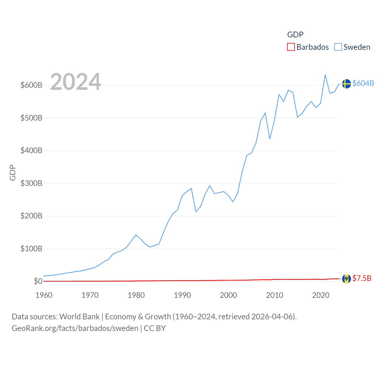 By GDP, Barbados ranks 157/197 ($7.5B) and Sweden ranks 26/197 ($604B). By GDP per capita, Barbados ranks 46/197 ($26,545), while Sweden ranks 17/197 ($57,117).