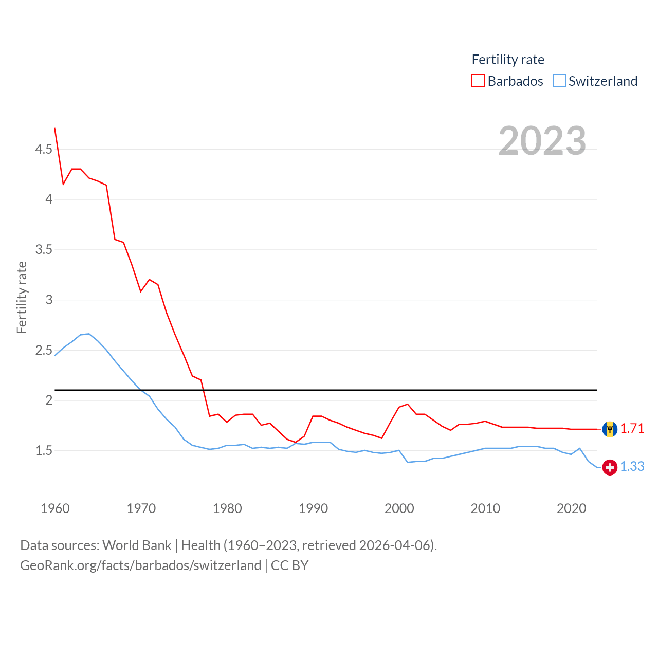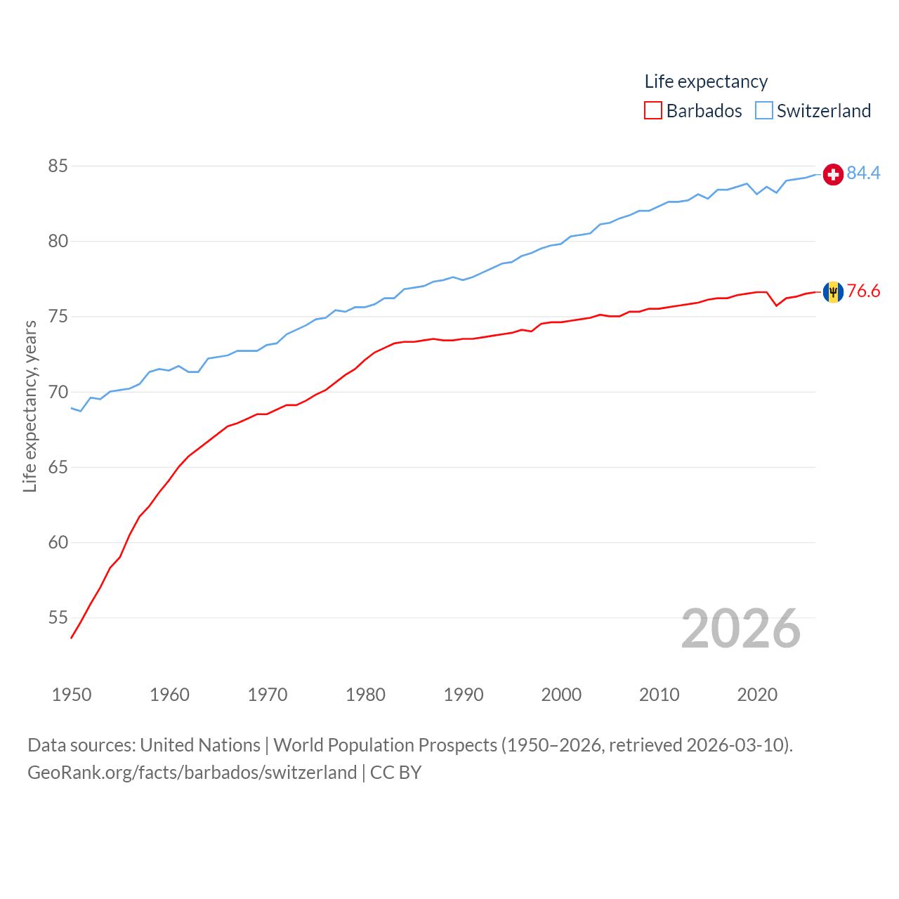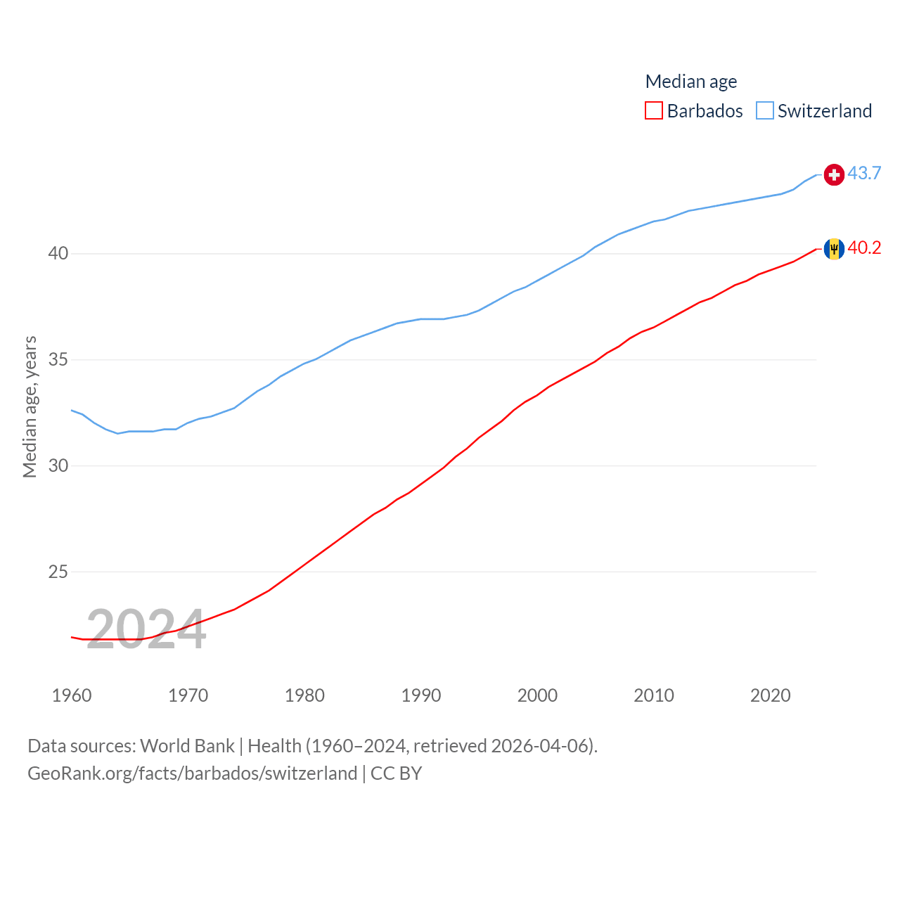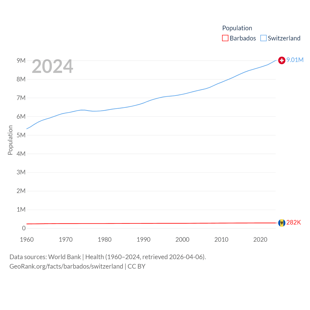 Barbados has a population of 282K (ranked 175/197), compared with 9.01M in Switzerland (ranked 101/197). Barbados' land area is 166 sq mi versus 15,255 sq mi for Switzerland (ranked 184th vs. 131st).