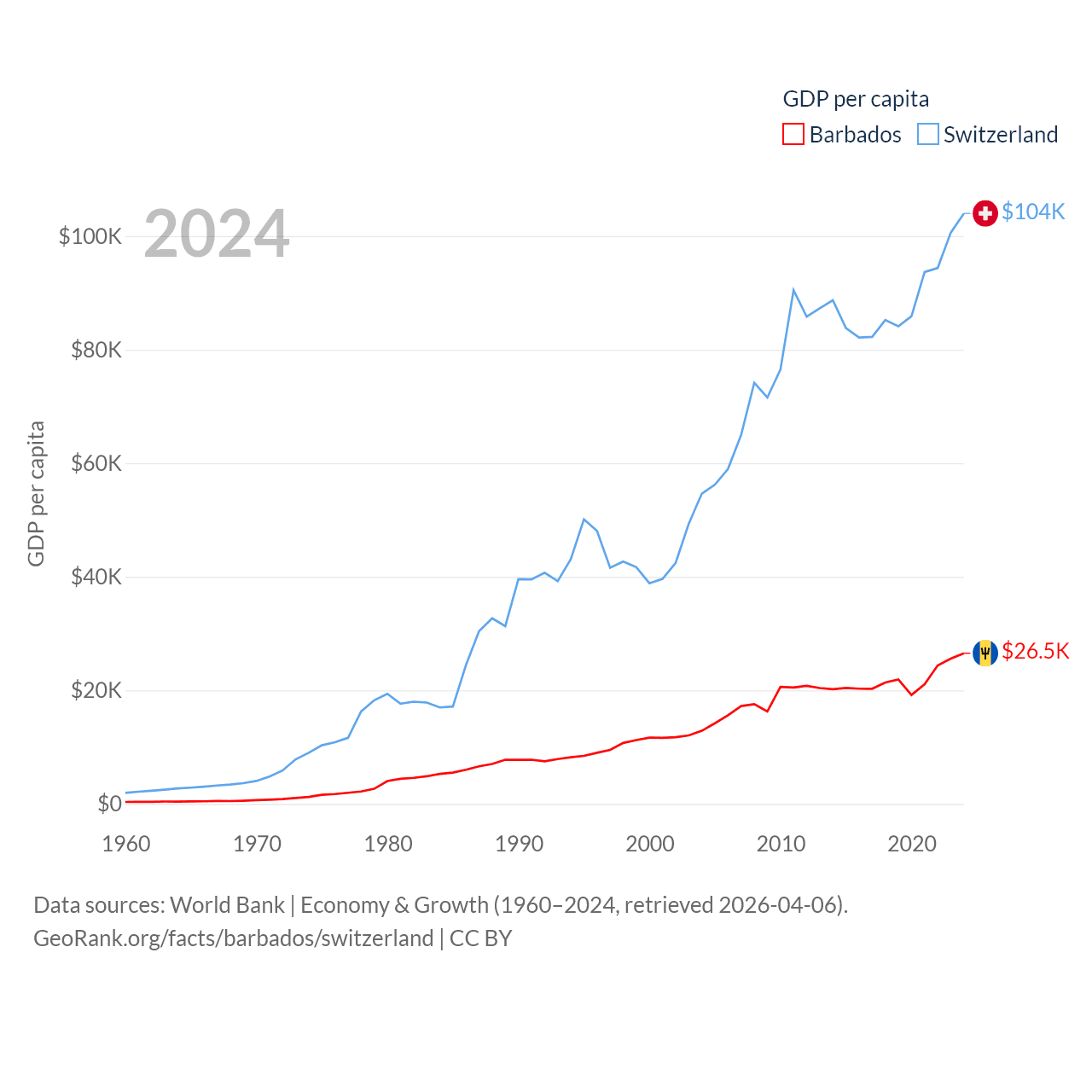 By GDP, Barbados ranks 157/197 ($7.5B) and Switzerland ranks 20/197 ($937B). By GDP per capita, Barbados ranks 46/197 ($26,545), while Switzerland ranks 5/197 ($103,998).