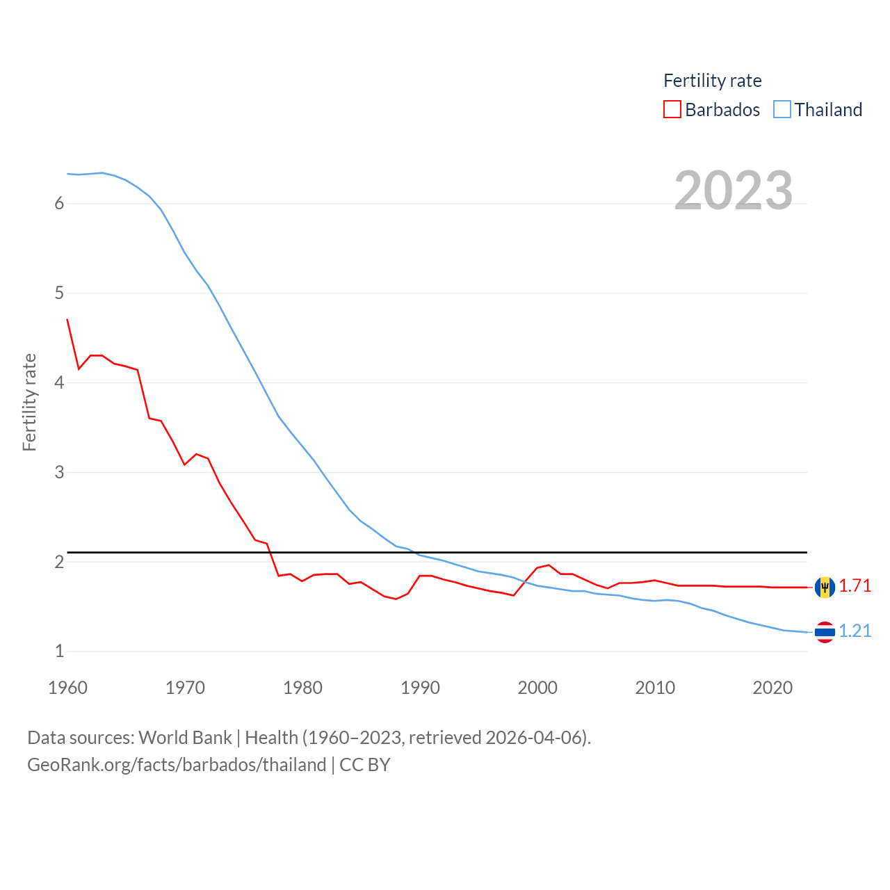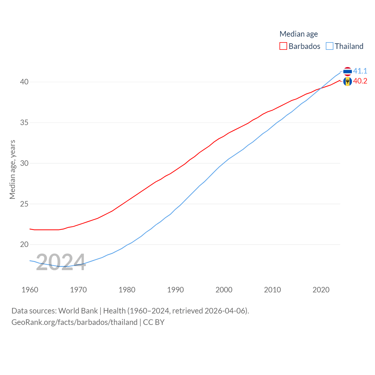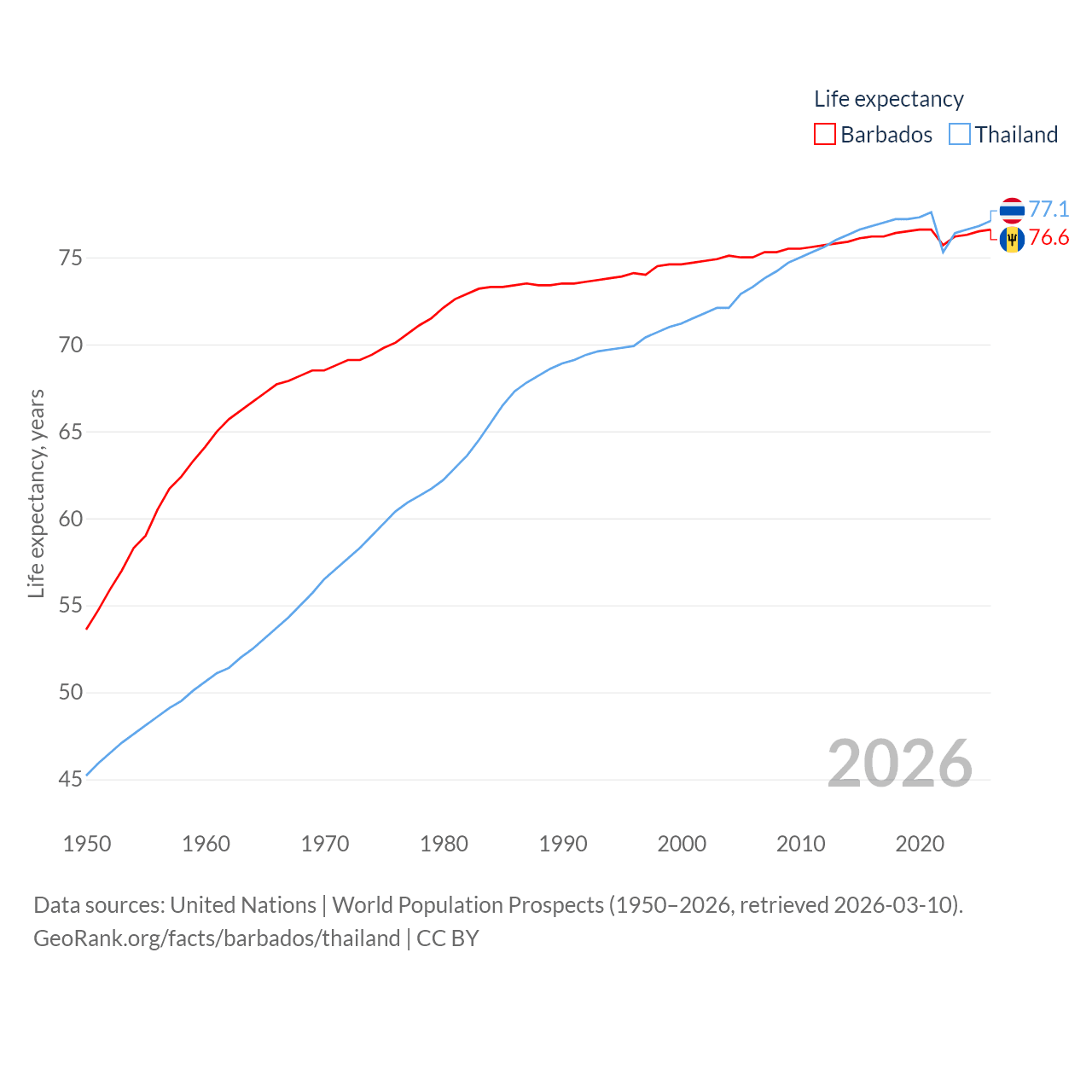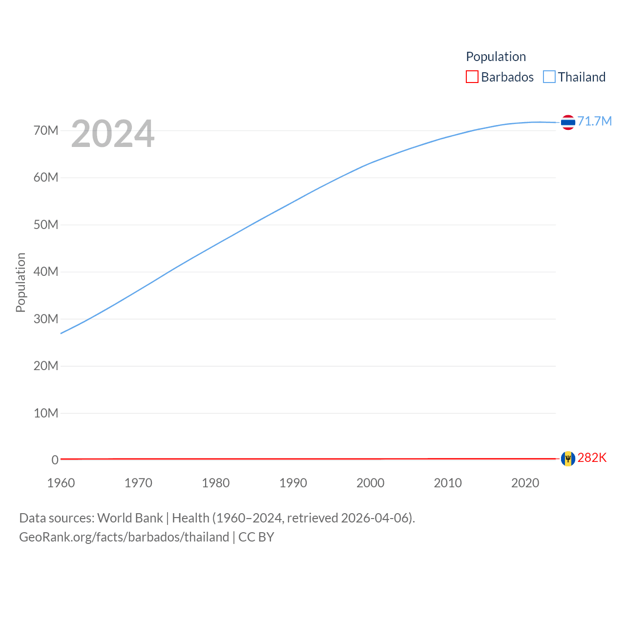 Barbados has a population of 282K (ranked 175/197), compared with 71.7M in Thailand (ranked 20/197). Barbados' land area is 166 sq mi versus 197,256 sq mi for Thailand (ranked 184th vs. 50th).