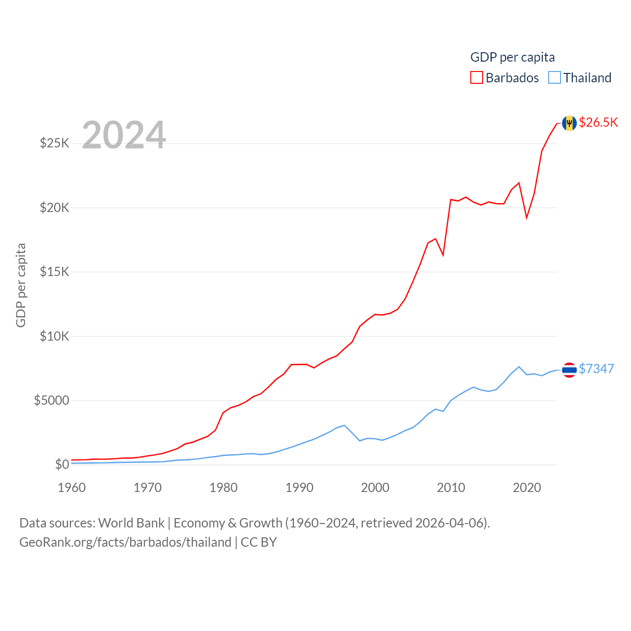 By GDP, Barbados ranks 157/197 ($7.5B) and Thailand ranks 31/197 ($527B). By GDP per capita, Barbados ranks 46/197 ($26,545), while Thailand ranks 100/197 ($7,347).