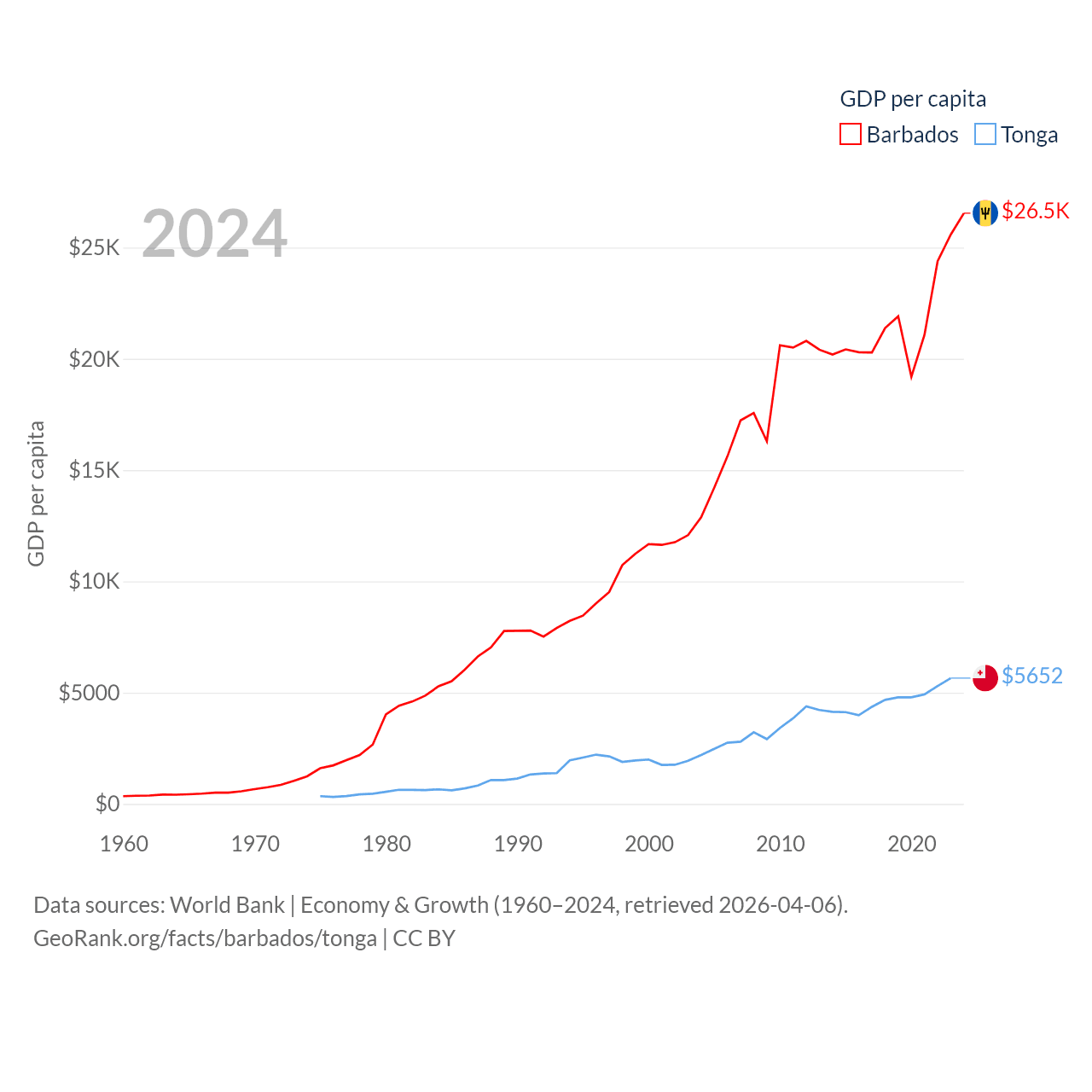 By GDP, Barbados ranks 157/197 ($7.5B) and Tonga ranks 191/197 ($591M). By GDP per capita, Barbados ranks 46/197 ($26,545), while Tonga ranks 115/197 ($5,652).