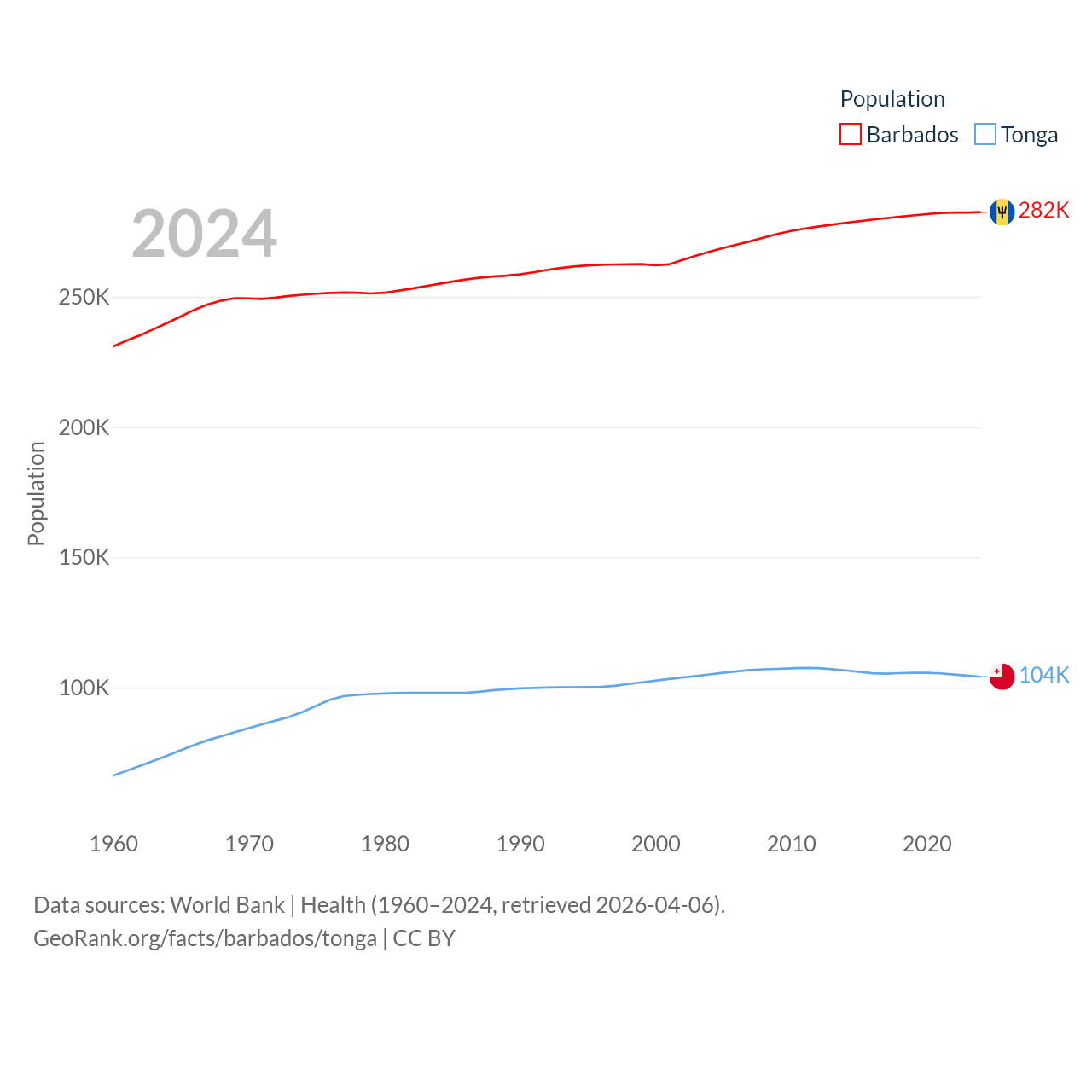 Barbados has a population of 282K (ranked 175/197), compared with 104K in Tonga (ranked 183/197). Barbados' land area is 166 sq mi versus 278 sq mi for Tonga (ranked 184th vs. 176th).