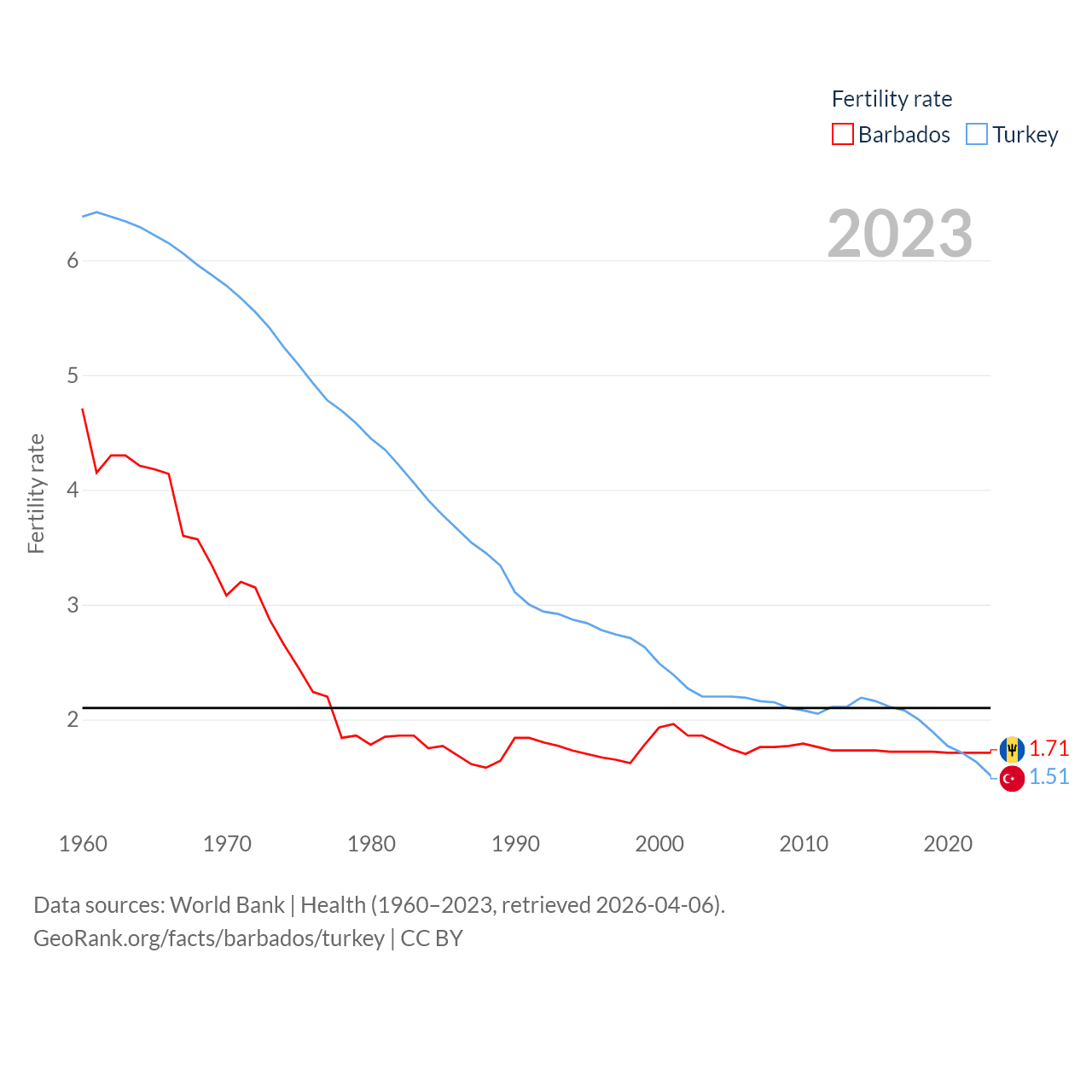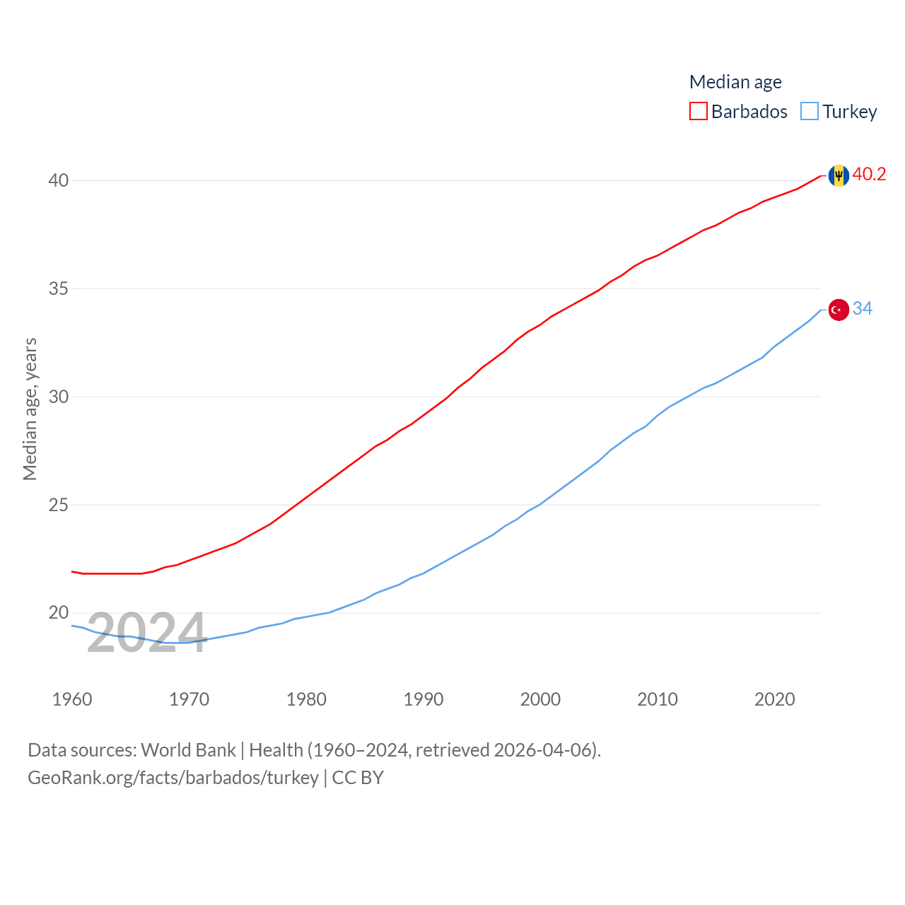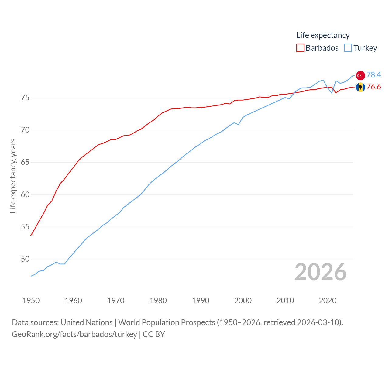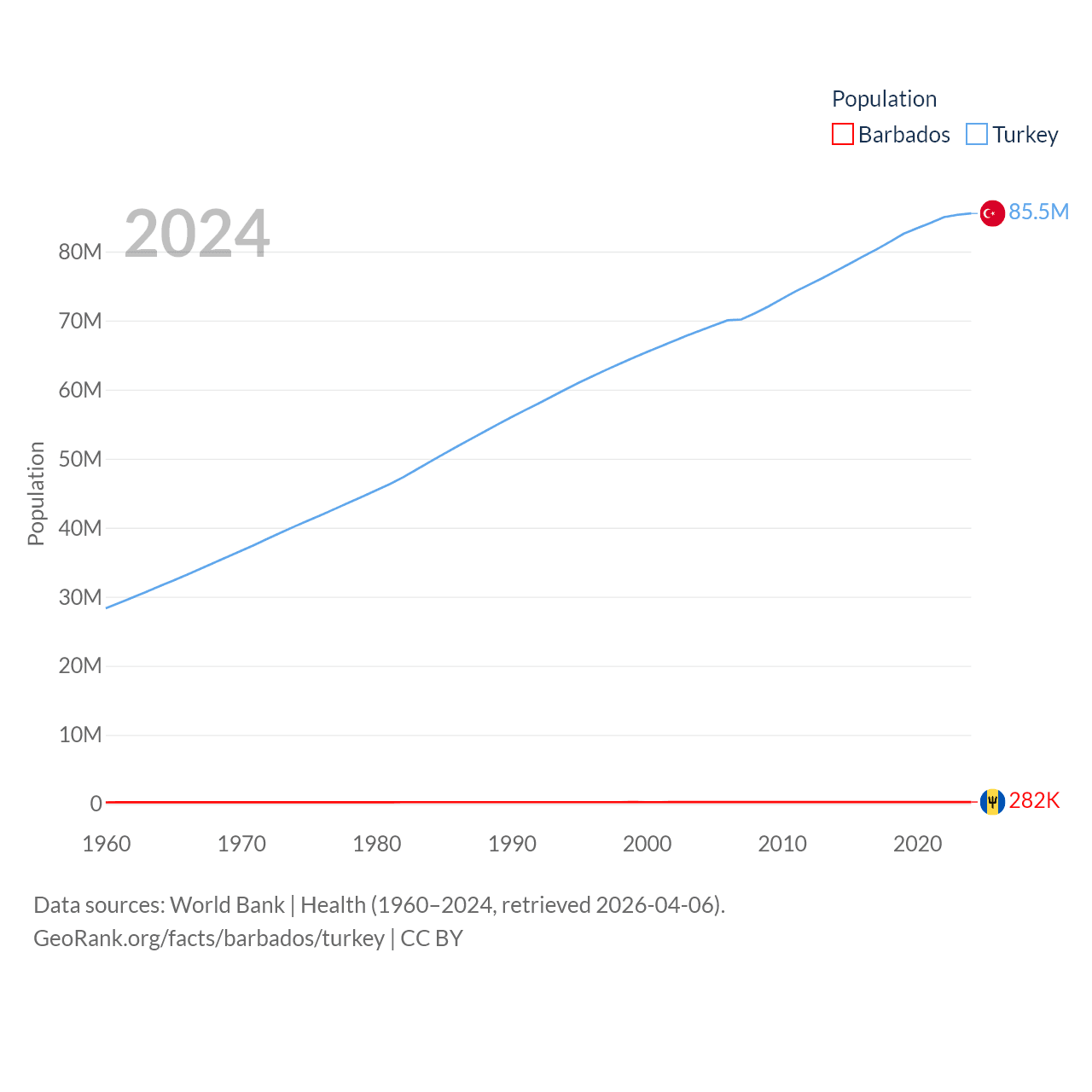 Barbados has a population of 282K (ranked 175/197), compared with 85.5M in Turkey (ranked 18/197). Barbados' land area is 166 sq mi versus 297,156 sq mi for Turkey (ranked 184th vs. 36th).