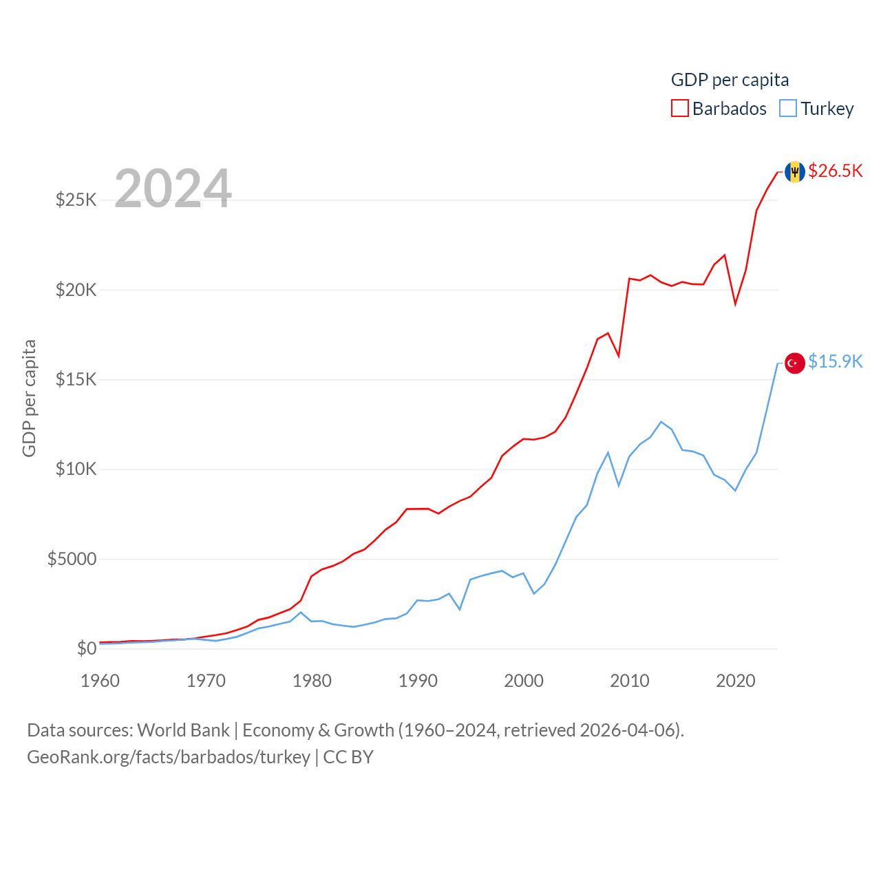 By GDP, Barbados ranks 157/197 ($7.5B) and Turkey ranks 17/197 ($1.36T). By GDP per capita, Barbados ranks 46/197 ($26,545), while Turkey ranks 66/197 ($15,893).