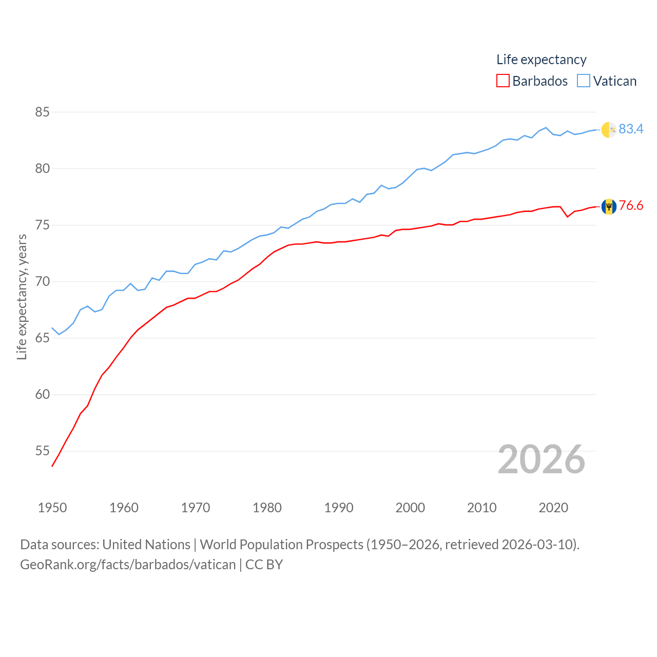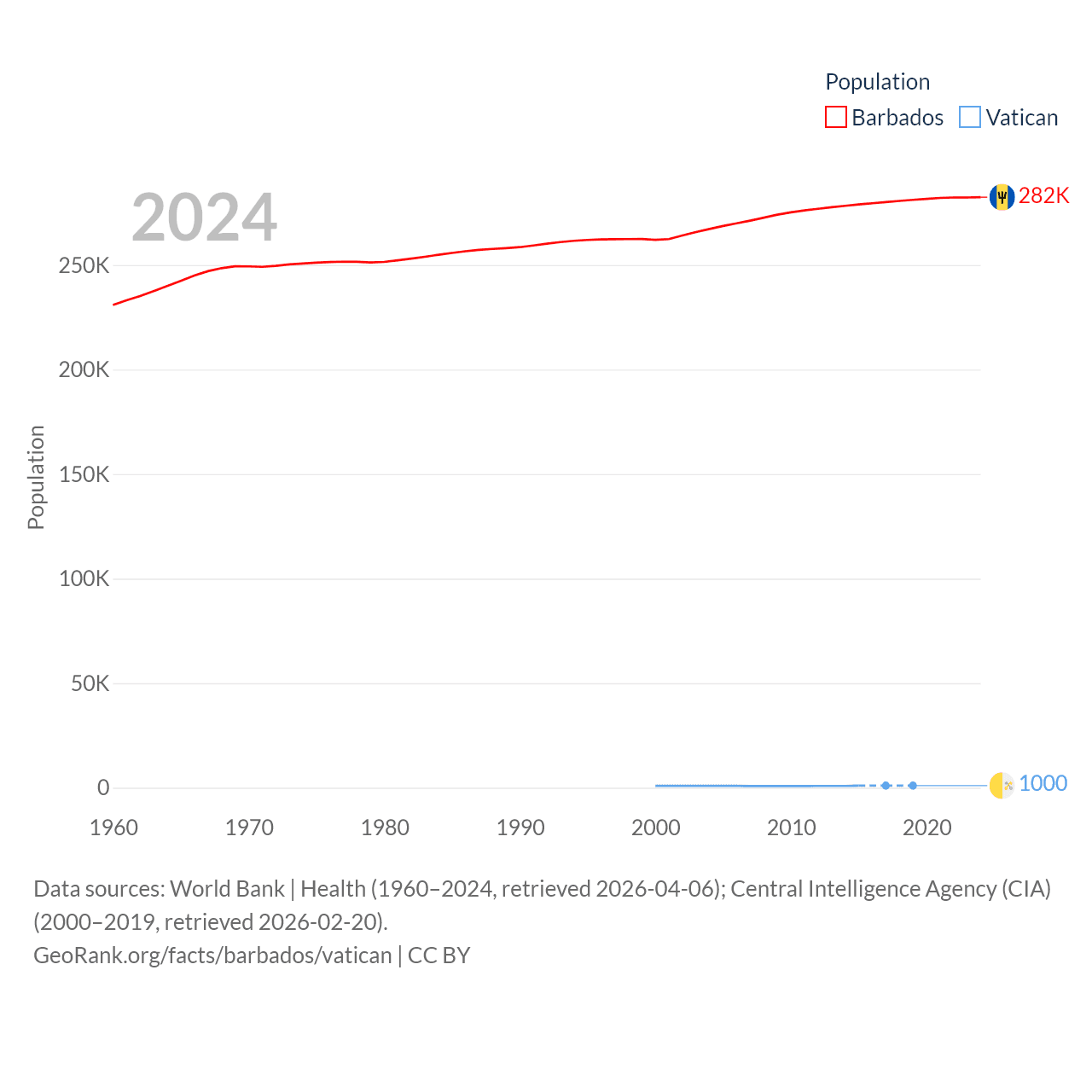 Barbados has a population of 282K (ranked 175/197), compared with 1K in The Vatican (ranked 197/197). Barbados' land area is 166 sq mi versus 0.17 sq mi for The Vatican (ranked 184th vs. 197th).