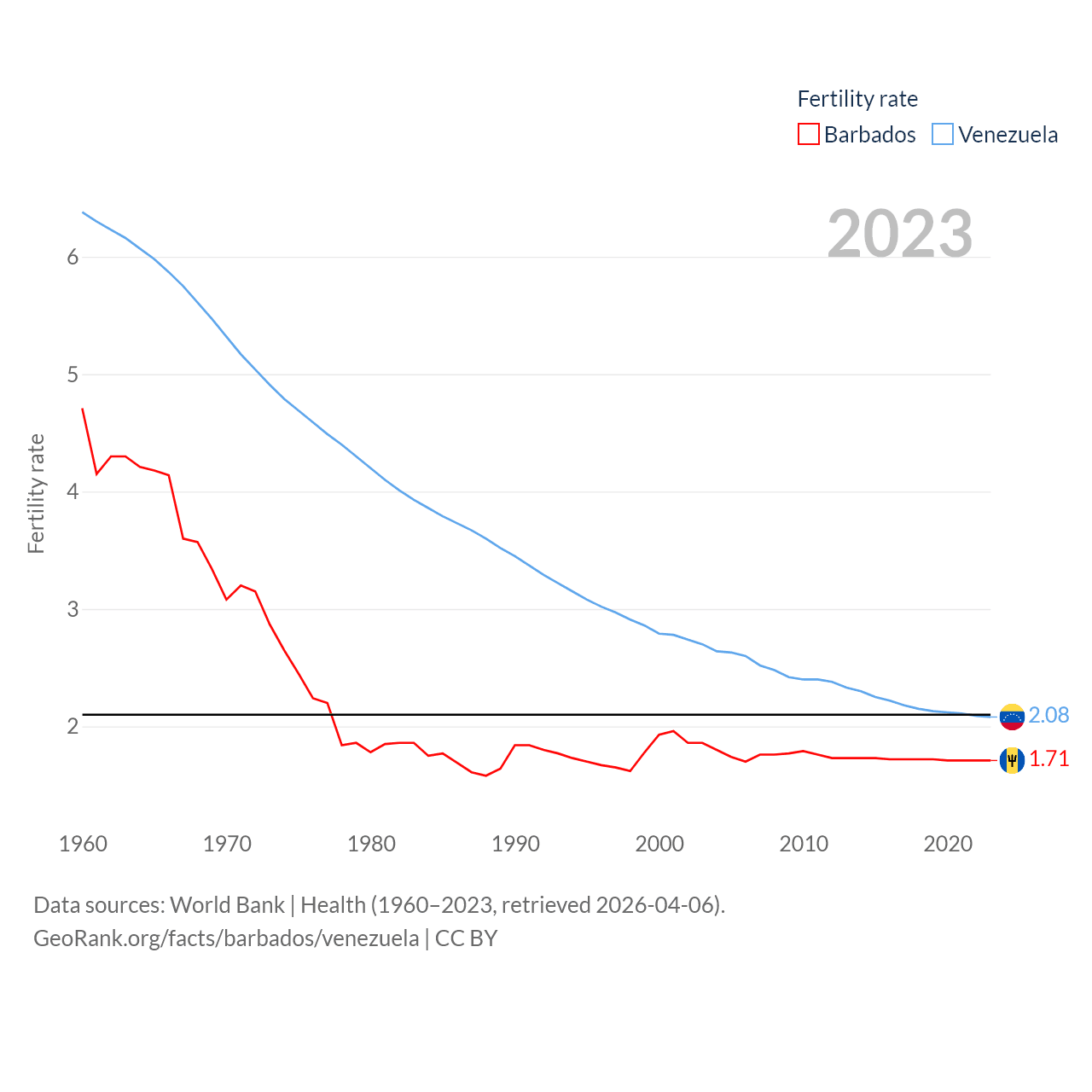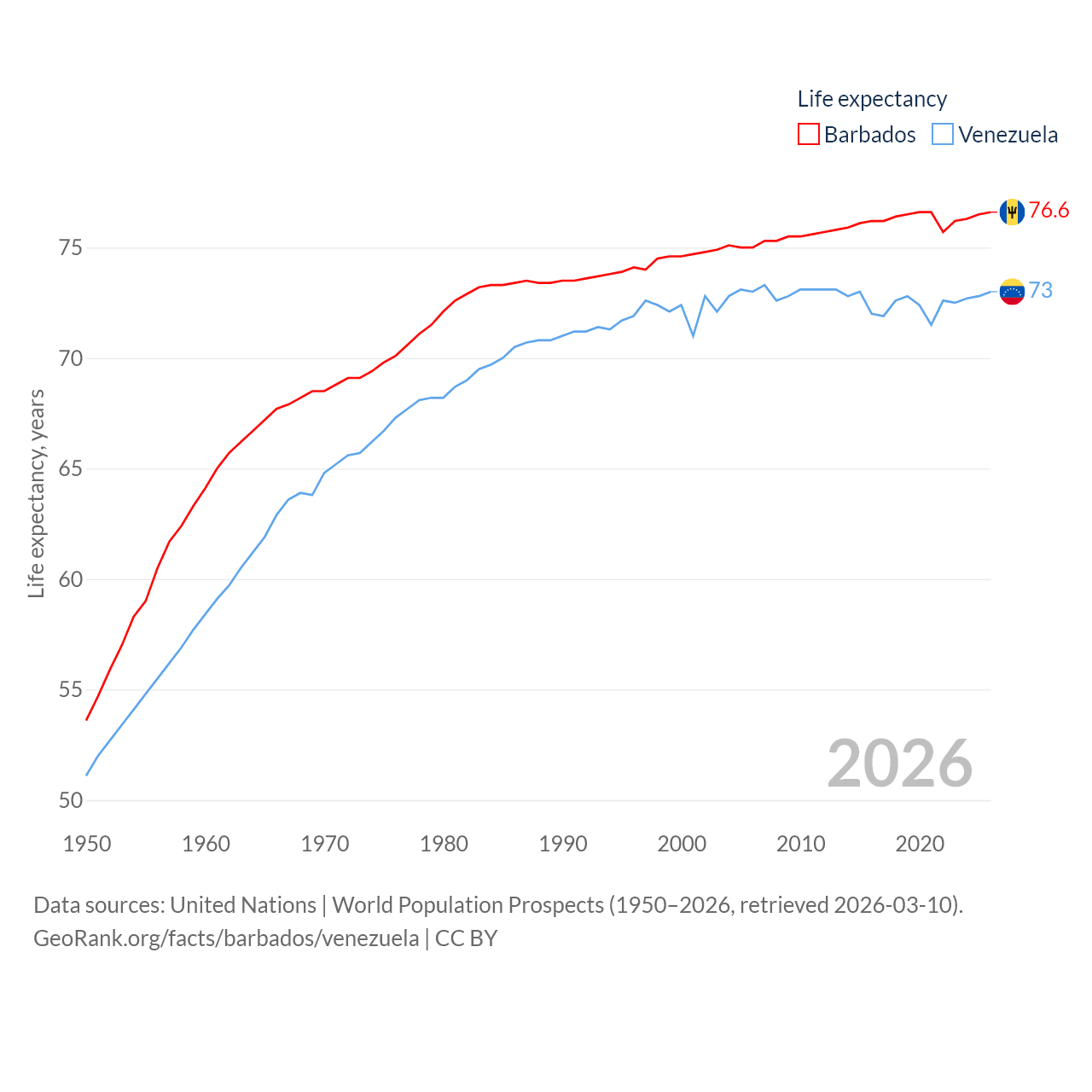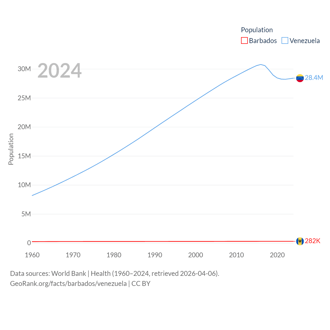 Barbados has a population of 282K (ranked 175/197), compared with 28.4M in Venezuela (ranked 53/197). Barbados' land area is 166 sq mi versus 340,561 sq mi for Venezuela (ranked 184th vs. 32nd).
