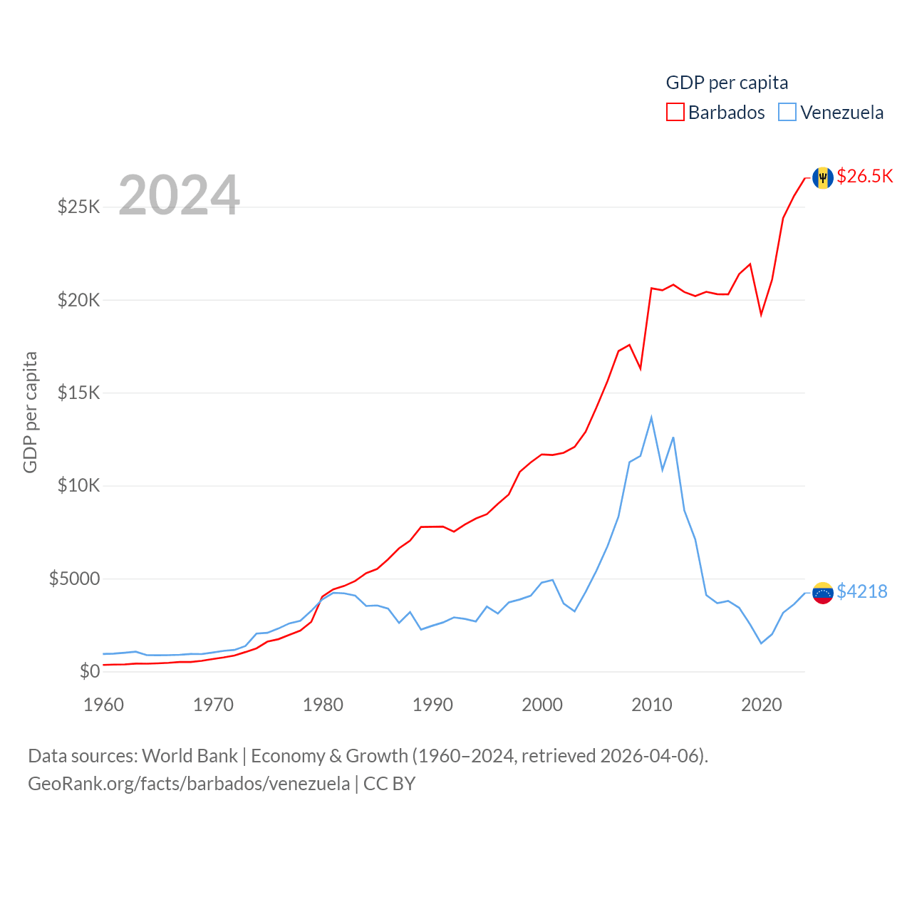 By GDP, Barbados ranks 157/197 ($7.5B) and Venezuela ranks 65/197 ($120B). By GDP per capita, Barbados ranks 46/197 ($26,545), while Venezuela ranks 128/197 ($4,218).