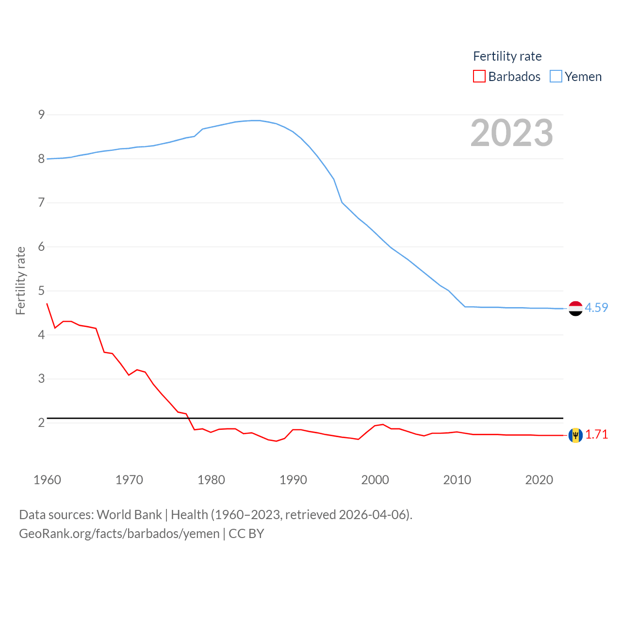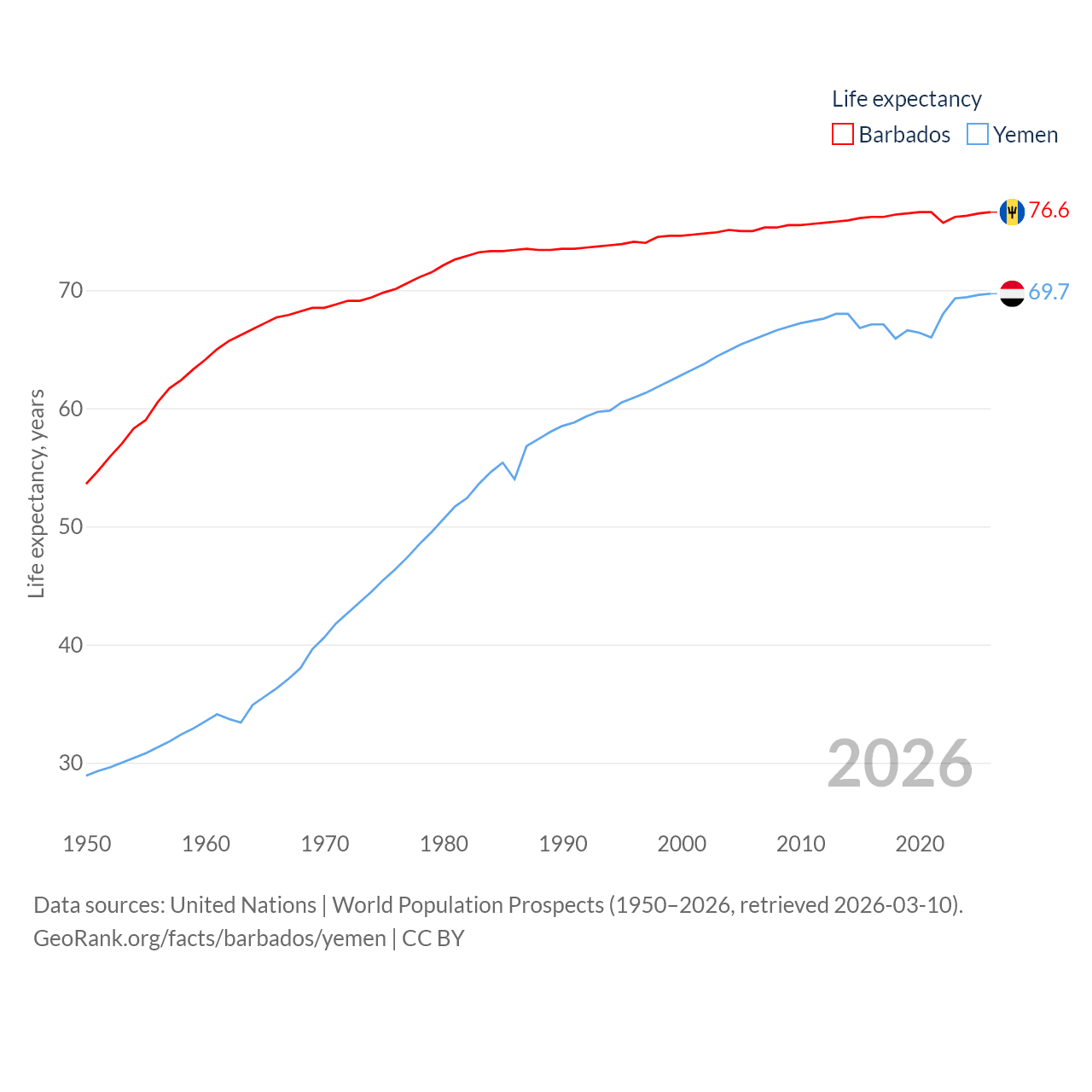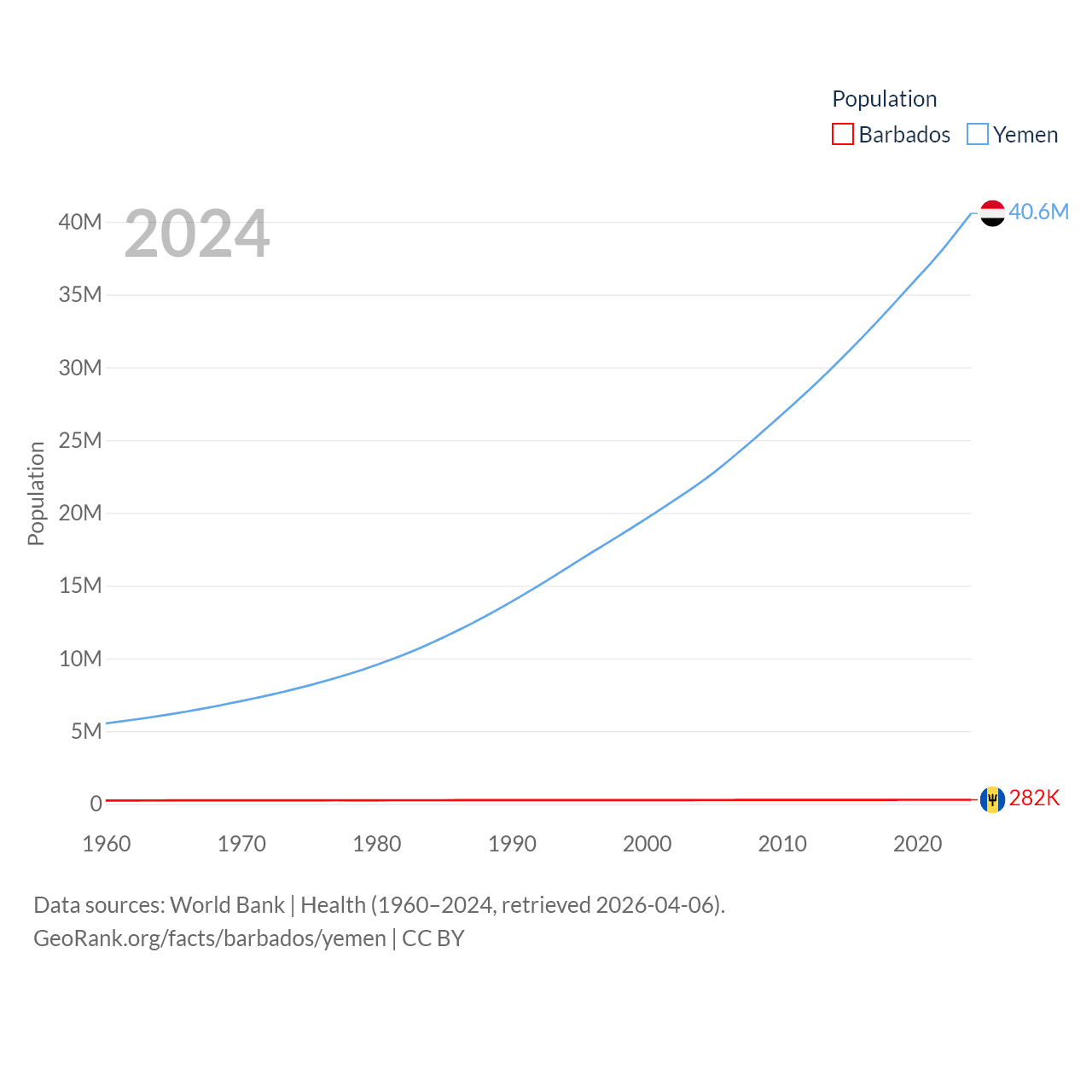 Barbados has a population of 282K (ranked 175/197), compared with 40.6M in Yemen (ranked 38/197). Barbados' land area is 166 sq mi versus 203,850 sq mi for Yemen (ranked 184th vs. 49th).