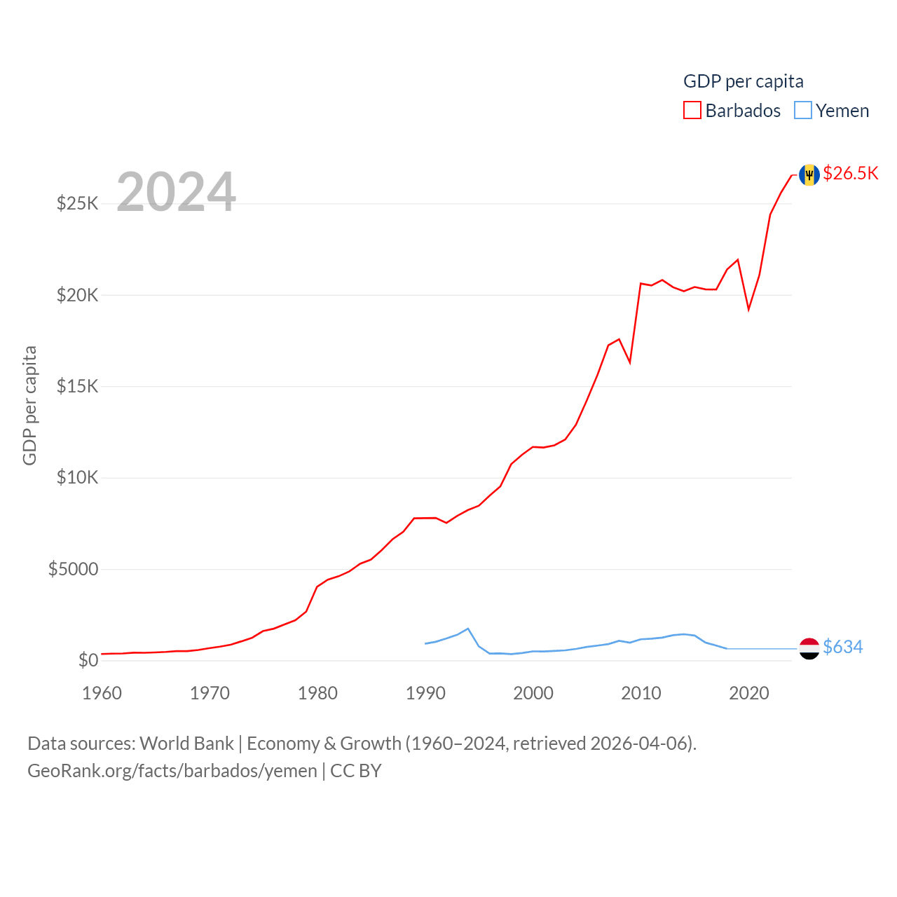 By GDP, Barbados ranks 157/197 ($7.5B) and Yemen ranks 125/197 ($21.6B). By GDP per capita, Barbados ranks 46/197 ($26,545), while Yemen ranks 191/197 ($634).