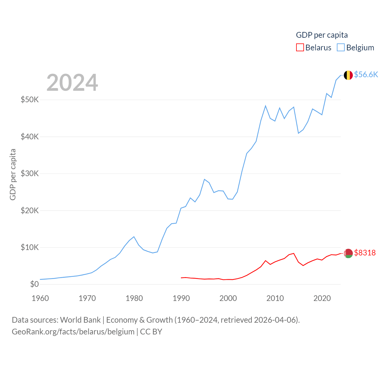 By GDP, Belarus ranks 83/197 ($76B) and Belgium ranks 23/197 ($671B). By GDP per capita, Belarus ranks 92/197 ($8,318), while Belgium ranks 18/197 ($56,615).