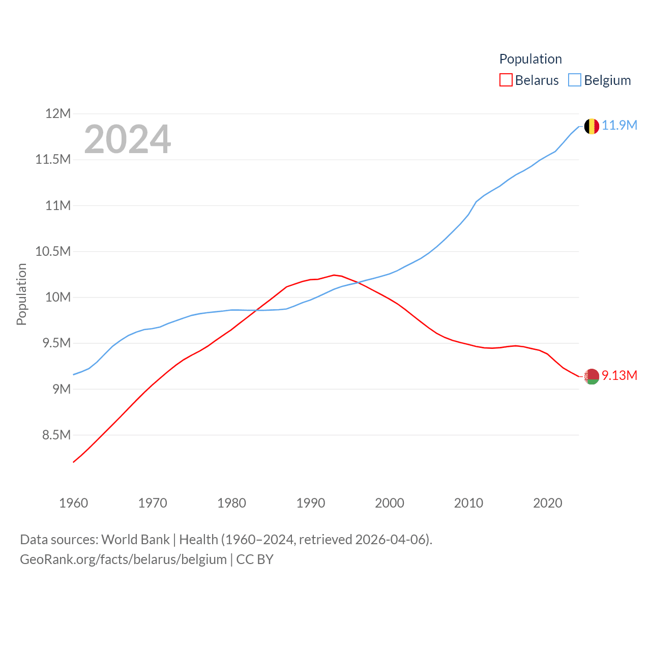 Belarus has a population of 9.13M (ranked 100/197), compared with 11.9M in Belgium (ranked 82/197). Belarus' land area is 78,372 sq mi versus 11,774 sq mi for Belgium (ranked 83rd vs. 136th).