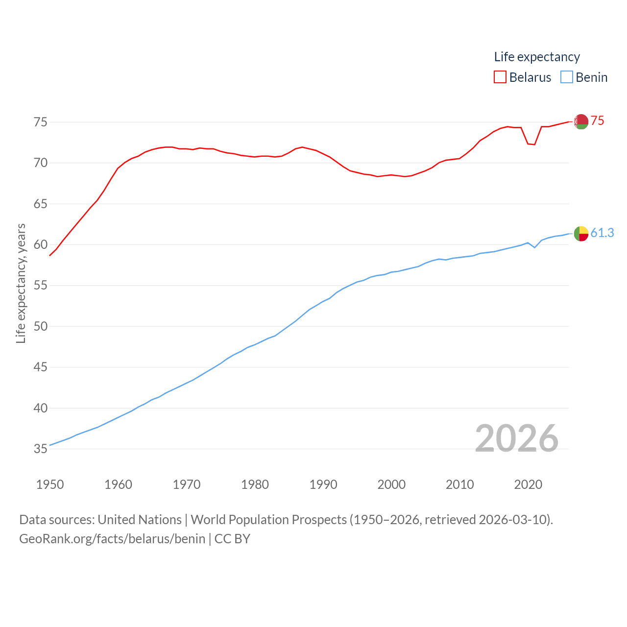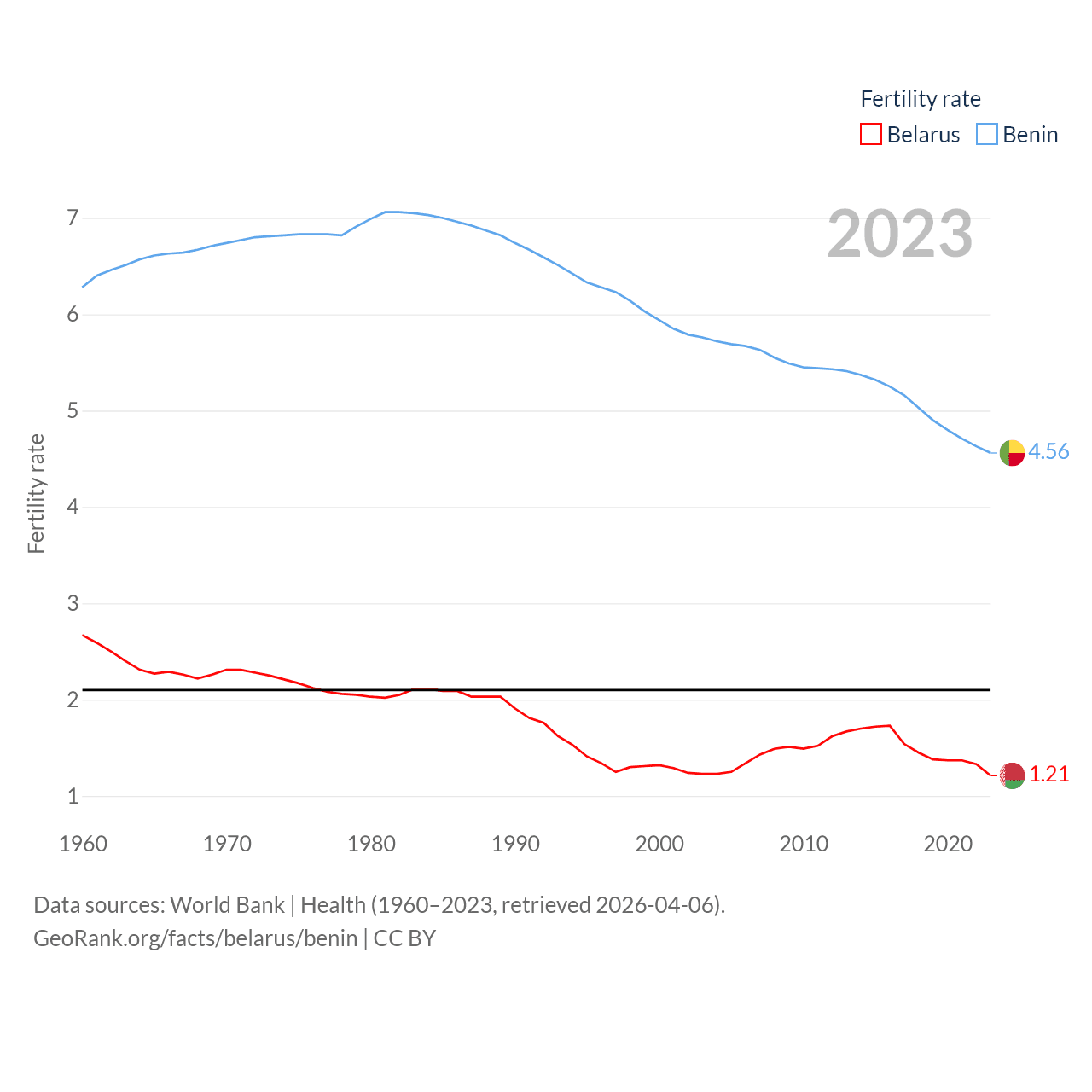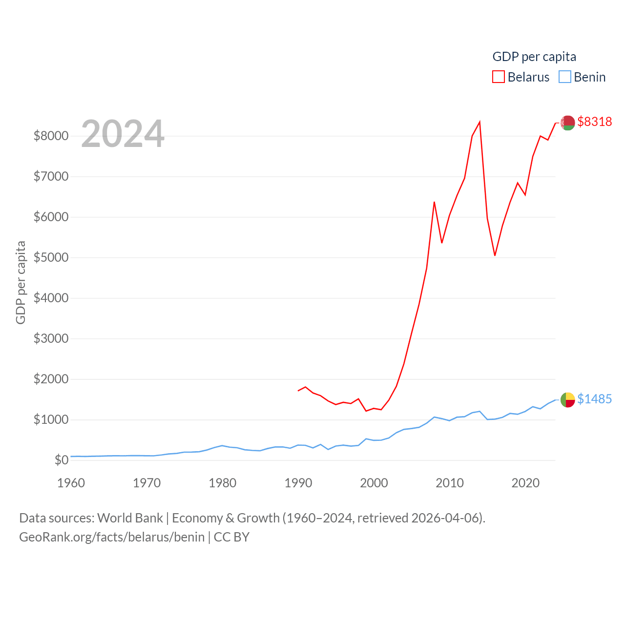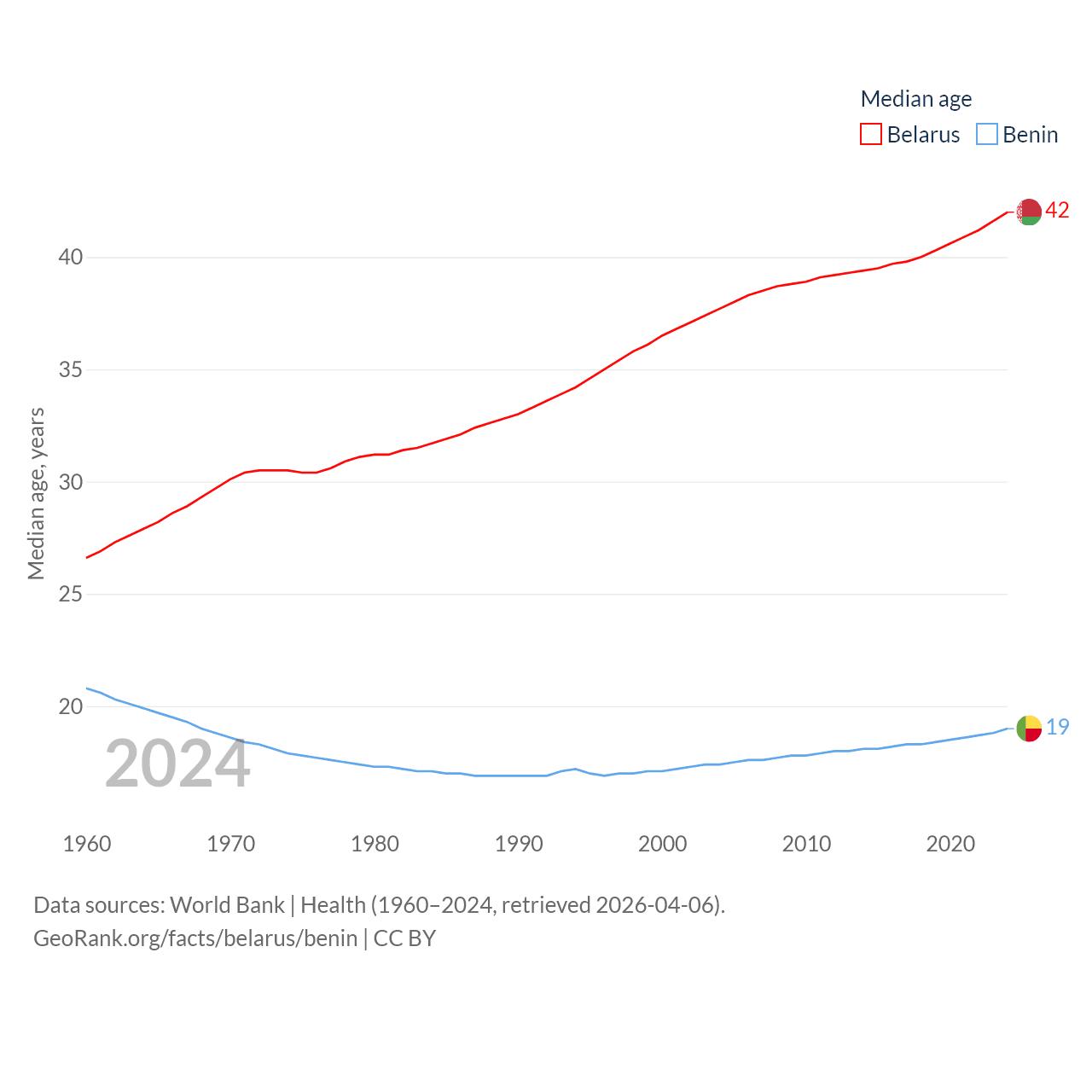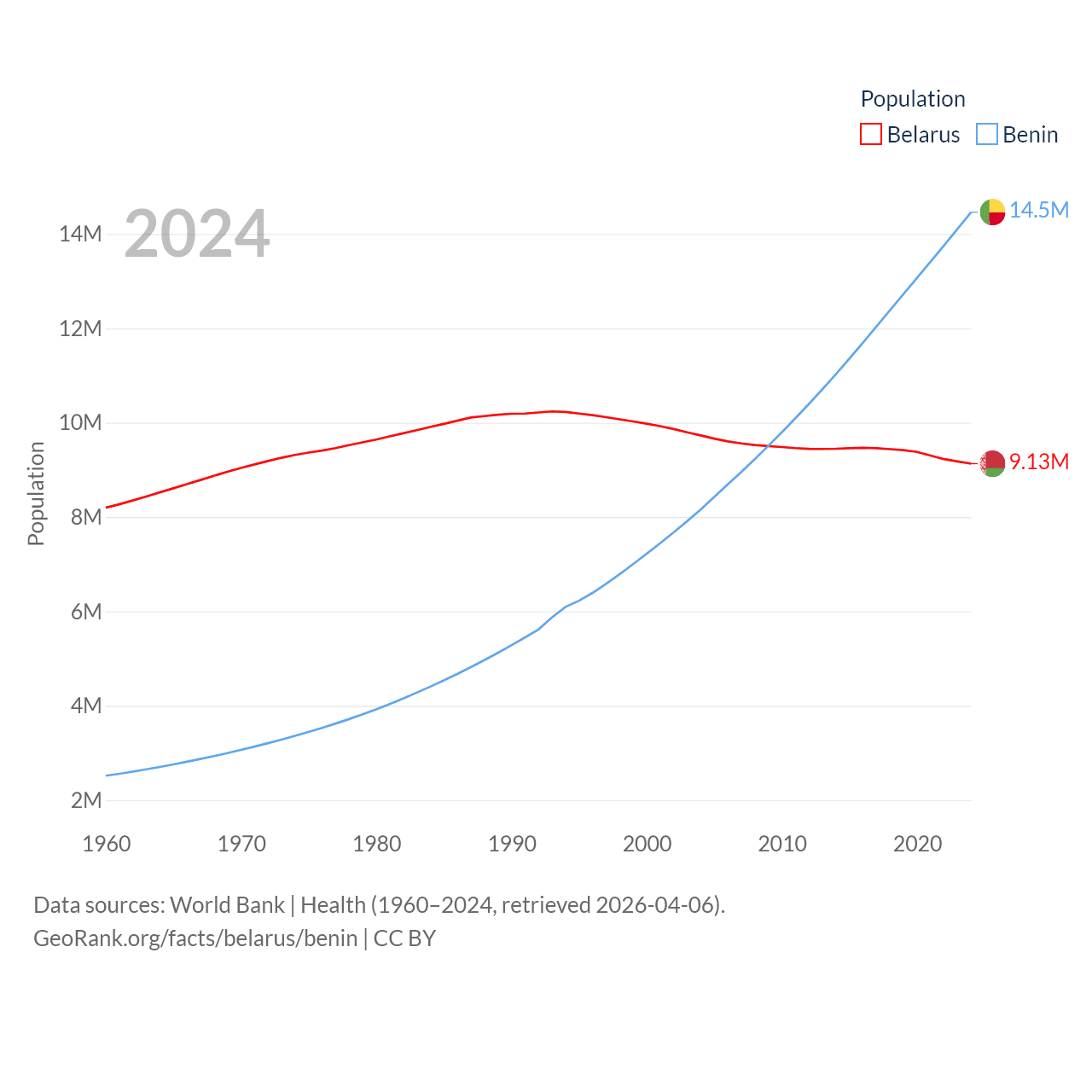 Belarus has a population of 9.13M (ranked 100/197), compared with 14.5M in Benin (ranked 76/197). Belarus' land area is 78,372 sq mi versus 43,537 sq mi for Benin (ranked 83rd vs. 99th).