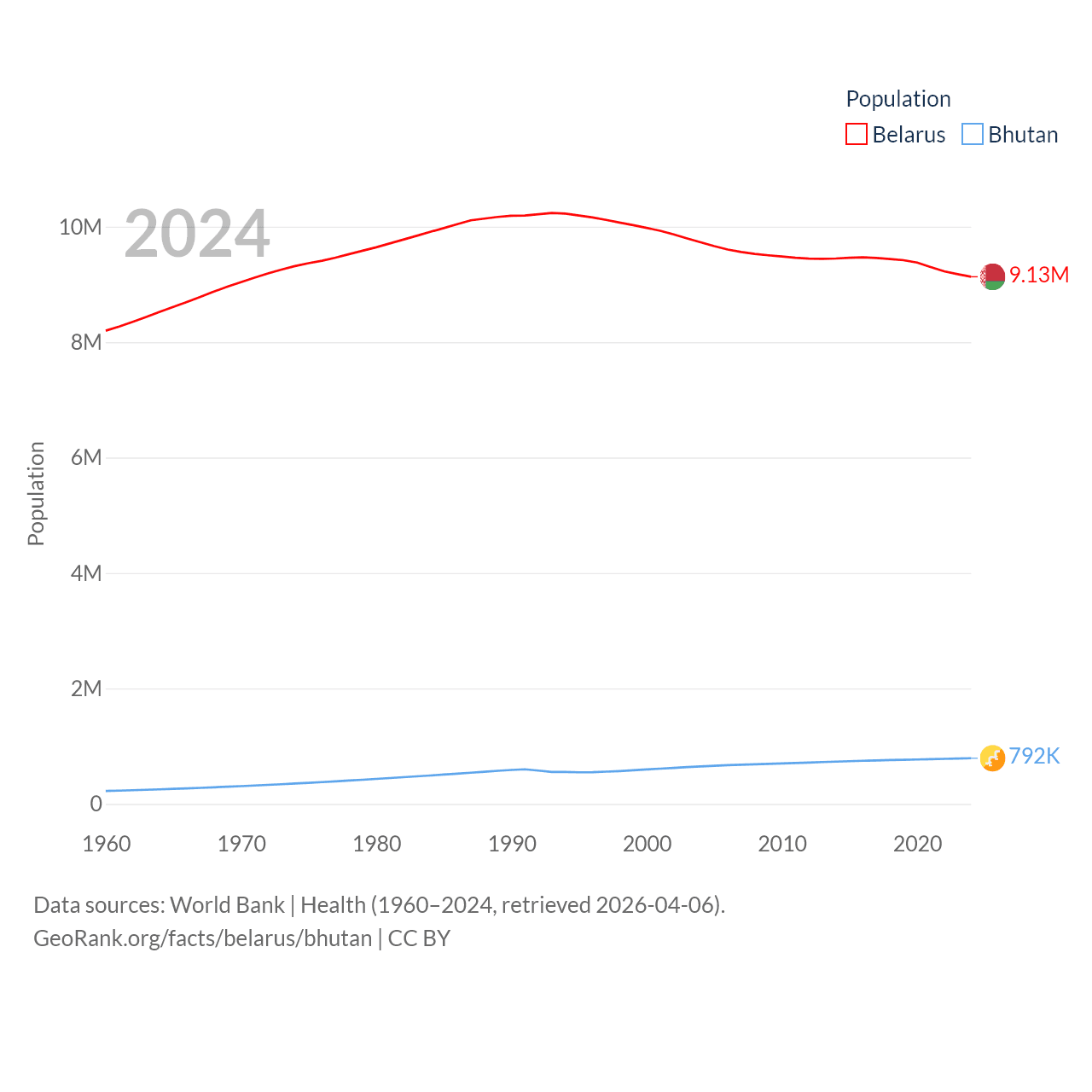 Belarus has a population of 9.13M (ranked 100/197), compared with 792K in Bhutan (ranked 163/197). Belarus' land area is 78,372 sq mi versus 14,726 sq mi for Bhutan (ranked 83rd vs. 132nd).
