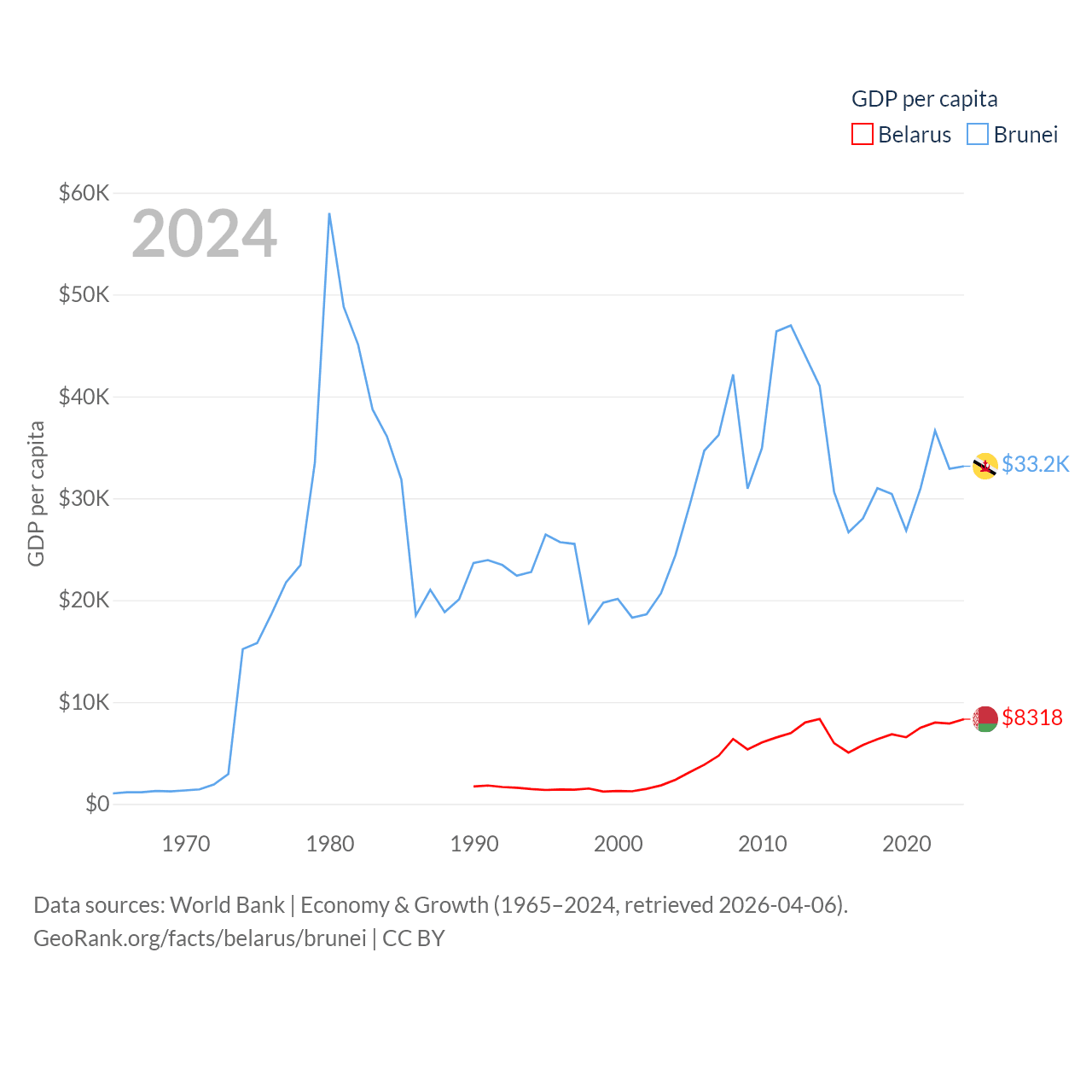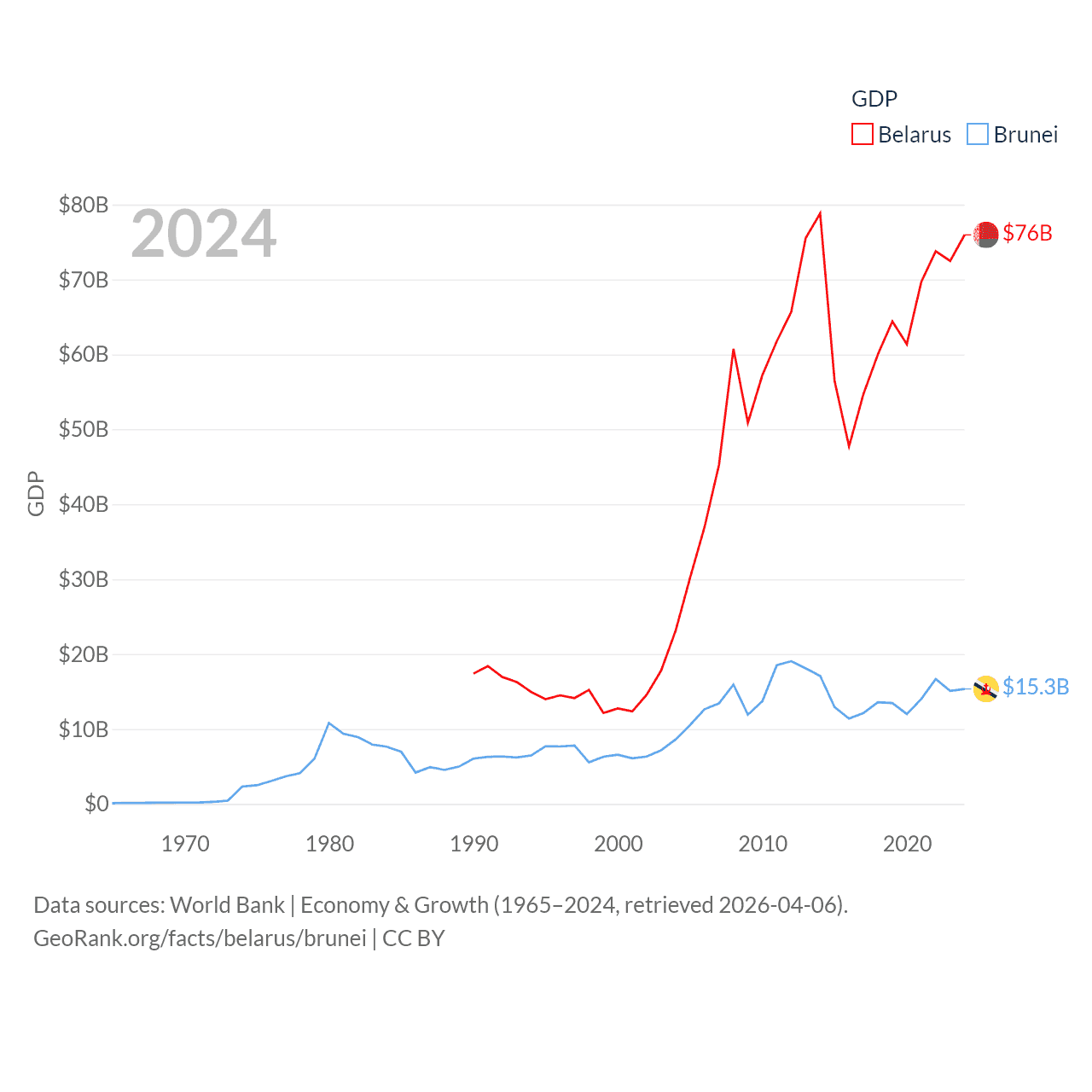 By GDP, Belarus ranks 83/197 ($76B) and Brunei ranks 142/197 ($15.3B). By GDP per capita, Belarus ranks 92/197 ($8,318), while Brunei ranks 36/197 ($33,153).