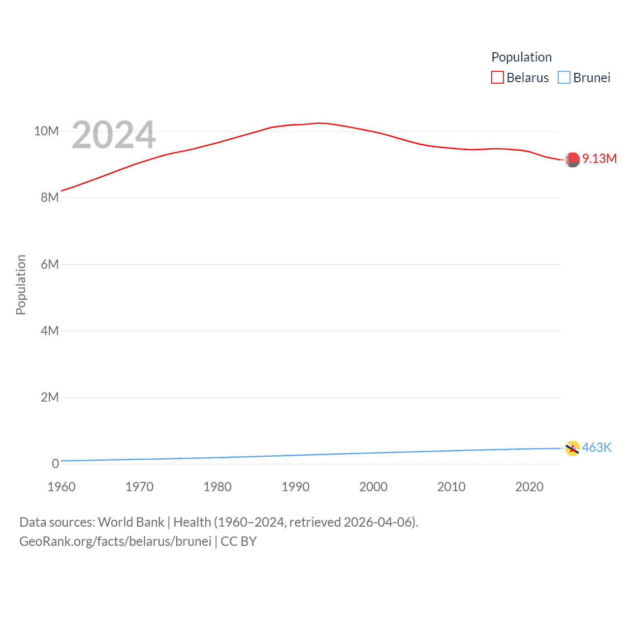 Belarus has a population of 9.13M (ranked 100/197), compared with 463K in Brunei (ranked 170/197). Belarus' land area is 78,372 sq mi versus 2,035 sq mi for Brunei (ranked 83rd vs. 165th).
