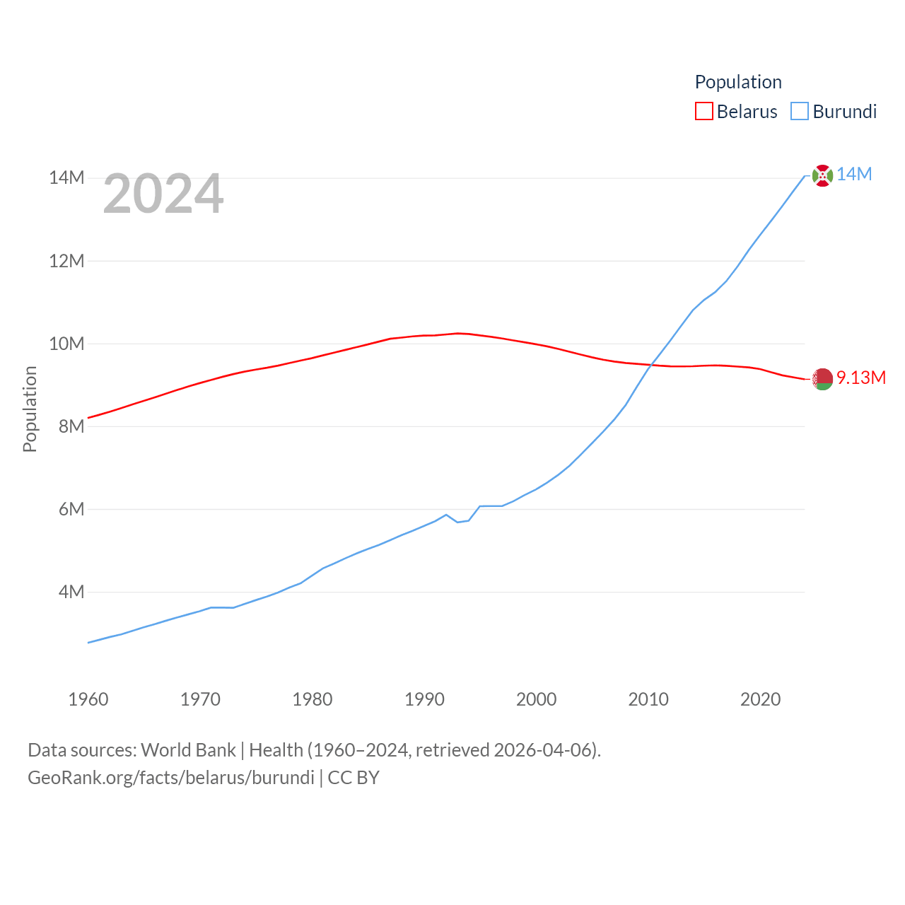 Belarus has a population of 9.13M (ranked 100/197), compared with 14M in Burundi (ranked 78/197). Belarus' land area is 78,372 sq mi versus 9,915 sq mi for Burundi (ranked 83rd vs. 144th).