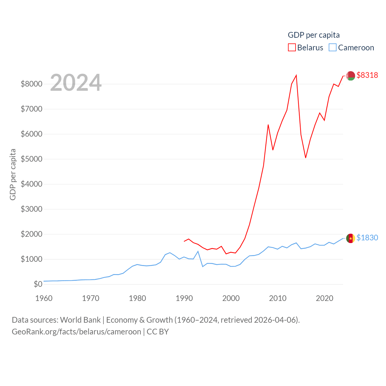 By GDP, Belarus ranks 83/197 ($76B) and Cameroon ranks 91/197 ($53.3B). By GDP per capita, Belarus ranks 92/197 ($8,318), while Cameroon ranks 158/197 ($1,830).