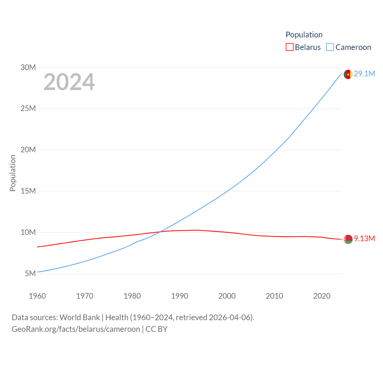 Belarus has a population of 9.13M (ranked 100/197), compared with 29.1M in Cameroon (ranked 52/197). Belarus' land area is 78,372 sq mi versus 182,514 sq mi for Cameroon (ranked 83rd vs. 52nd).