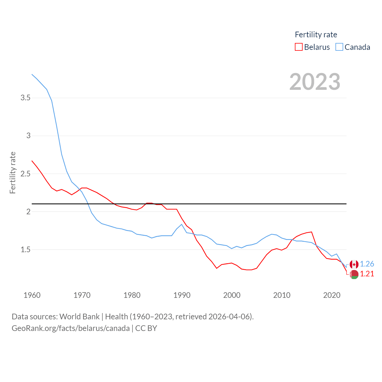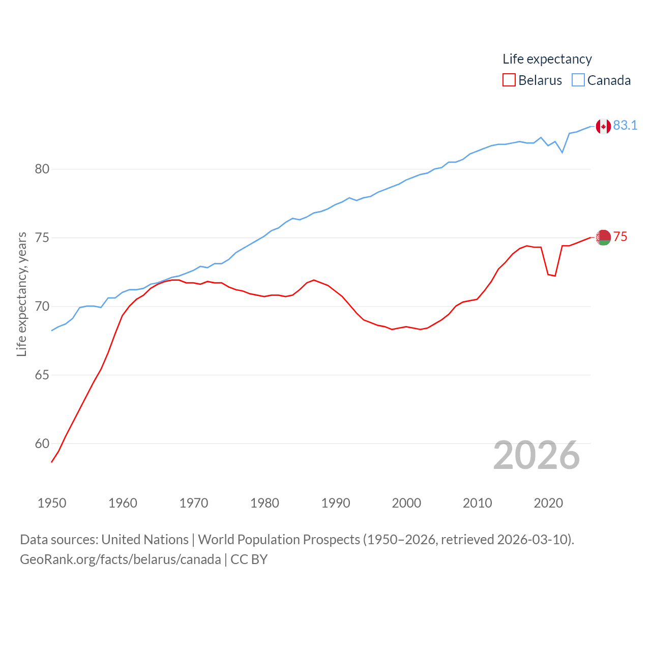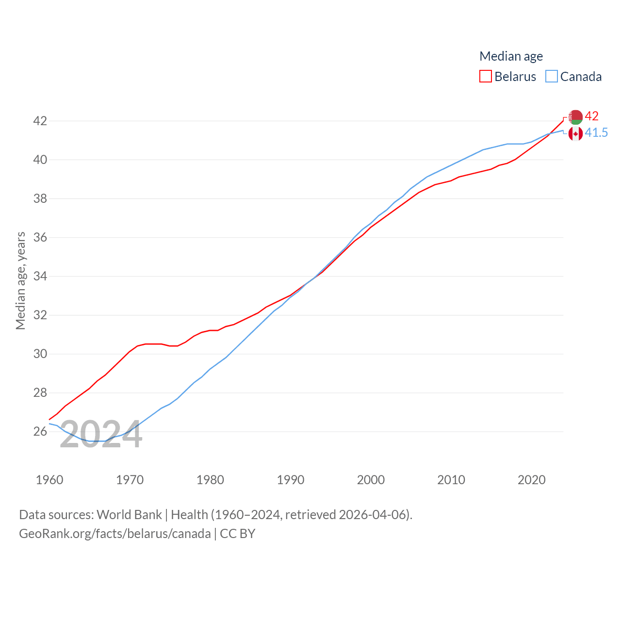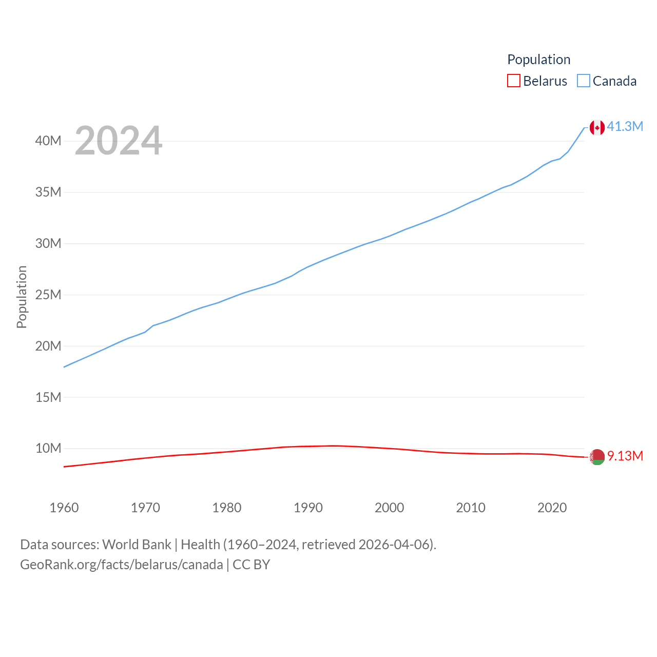 Belarus has a population of 9.13M (ranked 100/197), compared with 41.3M in Canada (ranked 37/197). Belarus' land area is 78,372 sq mi versus 3,393,336 sq mi for Canada (ranked 83rd vs. 4th).