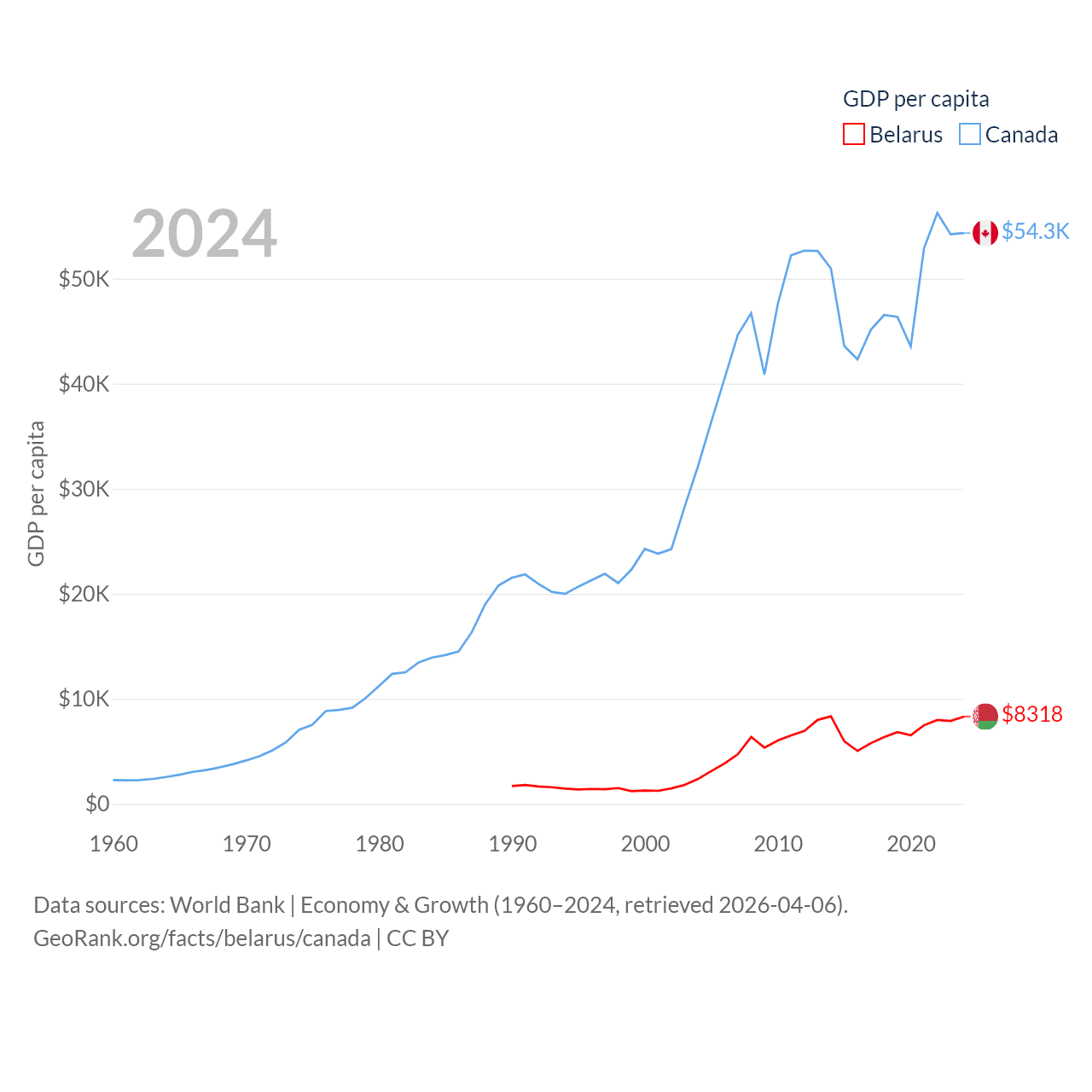 By GDP, Belarus ranks 83/197 ($76B) and Canada ranks 9/197 ($2.24T). By GDP per capita, Belarus ranks 92/197 ($8,318), while Canada ranks 20/197 ($54,340).