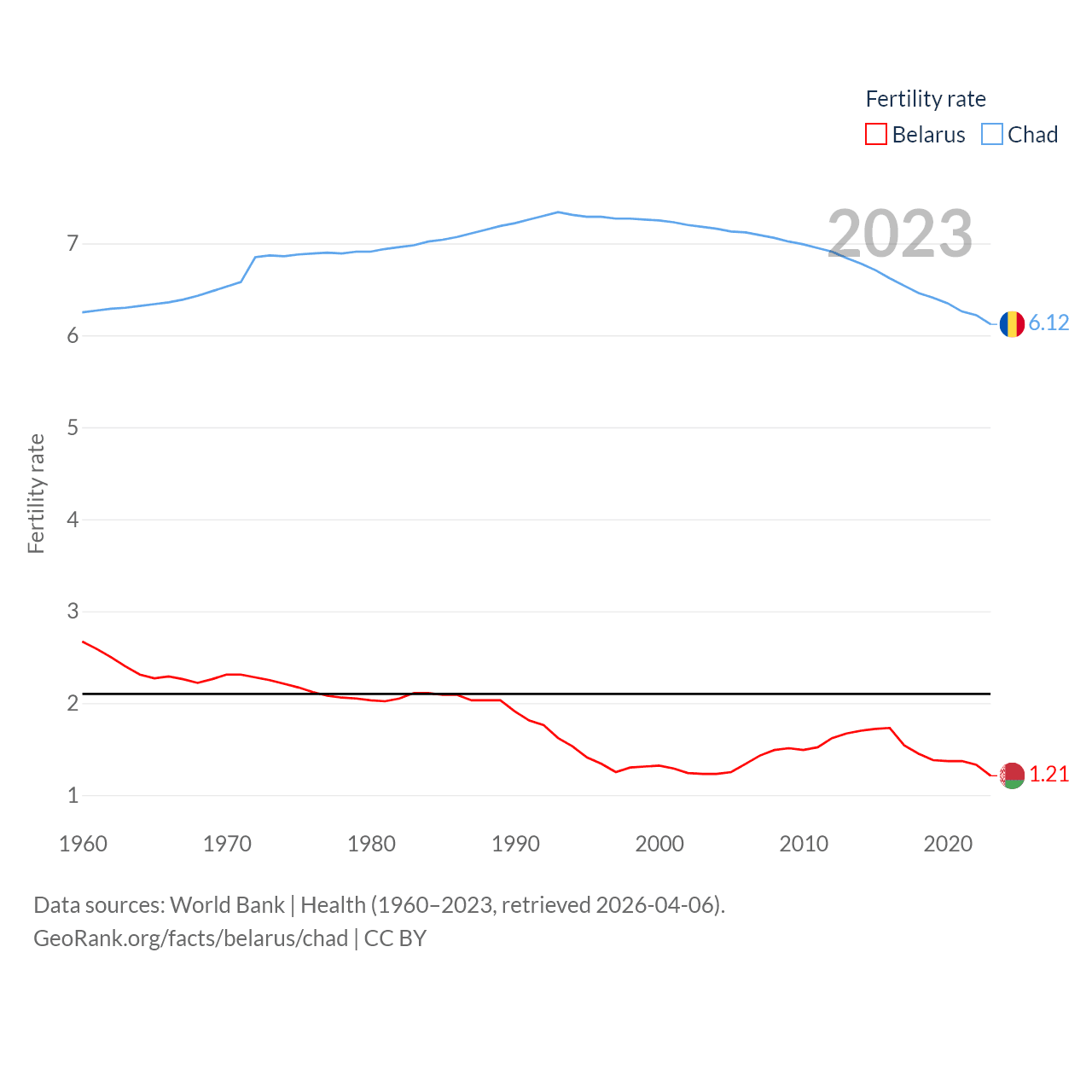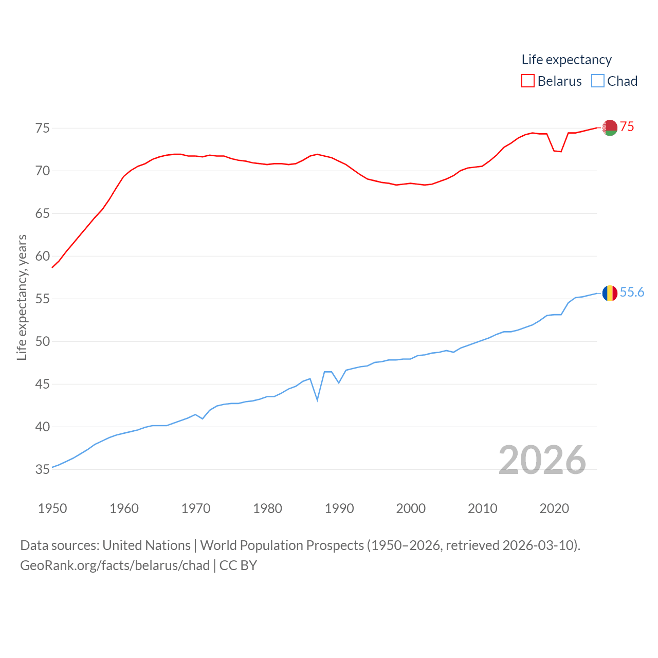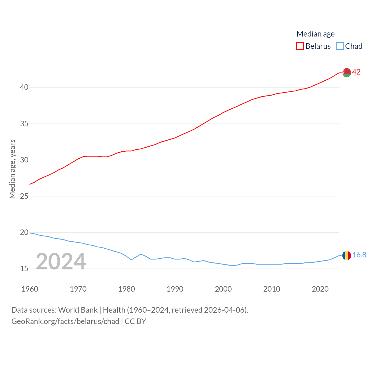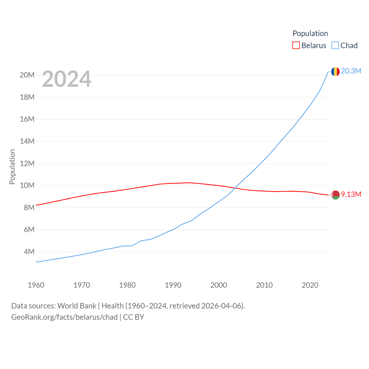 Belarus has a population of 9.13M (ranked 100/197), compared with 20.3M in Chad (ranked 65/197). Belarus' land area is 78,372 sq mi versus 486,180 sq mi for Chad (ranked 83rd vs. 21st).