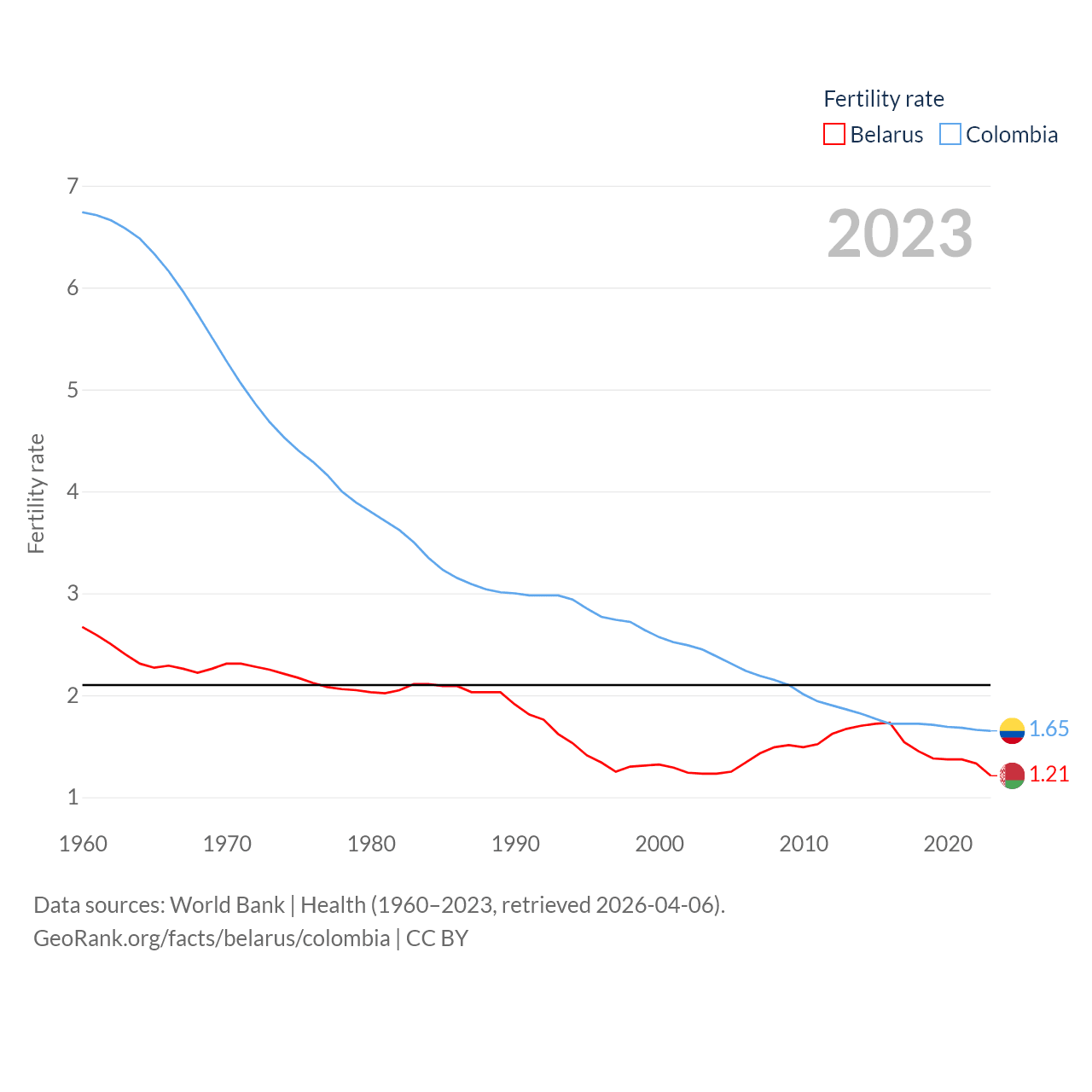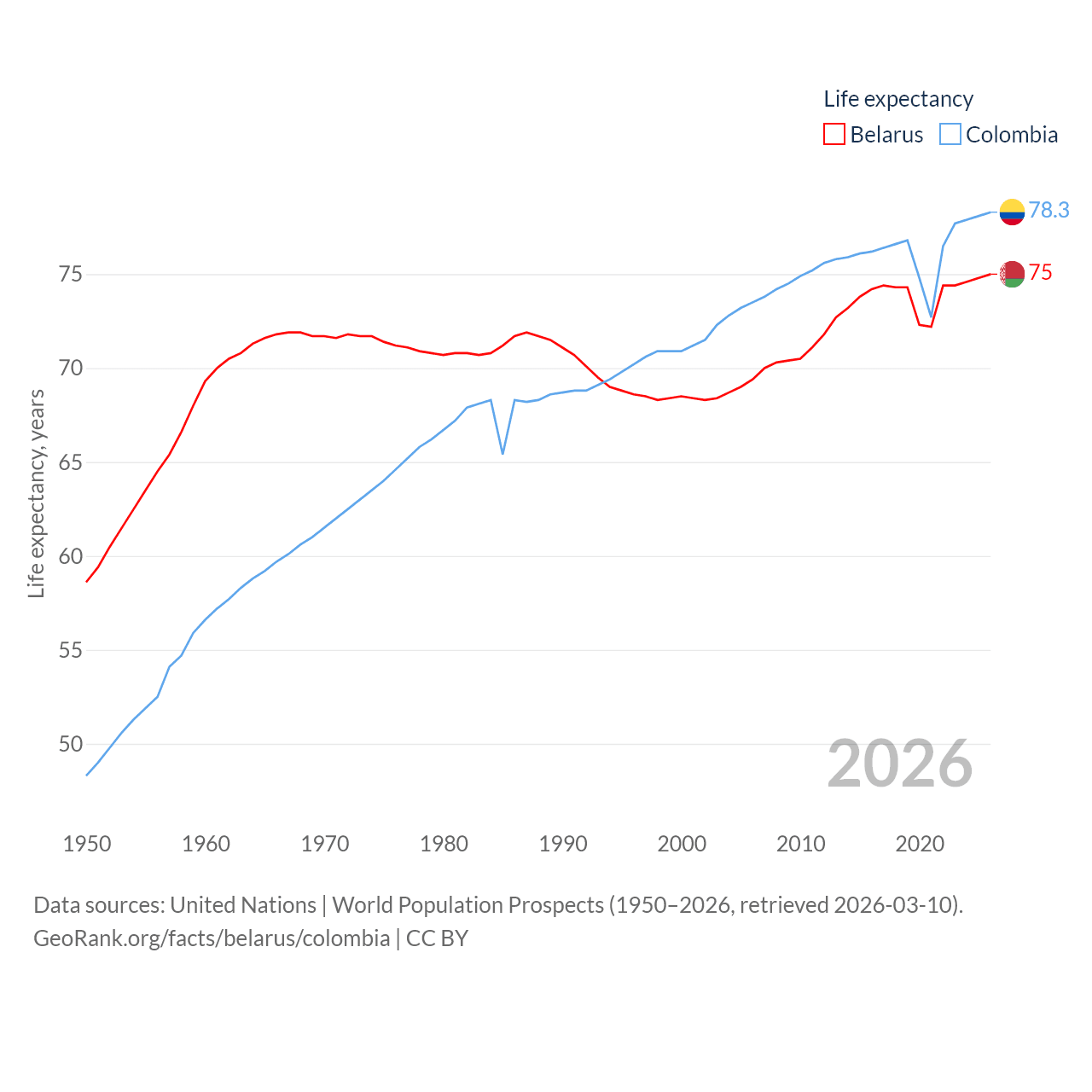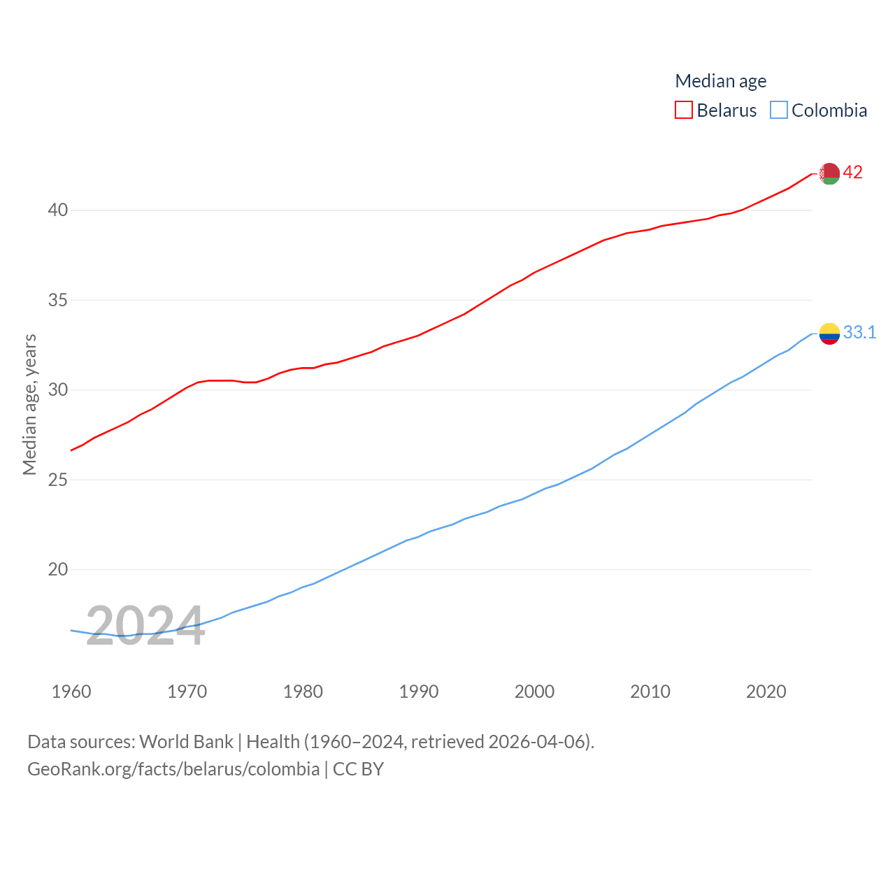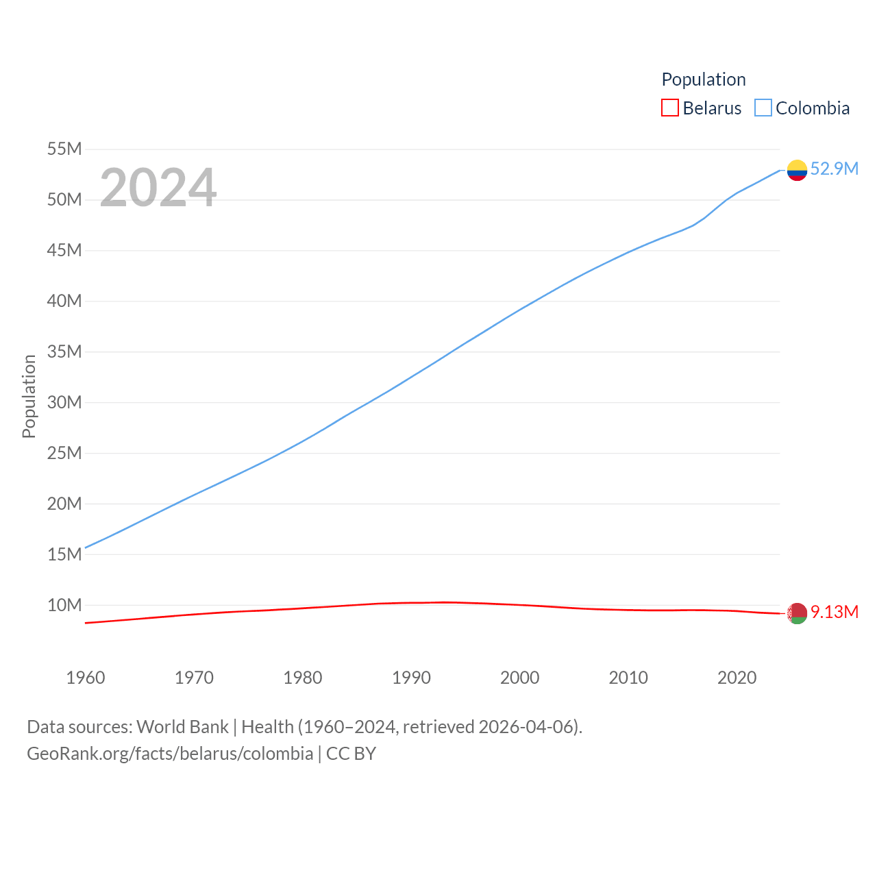 Belarus has a population of 9.13M (ranked 100/197), compared with 52.9M in Colombia (ranked 28/197). Belarus' land area is 78,372 sq mi versus 428,380 sq mi for Colombia (ranked 83rd vs. 26th).