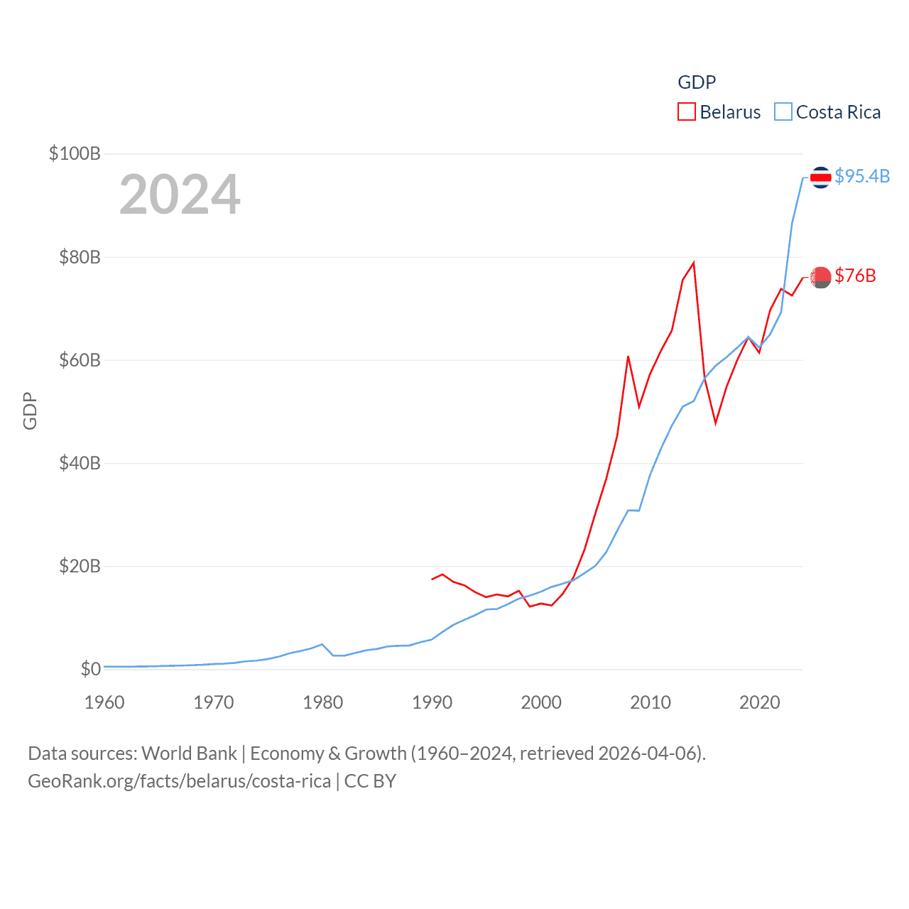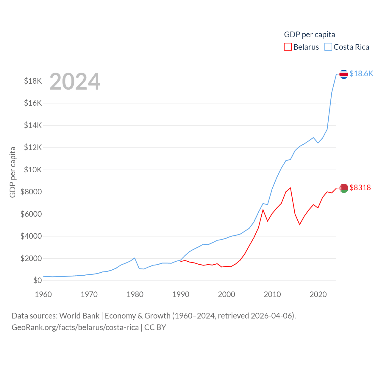 By GDP, Belarus ranks 83/197 ($76B) and Costa Rica ranks 73/197 ($95.4B). By GDP per capita, Belarus ranks 92/197 ($8,318), while Costa Rica ranks 62/197 ($18,587).