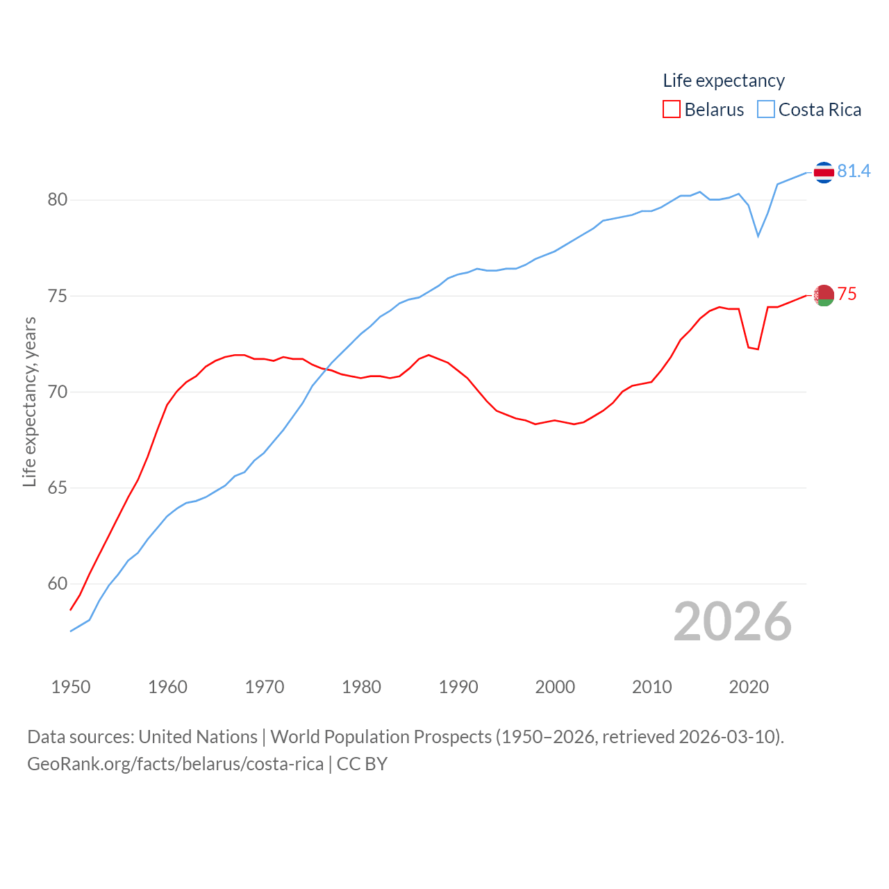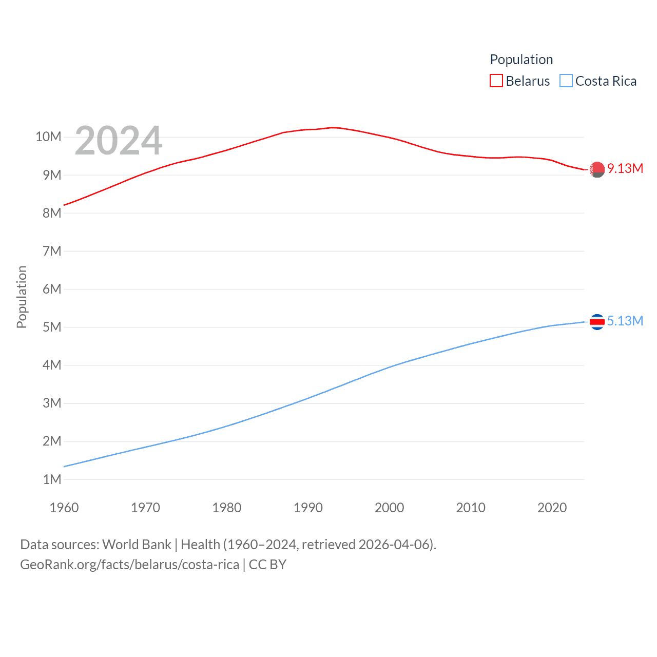 Belarus has a population of 9.13M (ranked 100/197), compared with 5.13M in Costa Rica (ranked 126/197). Belarus' land area is 78,372 sq mi versus 19,714 sq mi for Costa Rica (ranked 83rd vs. 126th).
