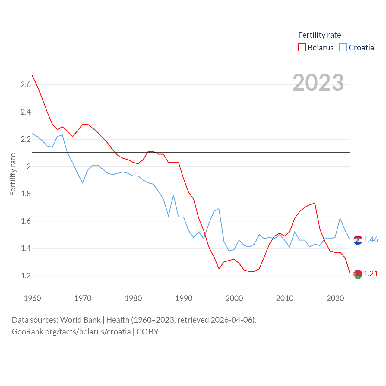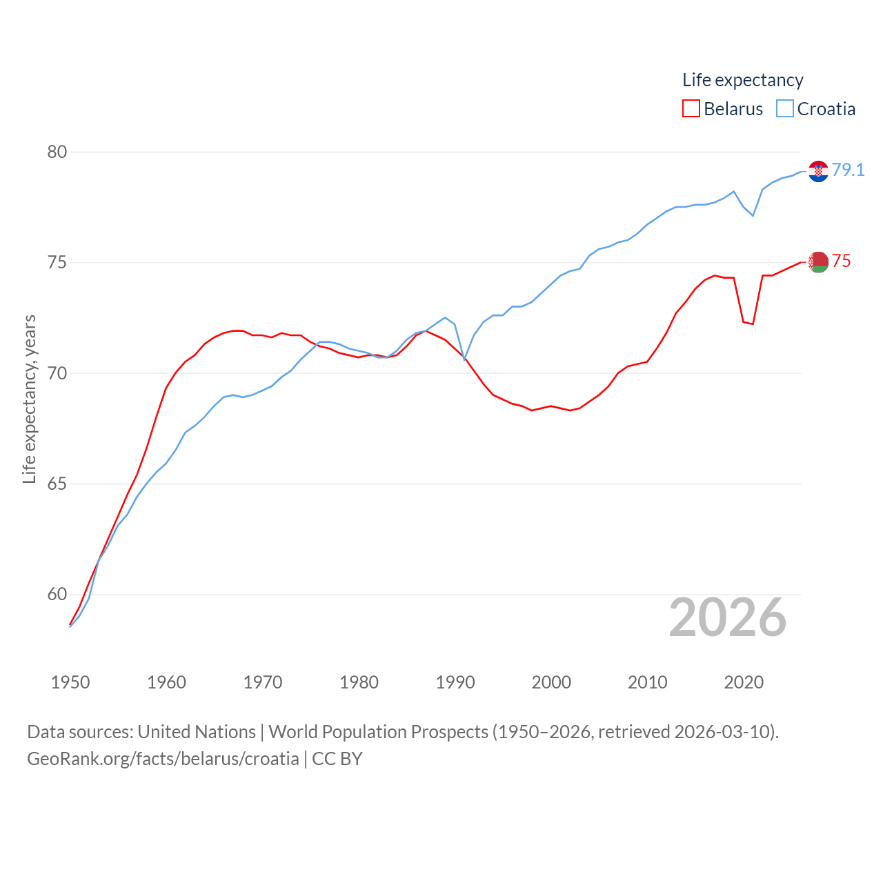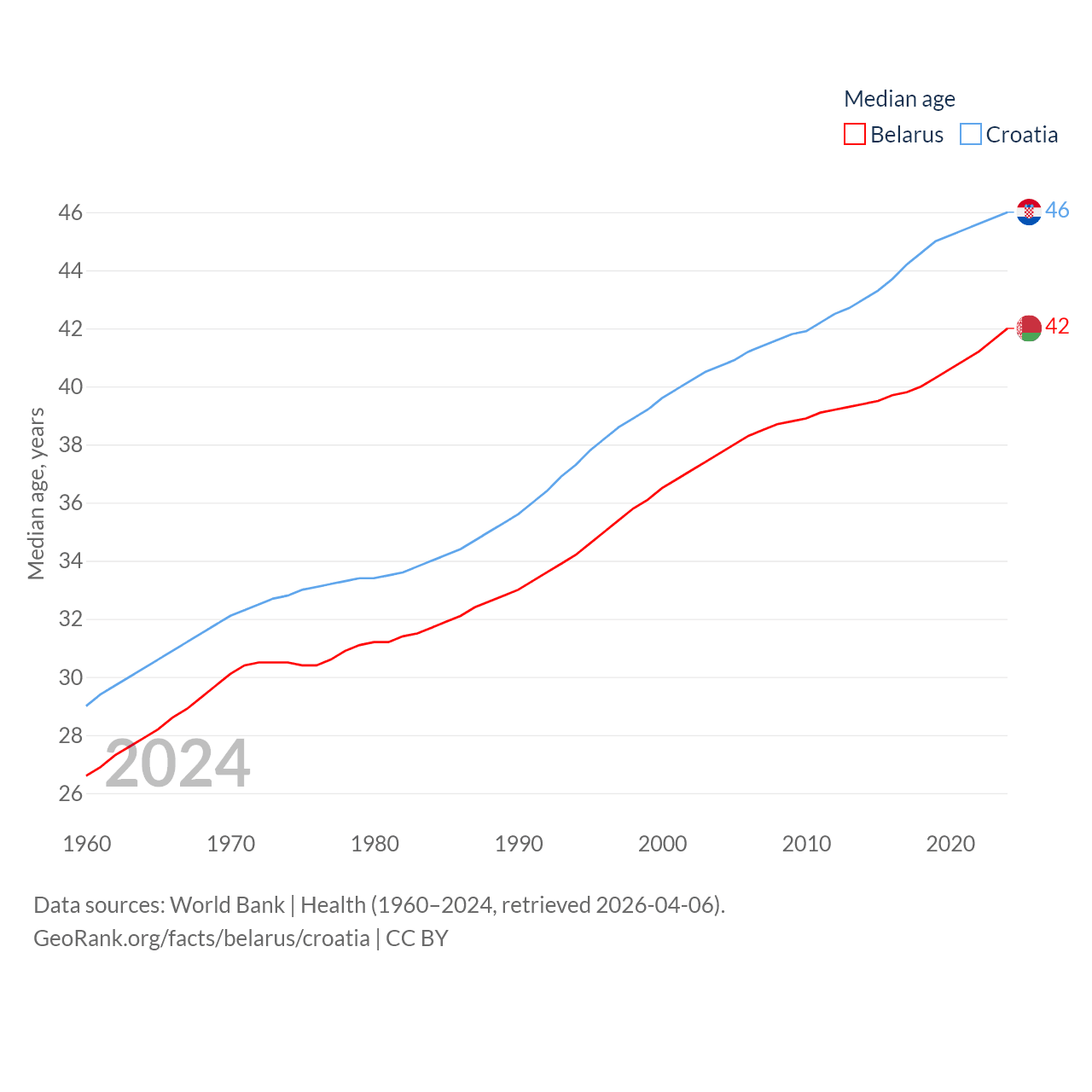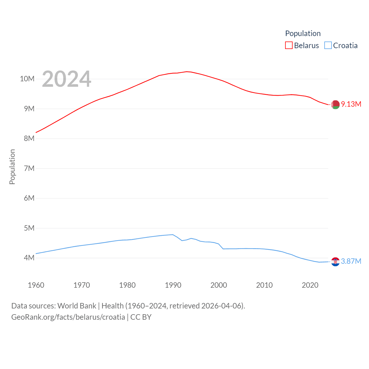 Belarus has a population of 9.13M (ranked 100/197), compared with 3.87M in Croatia (ranked 129/197). Belarus' land area is 78,372 sq mi versus 21,606 sq mi for Croatia (ranked 83rd vs. 123rd).