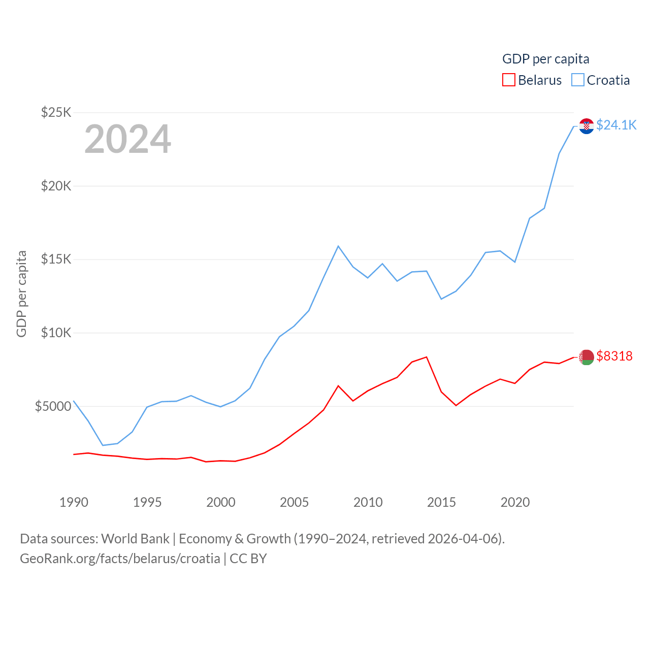 By GDP, Belarus ranks 83/197 ($76B) and Croatia ranks 75/197 ($93B). By GDP per capita, Belarus ranks 92/197 ($8,318), while Croatia ranks 50/197 ($24,050).