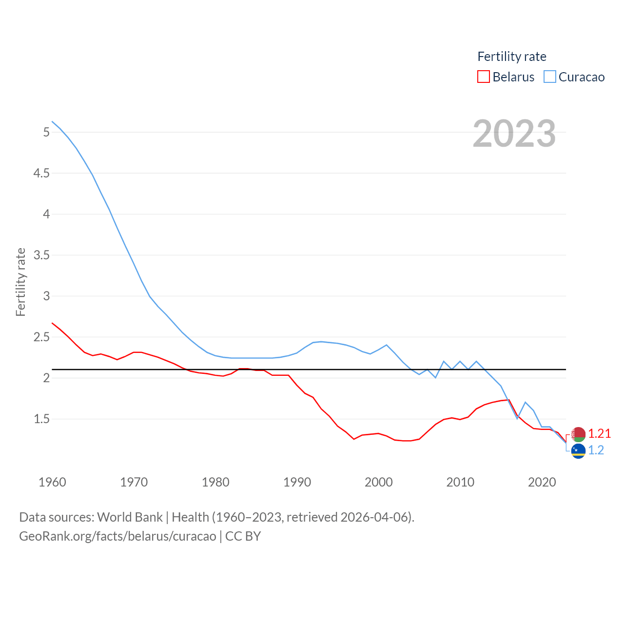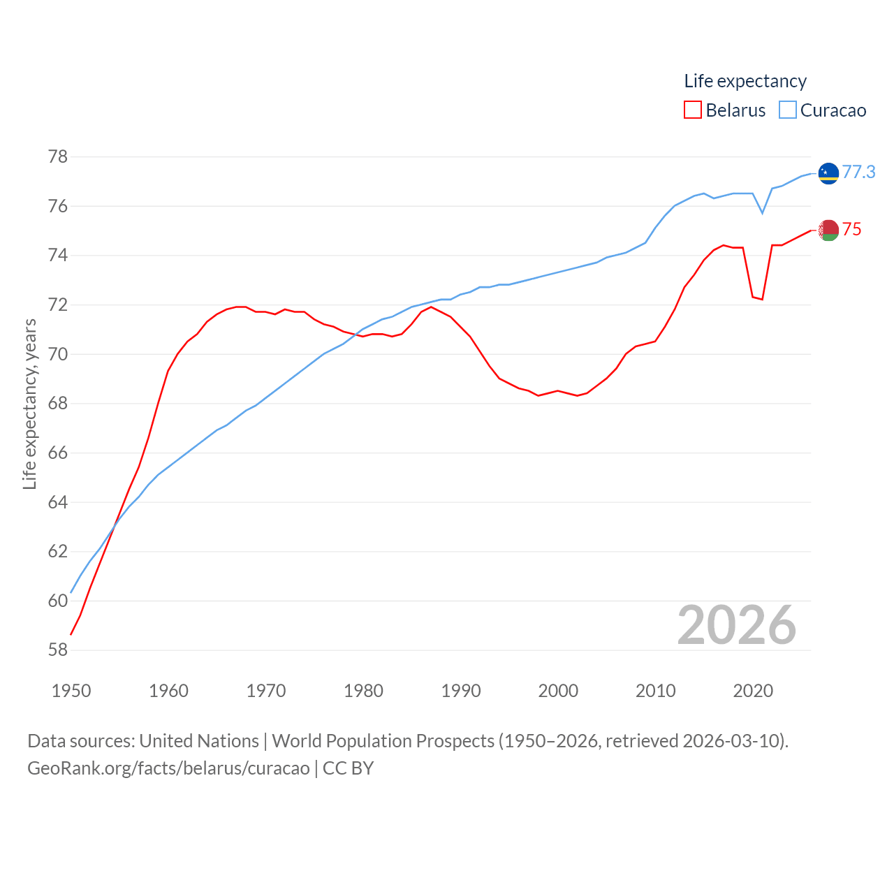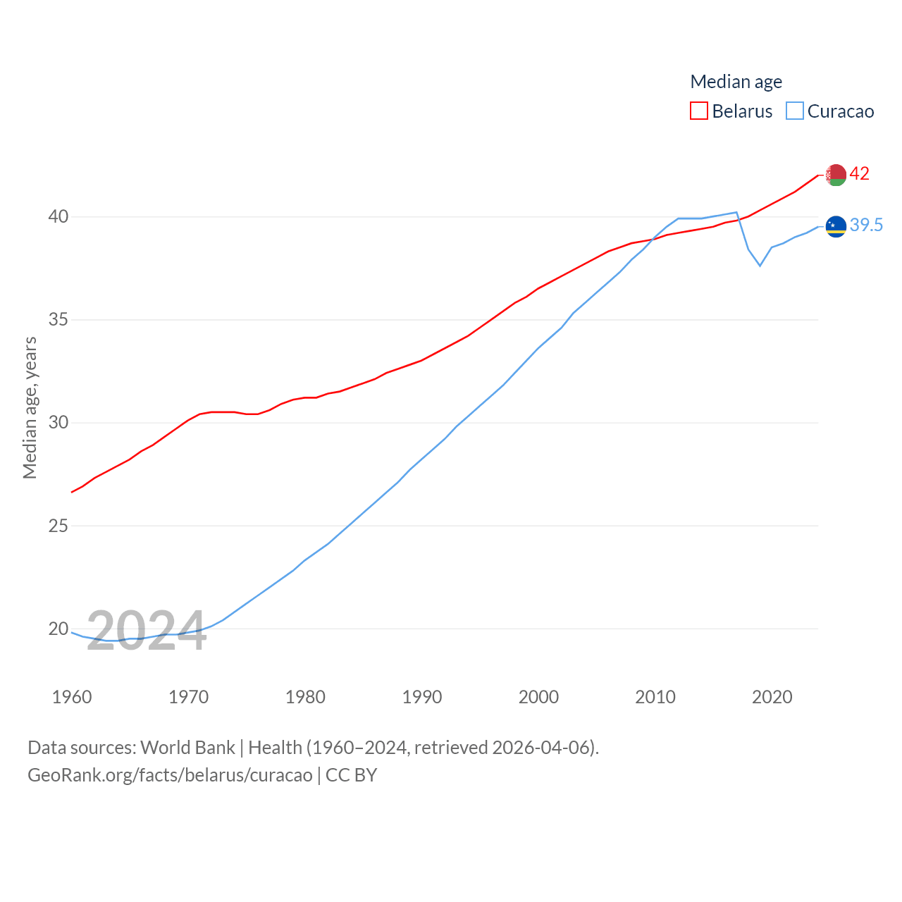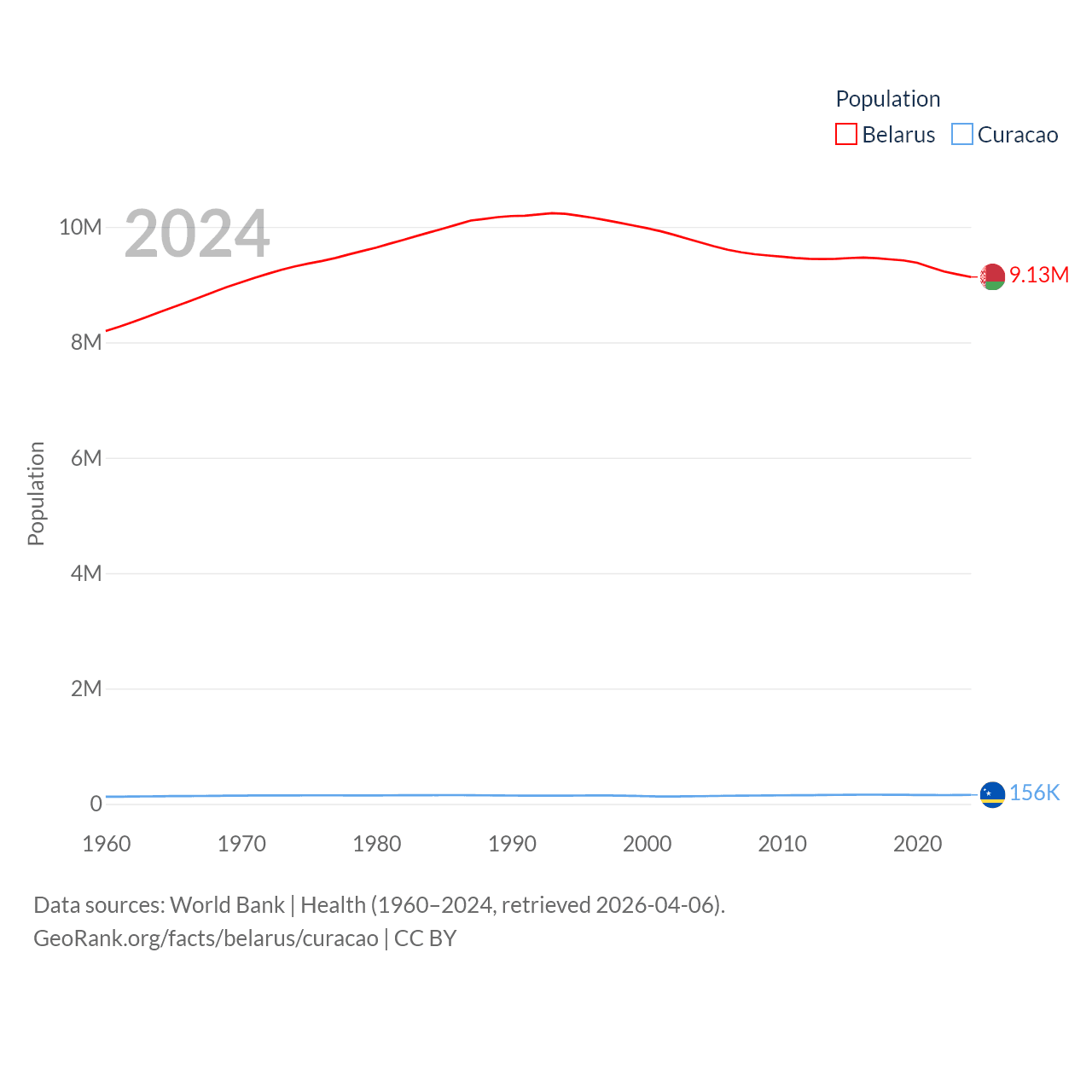 Belarus has a population of 9.13M (ranked 100/197), compared with 156K in Curacao (ranked 179/197). Belarus' land area is 78,372 sq mi versus 171.4 sq mi for Curacao (ranked 83rd vs. 182nd).