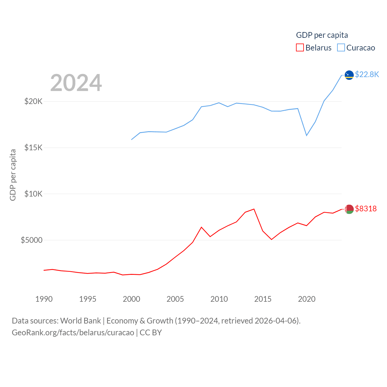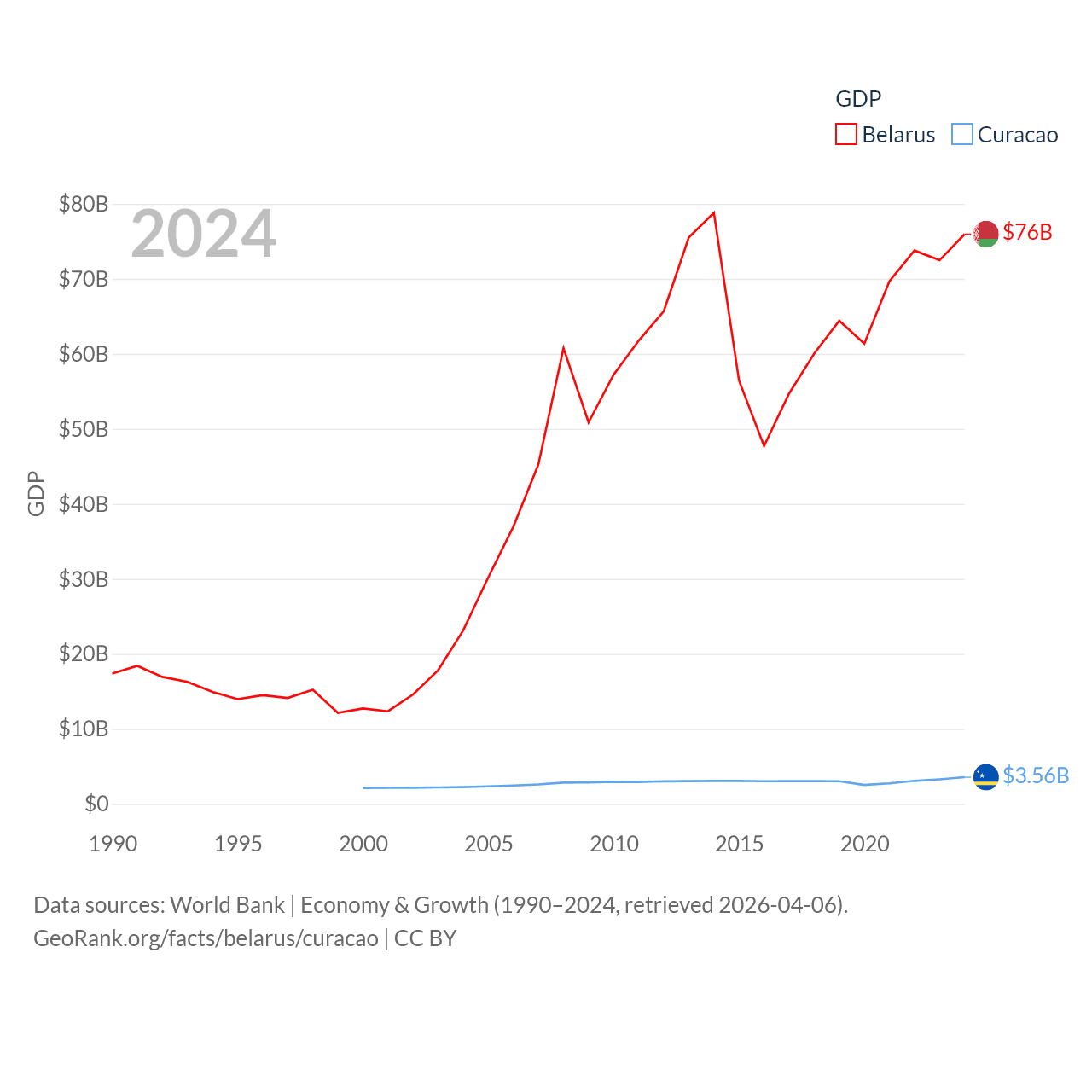 By GDP, Belarus ranks 83/197 ($76B) and Curacao ranks 167/197 ($3.56B). By GDP per capita, Belarus ranks 92/197 ($8,318), while Curacao ranks 56/197 ($22,833).