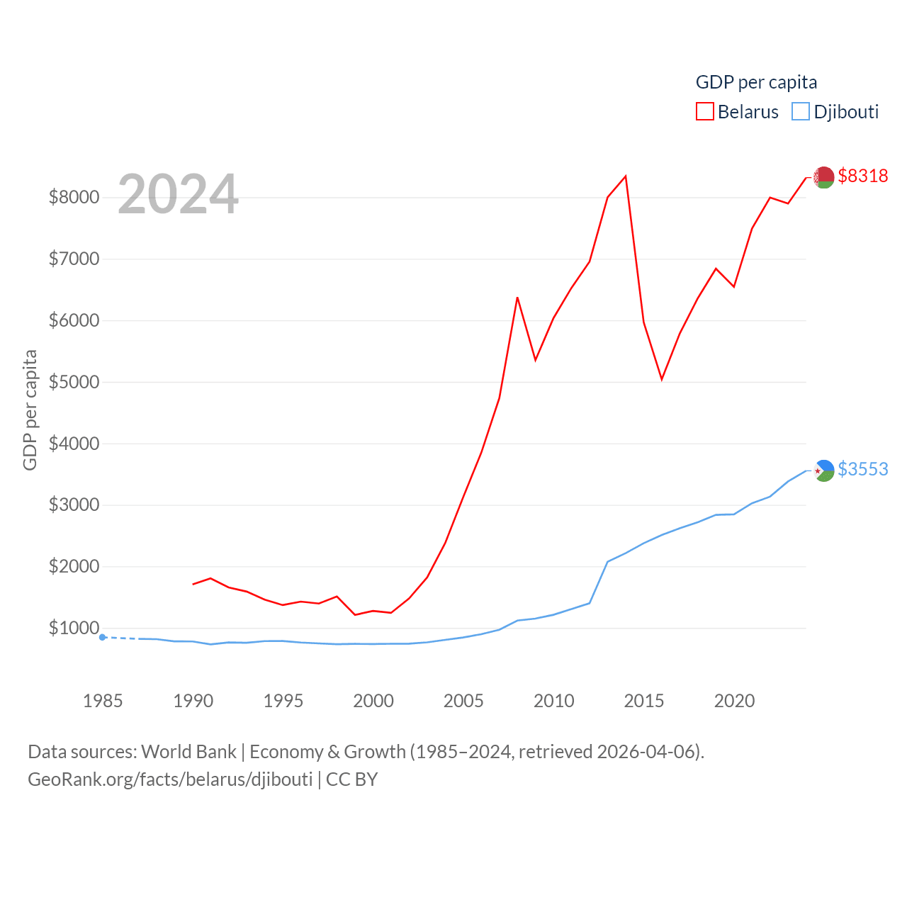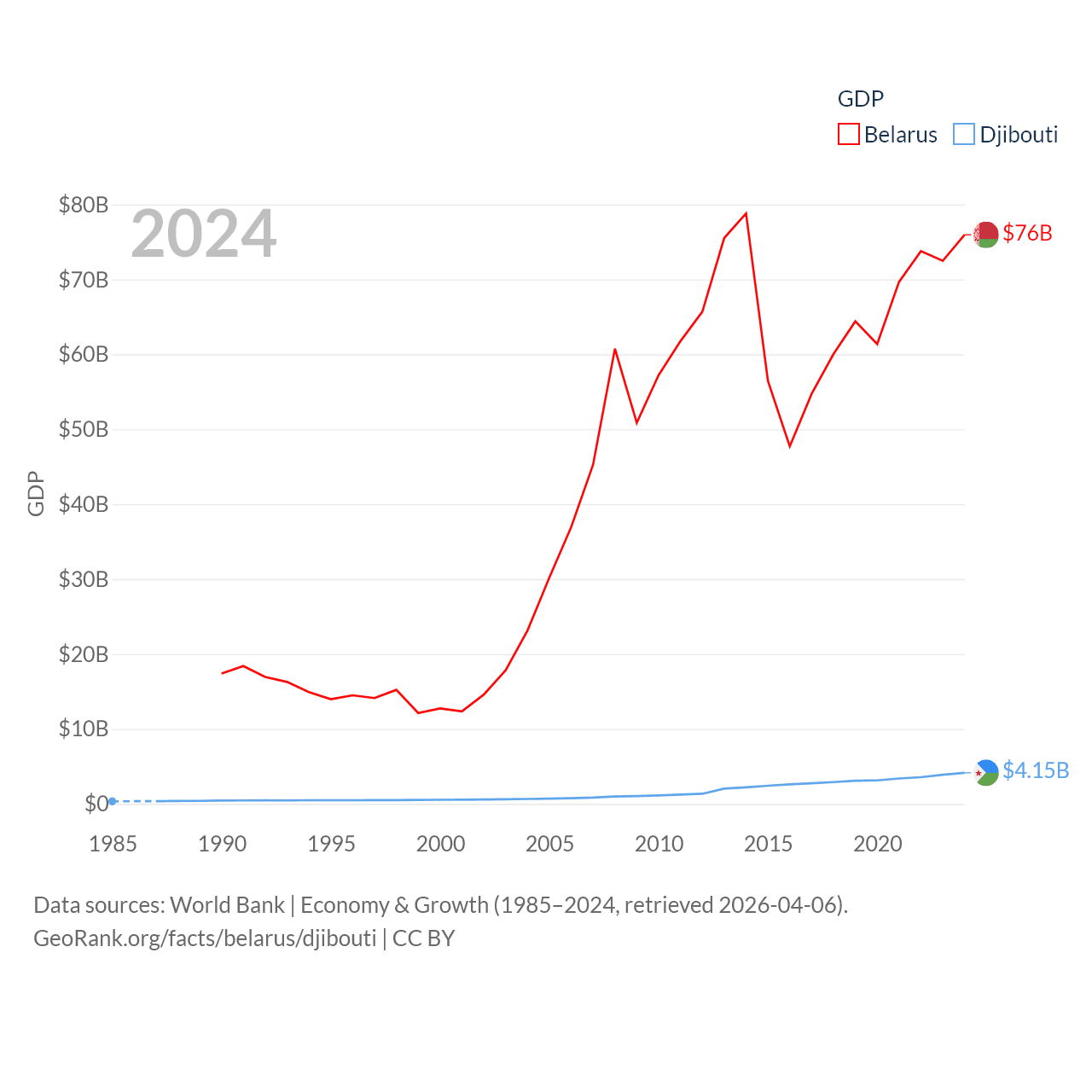By GDP, Belarus ranks 83/197 ($76B) and Djibouti ranks 165/197 ($4.15B). By GDP per capita, Belarus ranks 92/197 ($8,318), while Djibouti ranks 133/197 ($3,553).