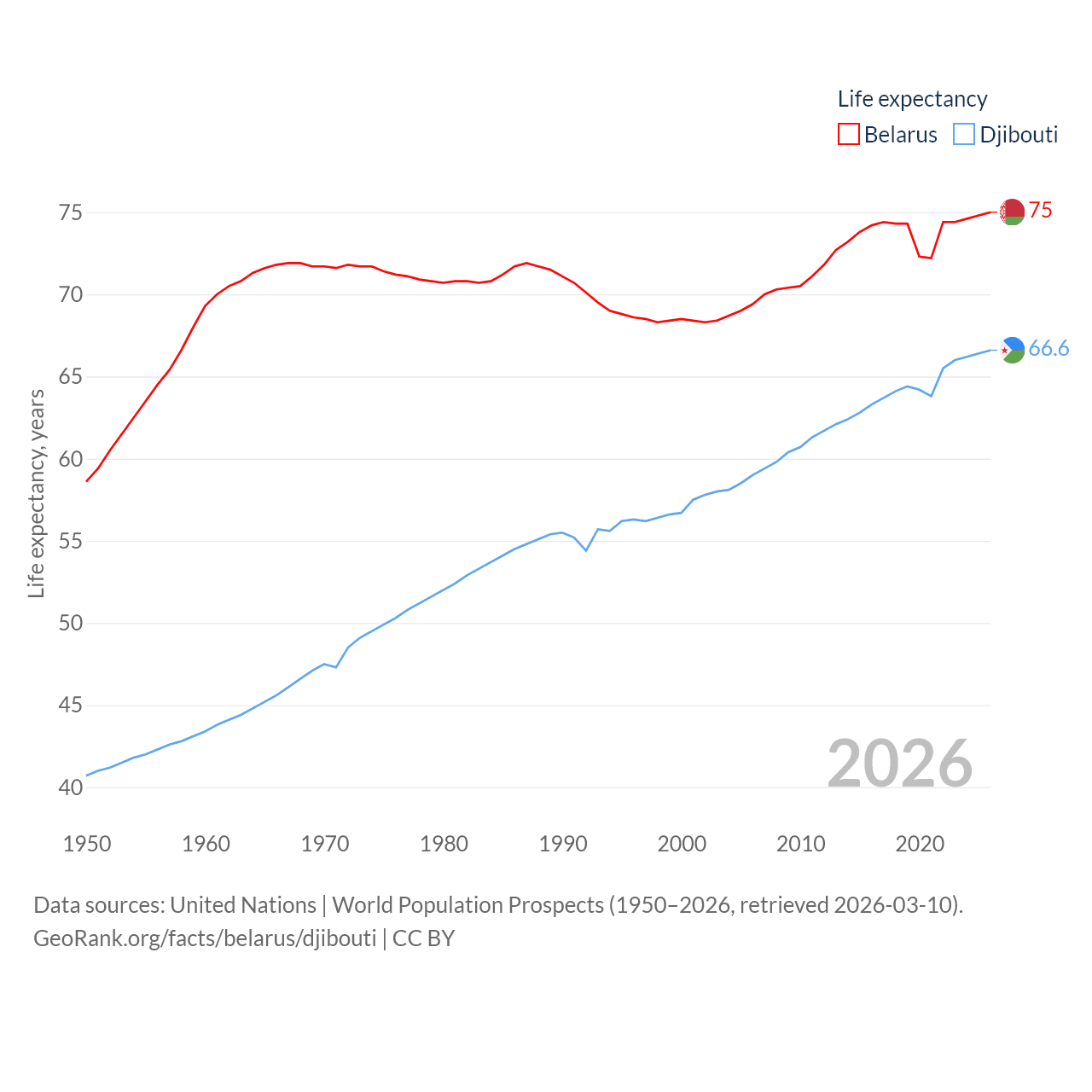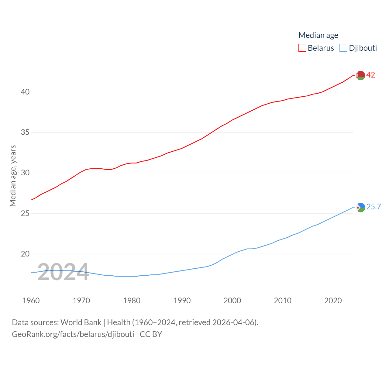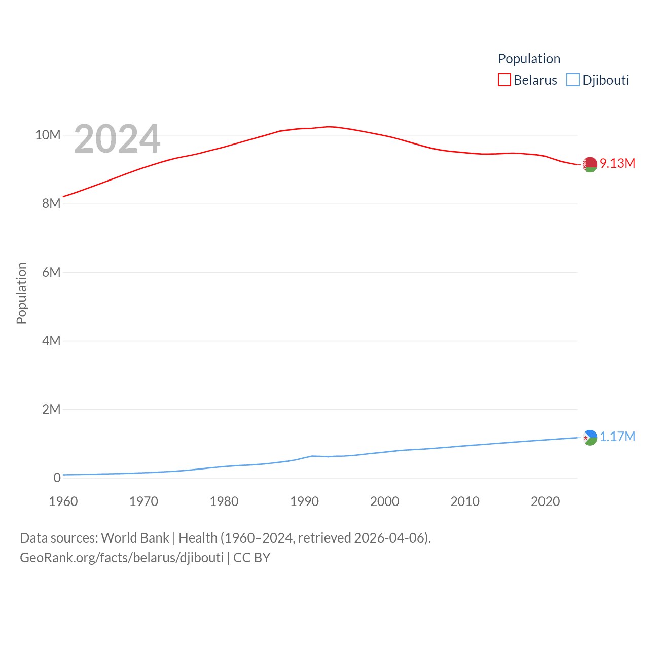 Belarus has a population of 9.13M (ranked 100/197), compared with 1.17M in Djibouti (ranked 158/197). Belarus' land area is 78,372 sq mi versus 8,950 sq mi for Djibouti (ranked 83rd vs. 147th).