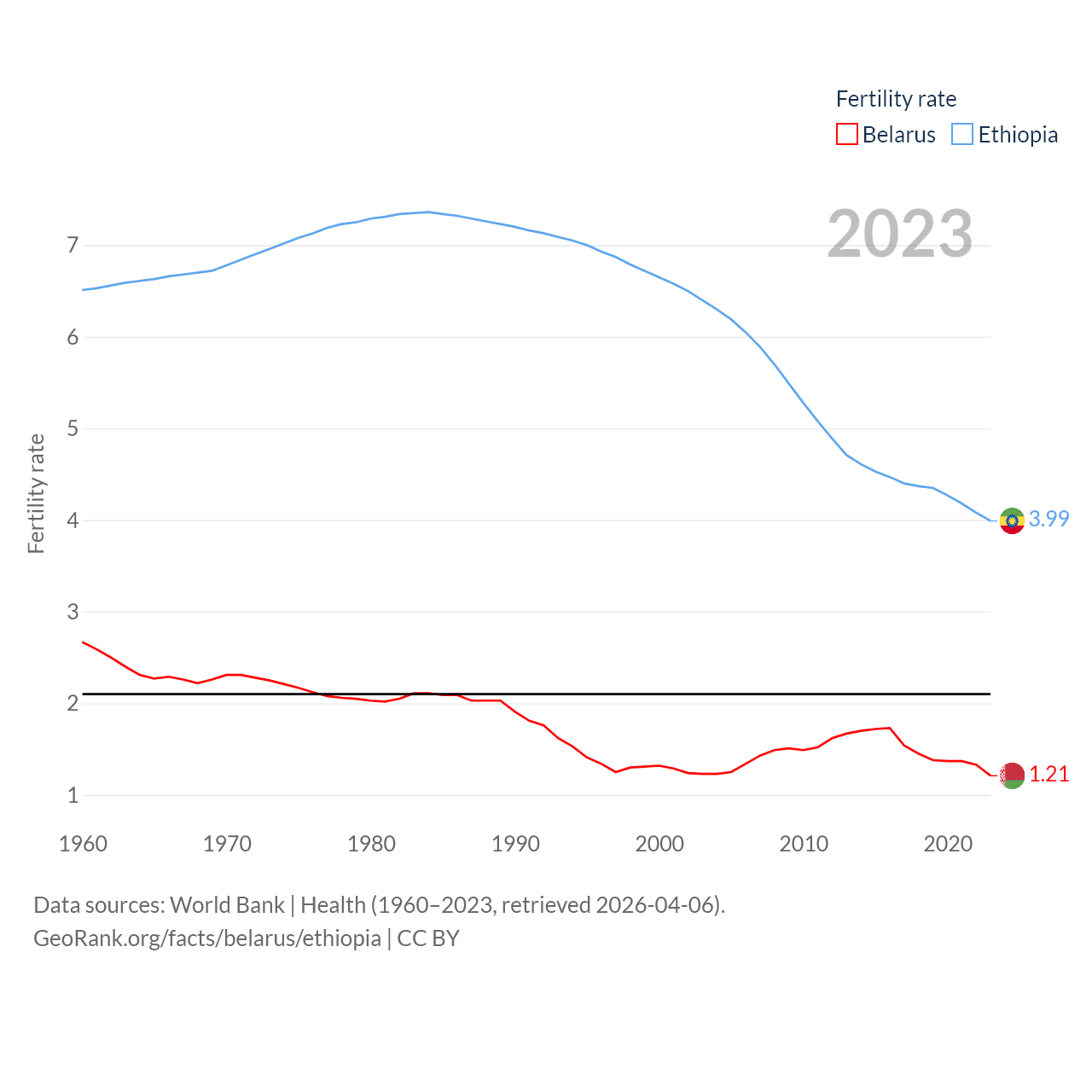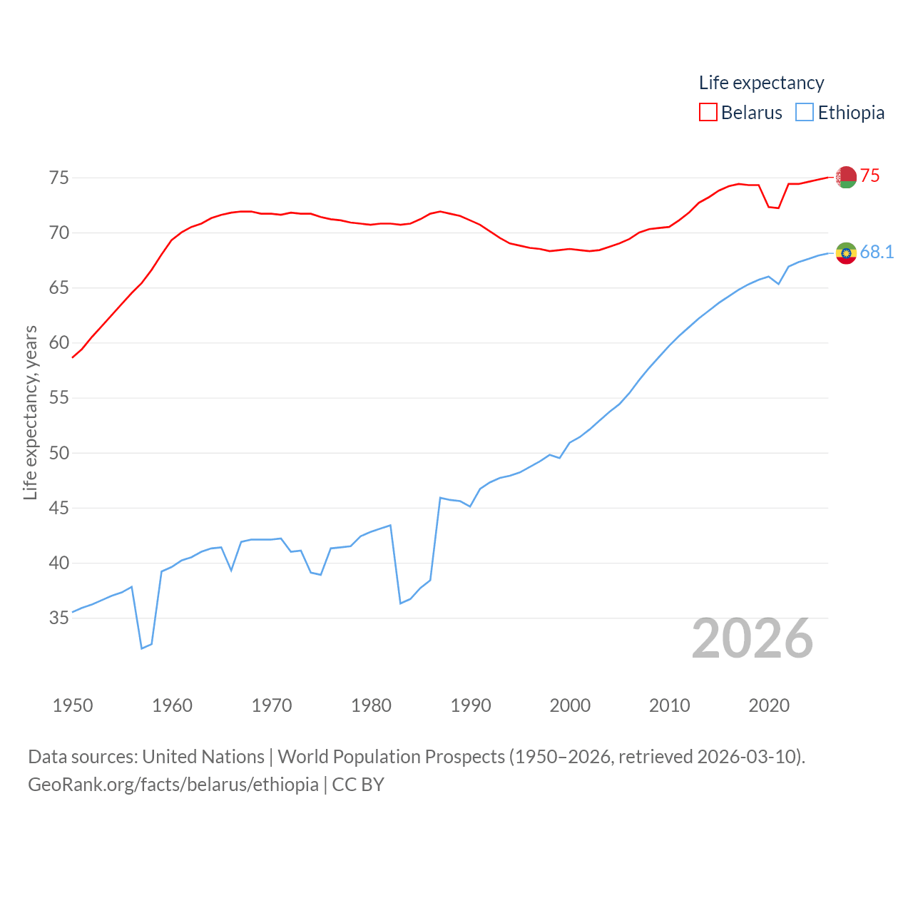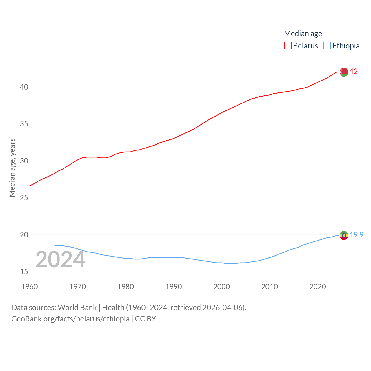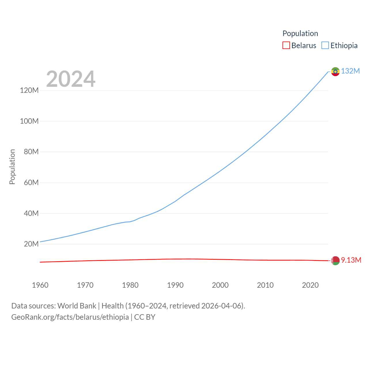 Belarus has a population of 9.13M (ranked 100/197), compared with 132M in Ethiopia (ranked 10/197). Belarus' land area is 78,372 sq mi versus 435,716 sq mi for Ethiopia (ranked 83rd vs. 25th).